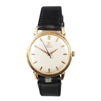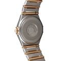 with quartz movement, gold dial, gold baton numerals, gold hands, gold bezel with black Roman numerals, and an Omega Constellation caseback, case diameter approx. 25mm