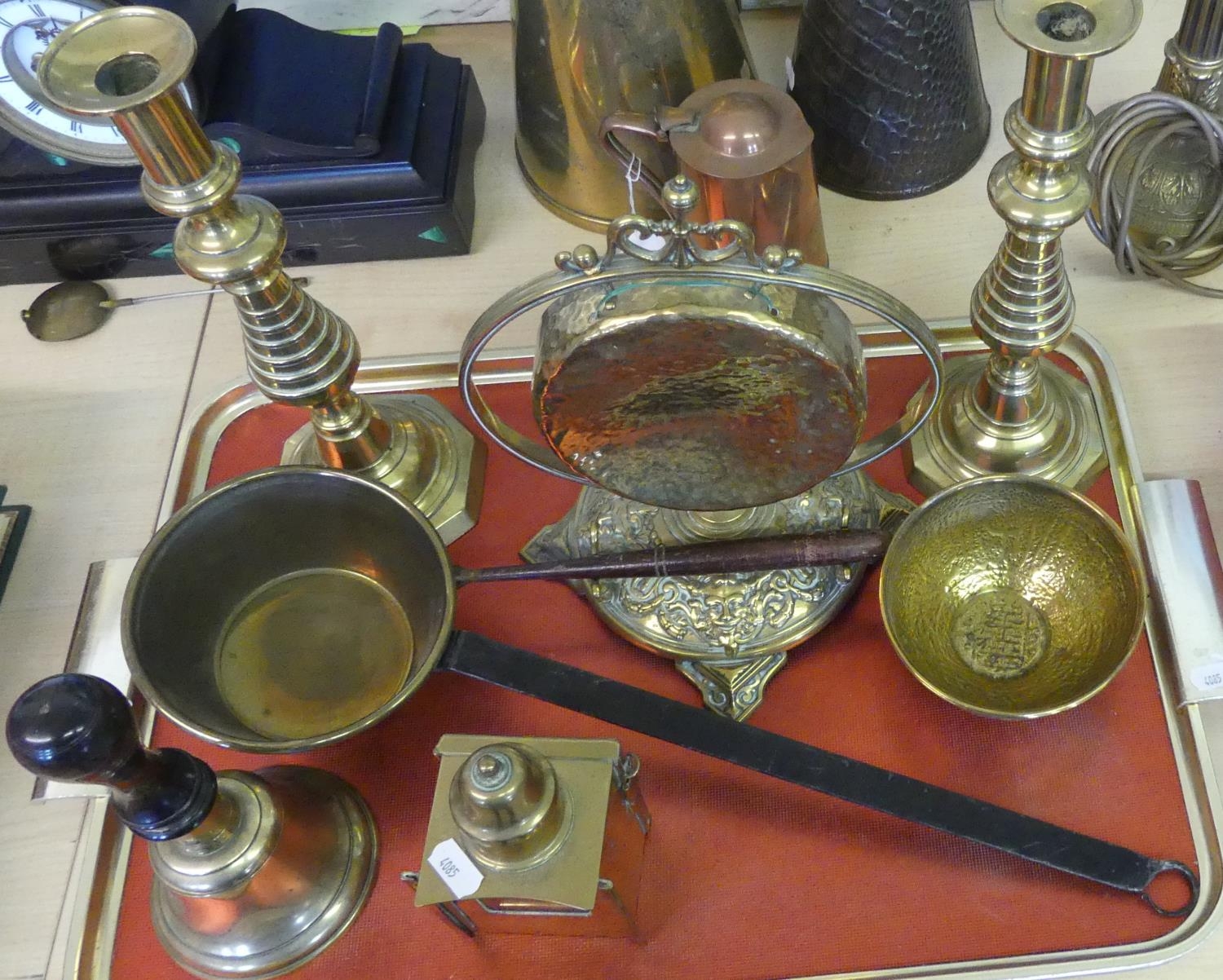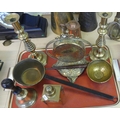 Tray Lot - Brass Gong, Candlesticks, Bell etc.
