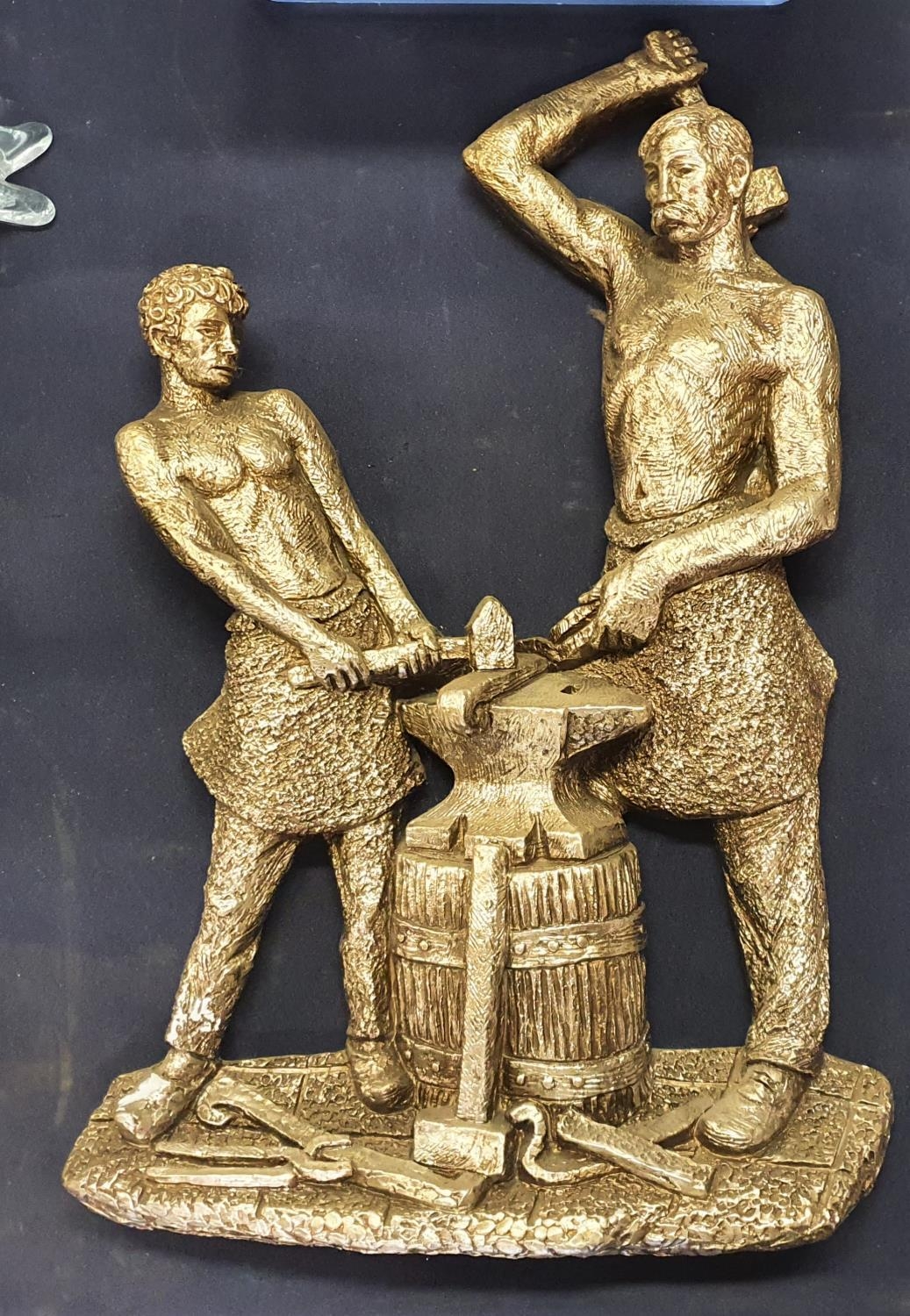 Metallic finished plaster work depicting blacksmiths at work ,60 x 48 cm
