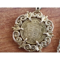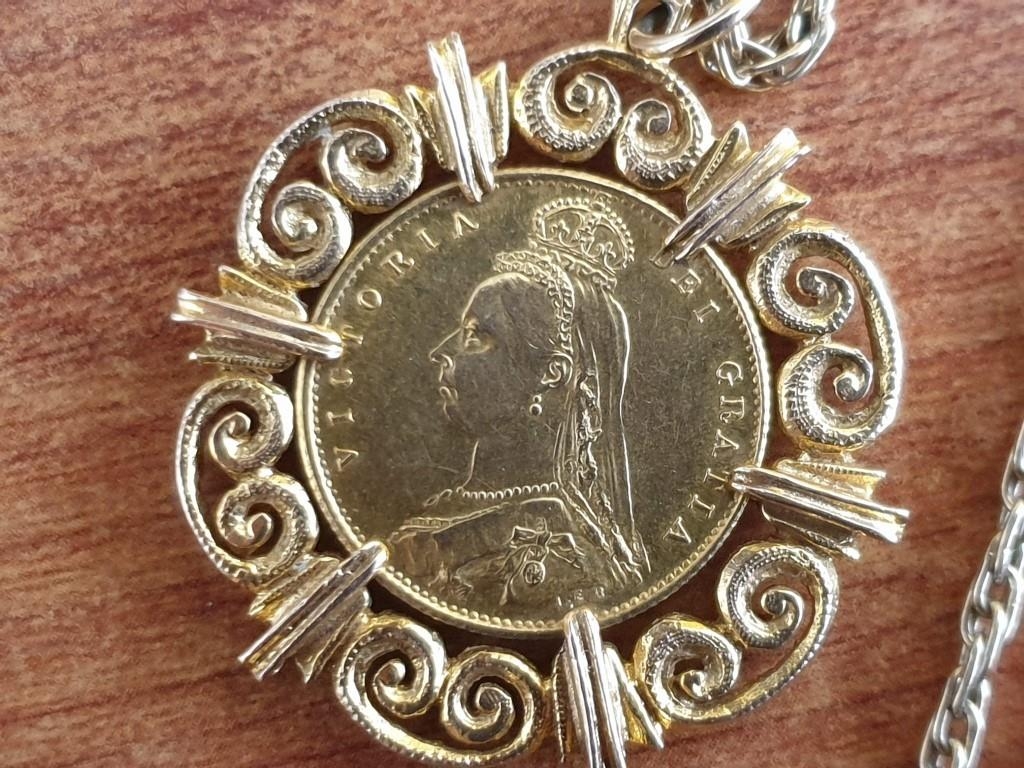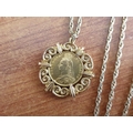 1887 Half Sovereign (Victoria Young Head Shield Back - 3.99g, 22ct Gold, Last Year in Series with Lower Vintage of 872,000) Set in (Believed to be and Tested As) 9ct Gold Decorative Pendant Mounting on 9ct Gold Link Chain Necklace, Approx. 76cm (14.3g), (Total Weight 18.3g)