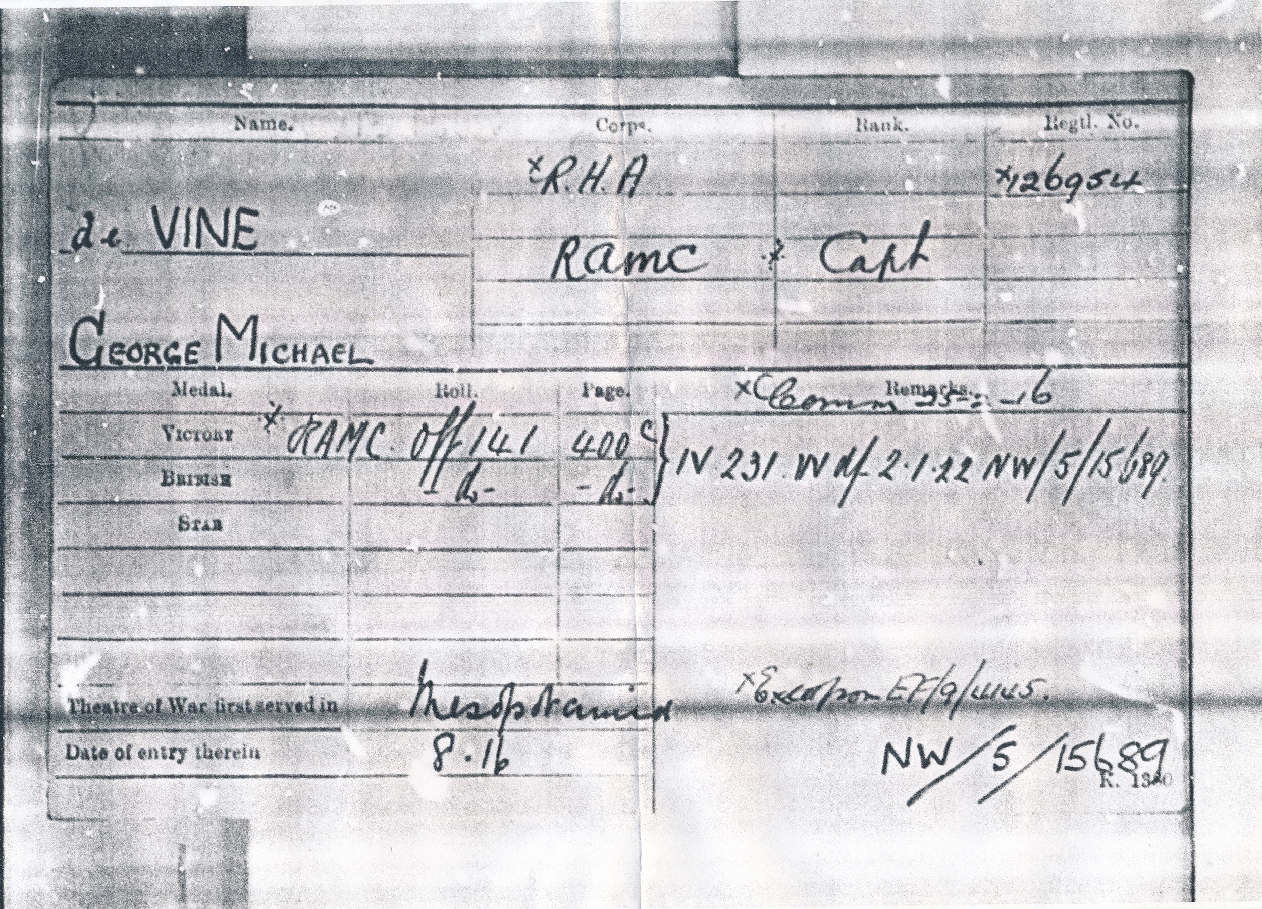 WW1 British War Medal to Capt G.M. De Vine nearly extremely fine. George Michael De Vine enlisted in RHA while living in Castlederg Co Tyrone 2/2/16, 22 days later he was commissioned in RAMC. His first theatre of war was Mesopotamia Aug 1916. With copied MIC and page of ORs service paper.
