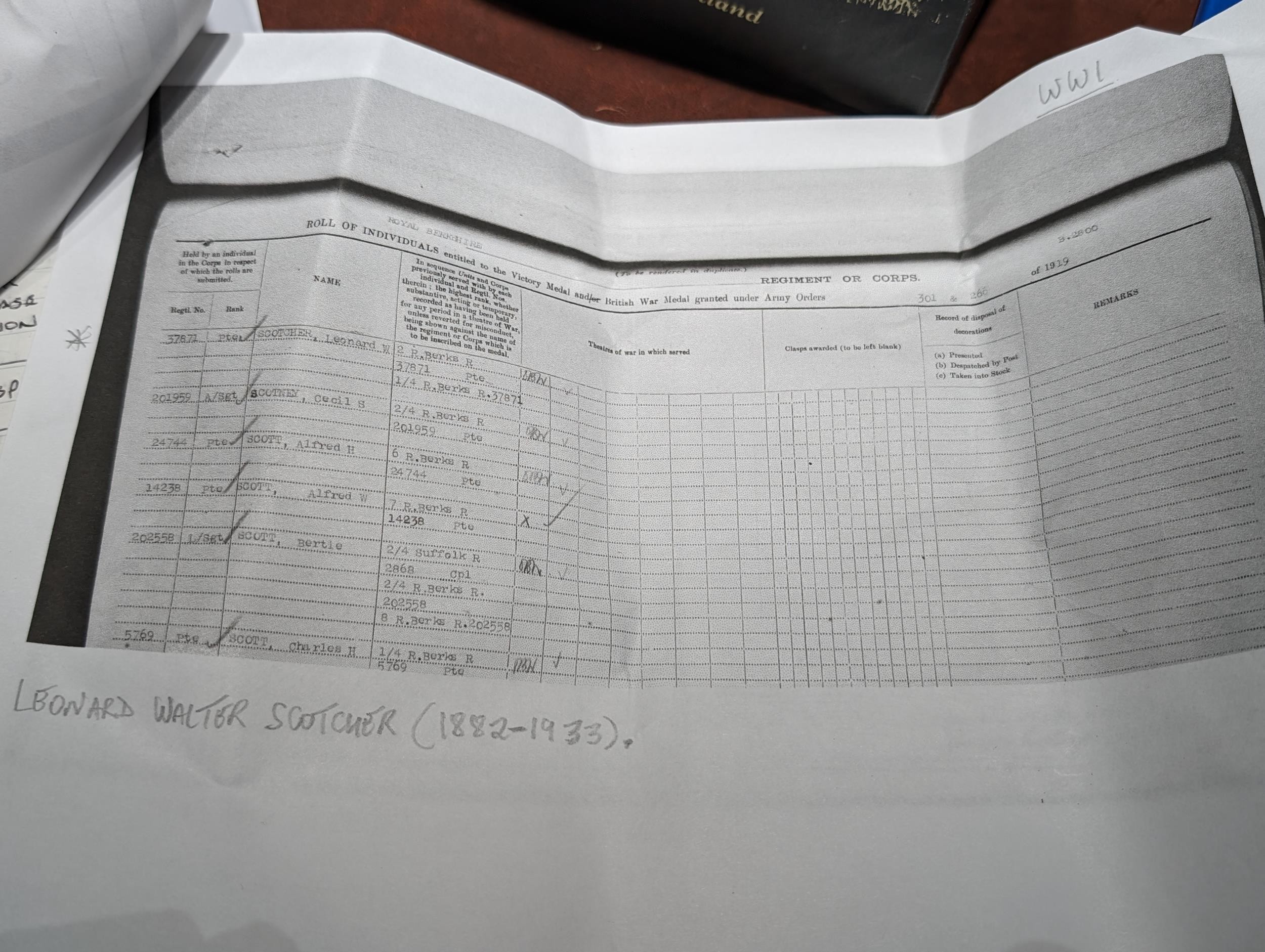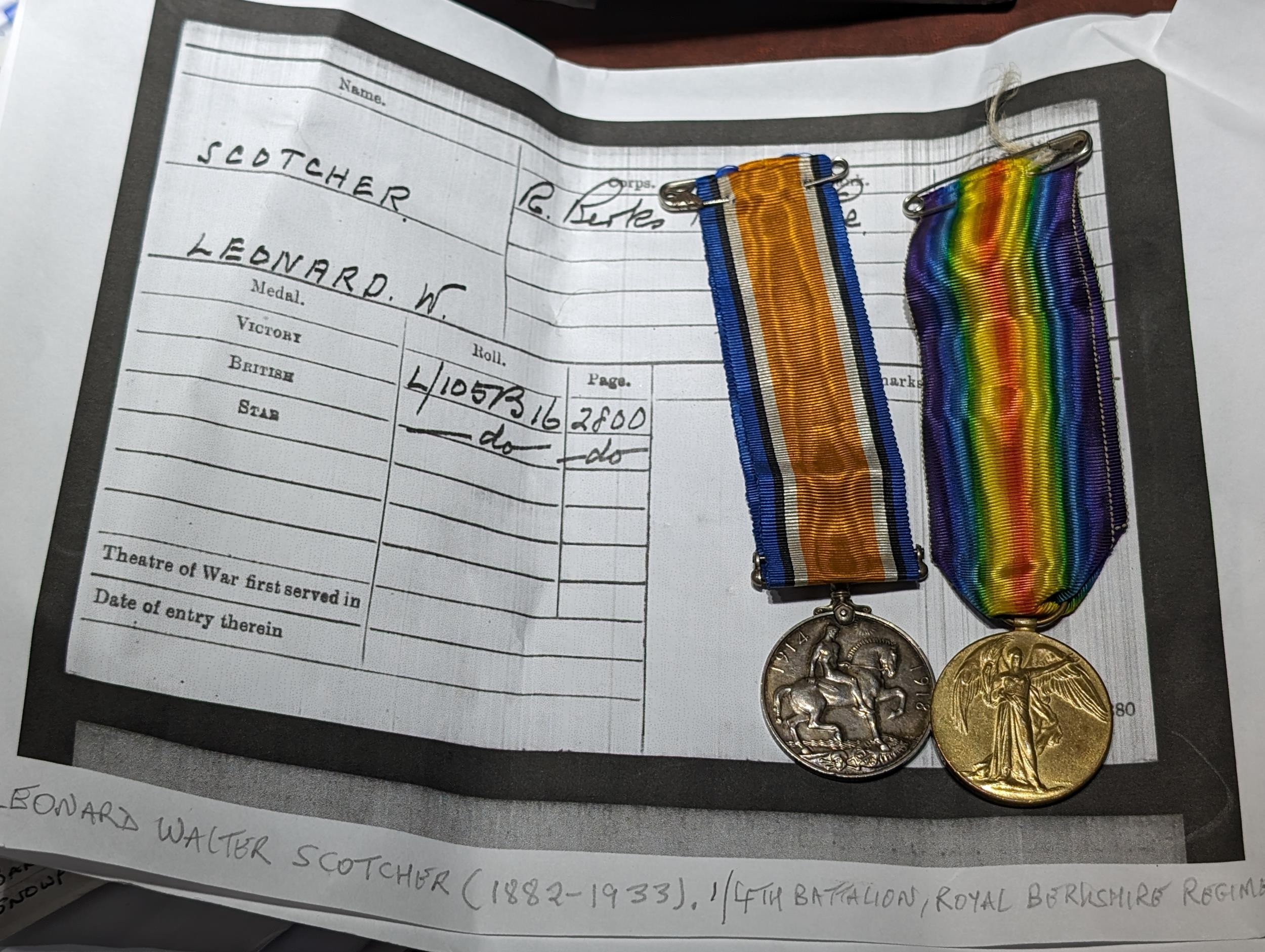 2 x WWI medals with ribbons, engraved and relating to Leonard Scotcher - 4th battalion Royal Berkshire Regiment with some paperwork