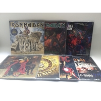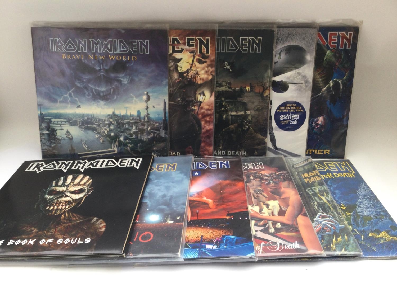 Two bags containing 11 Iron Maiden LPs mainly pressed on 180g vinyl comprising 'Brave New World', 'The Book Of Souls', 'Flight 666' and others.