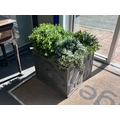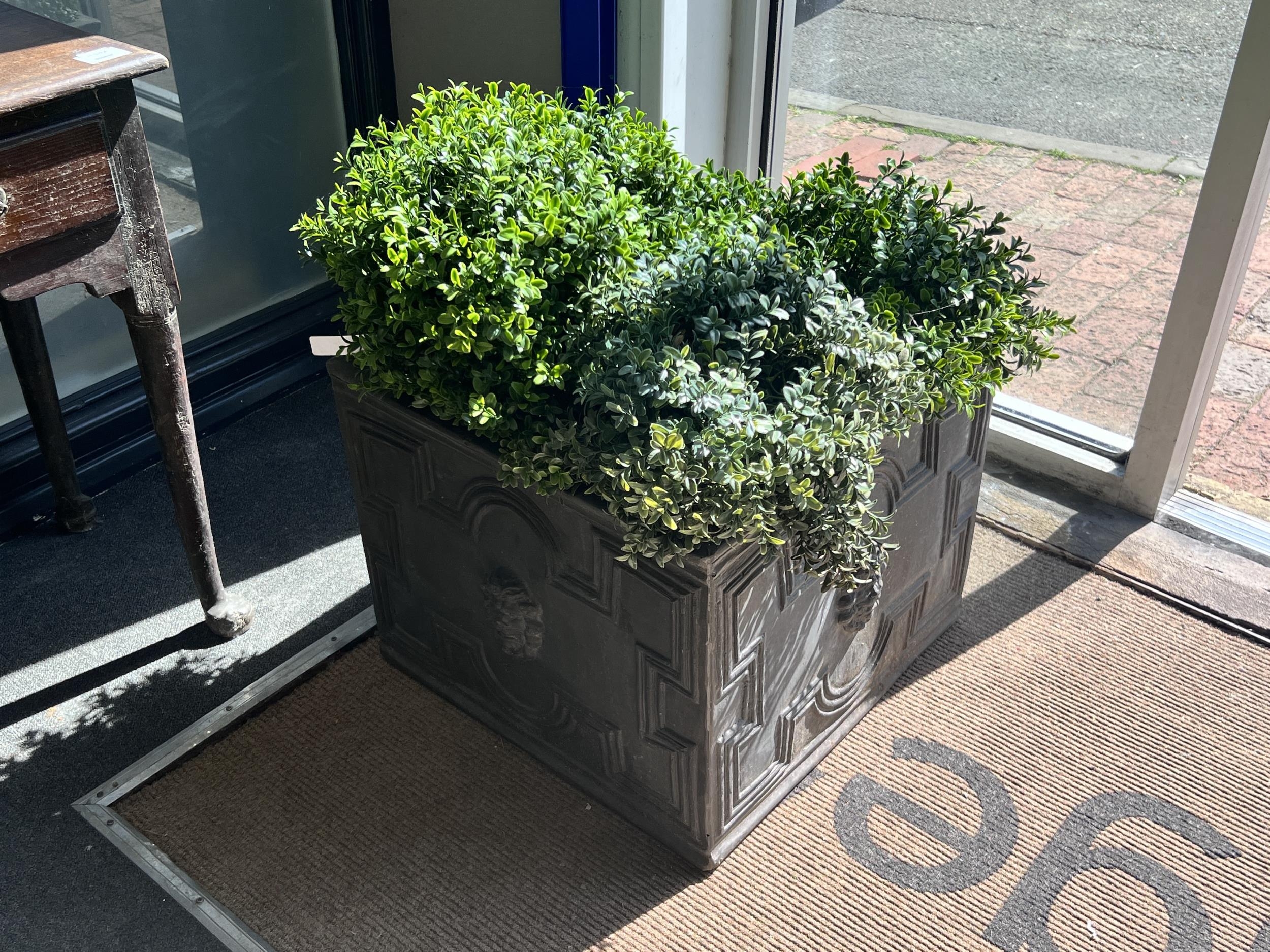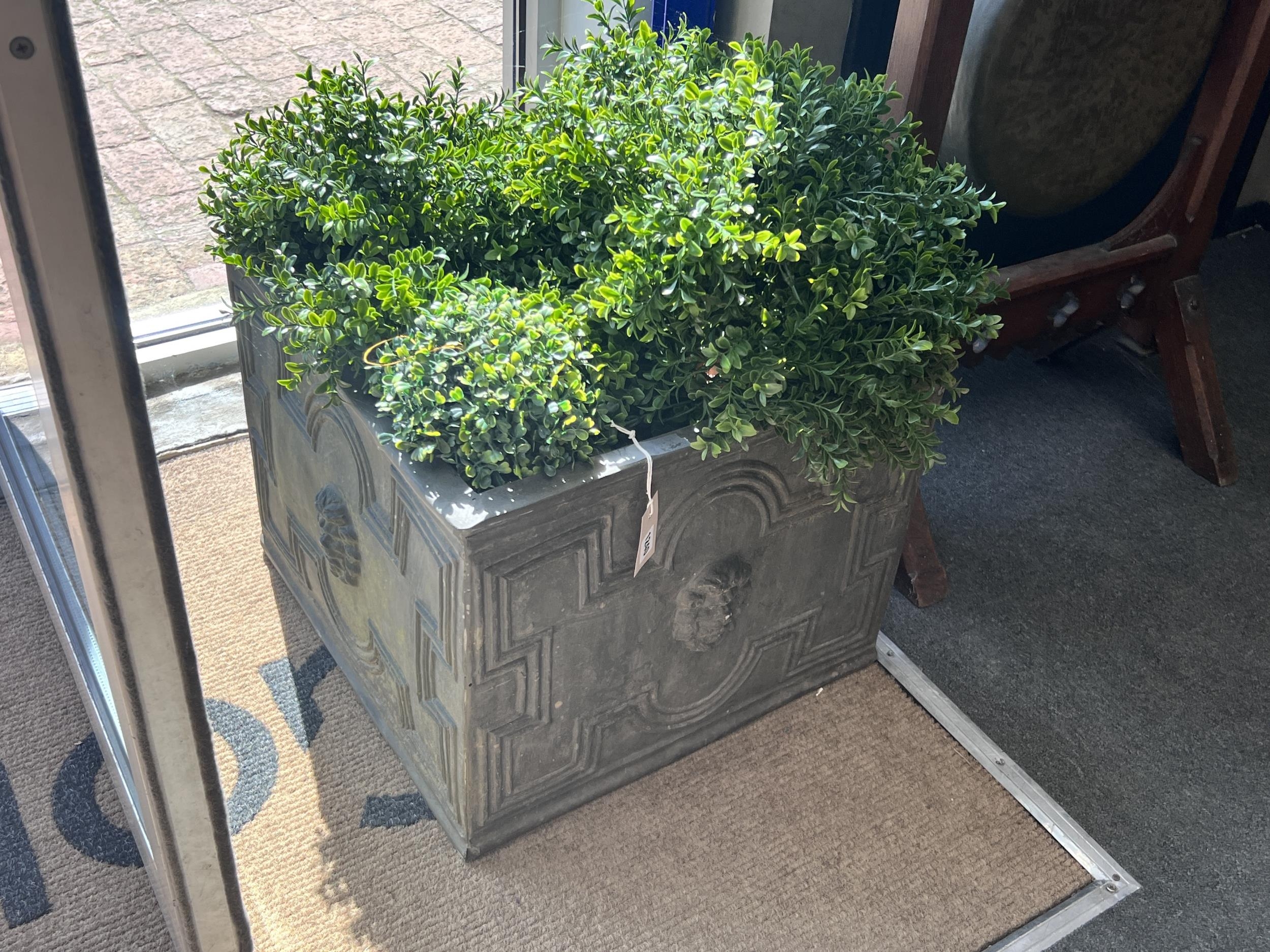 A pair of square faux lead square planters with faux box balls, width 50cm, height 40cm