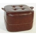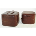 A pair of vintage 20th century leatherette pouffe footstools, one with tufted button top and both having polychrome braid to edge. Measures approx: 30x40x40cm