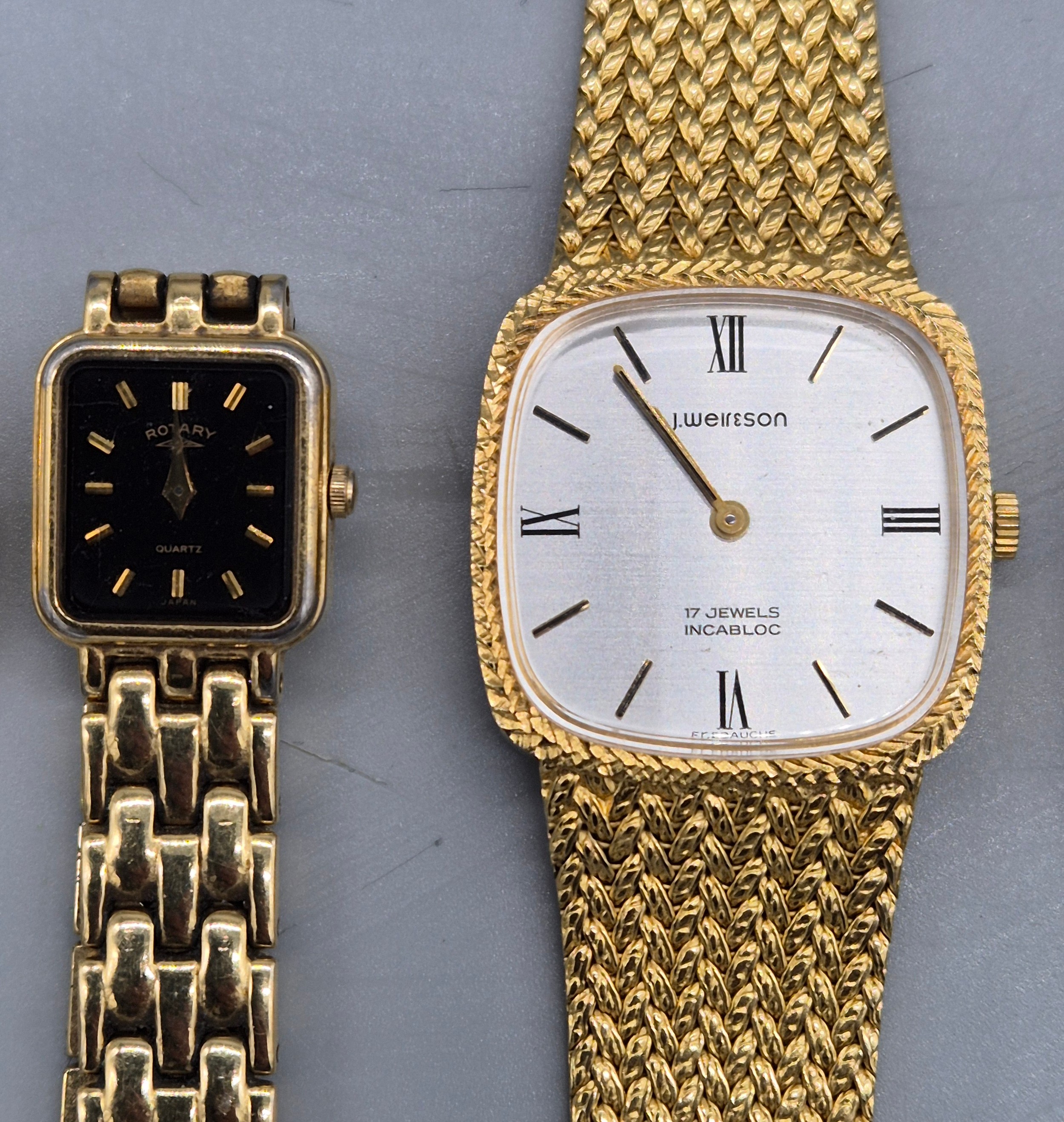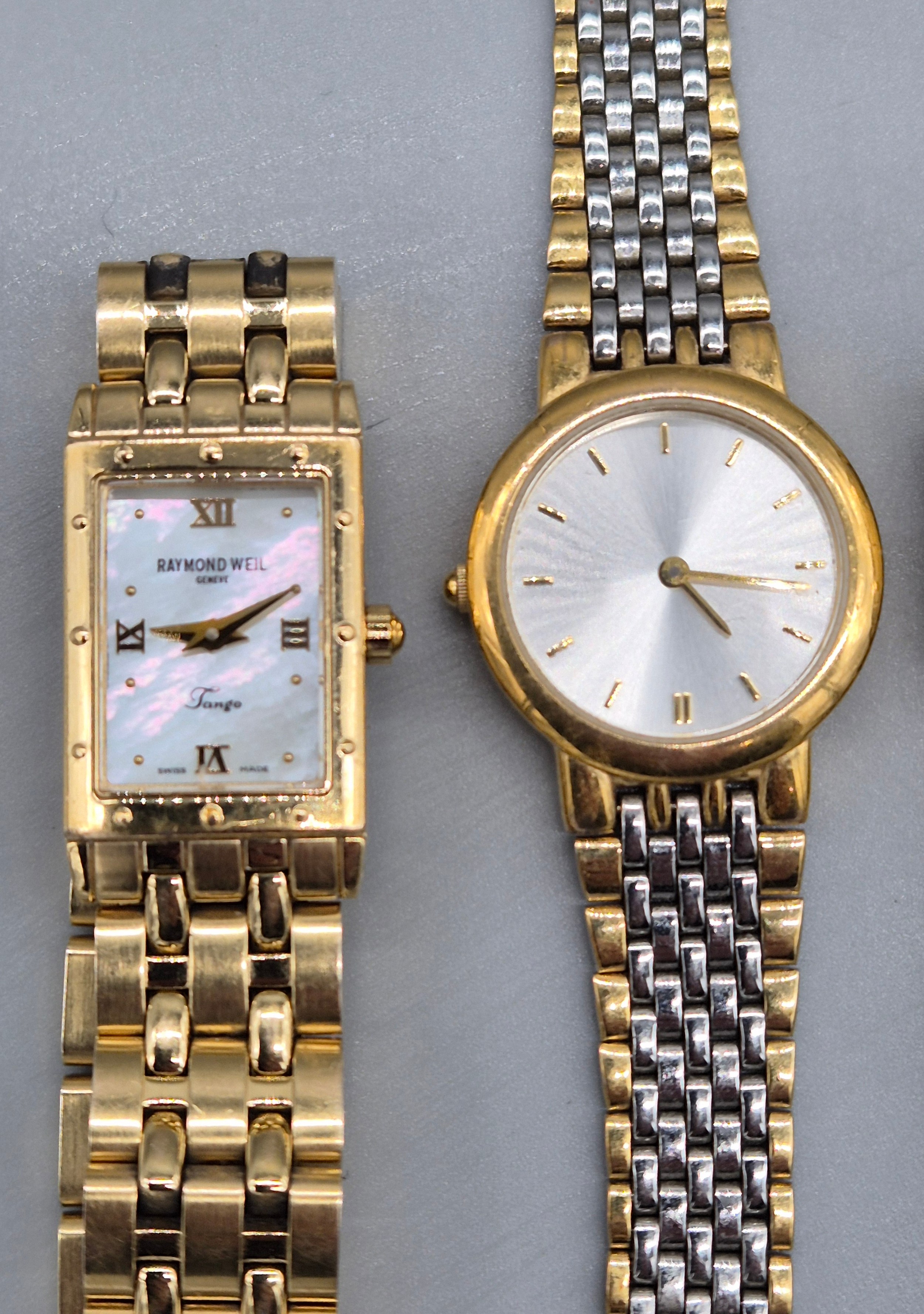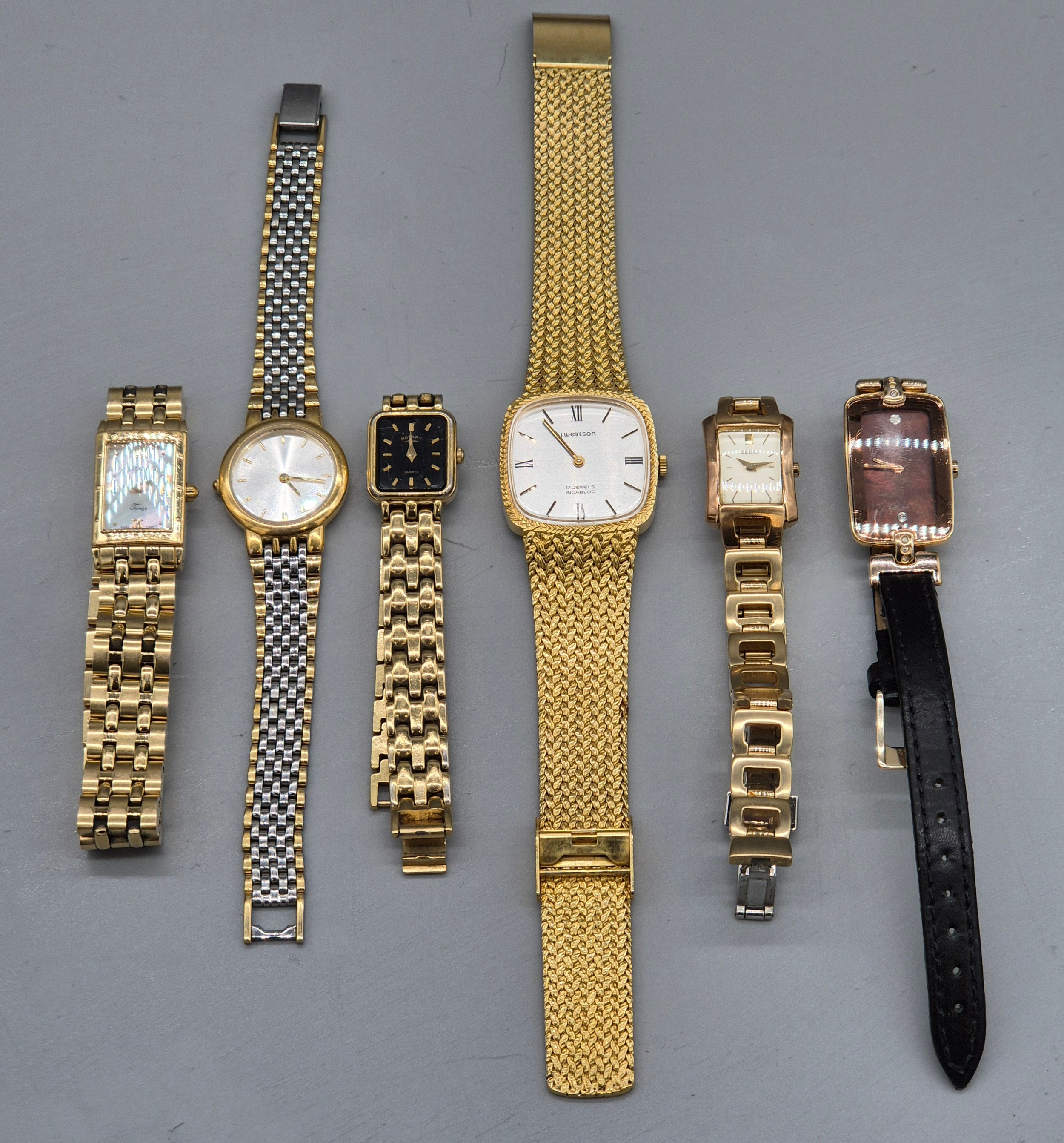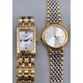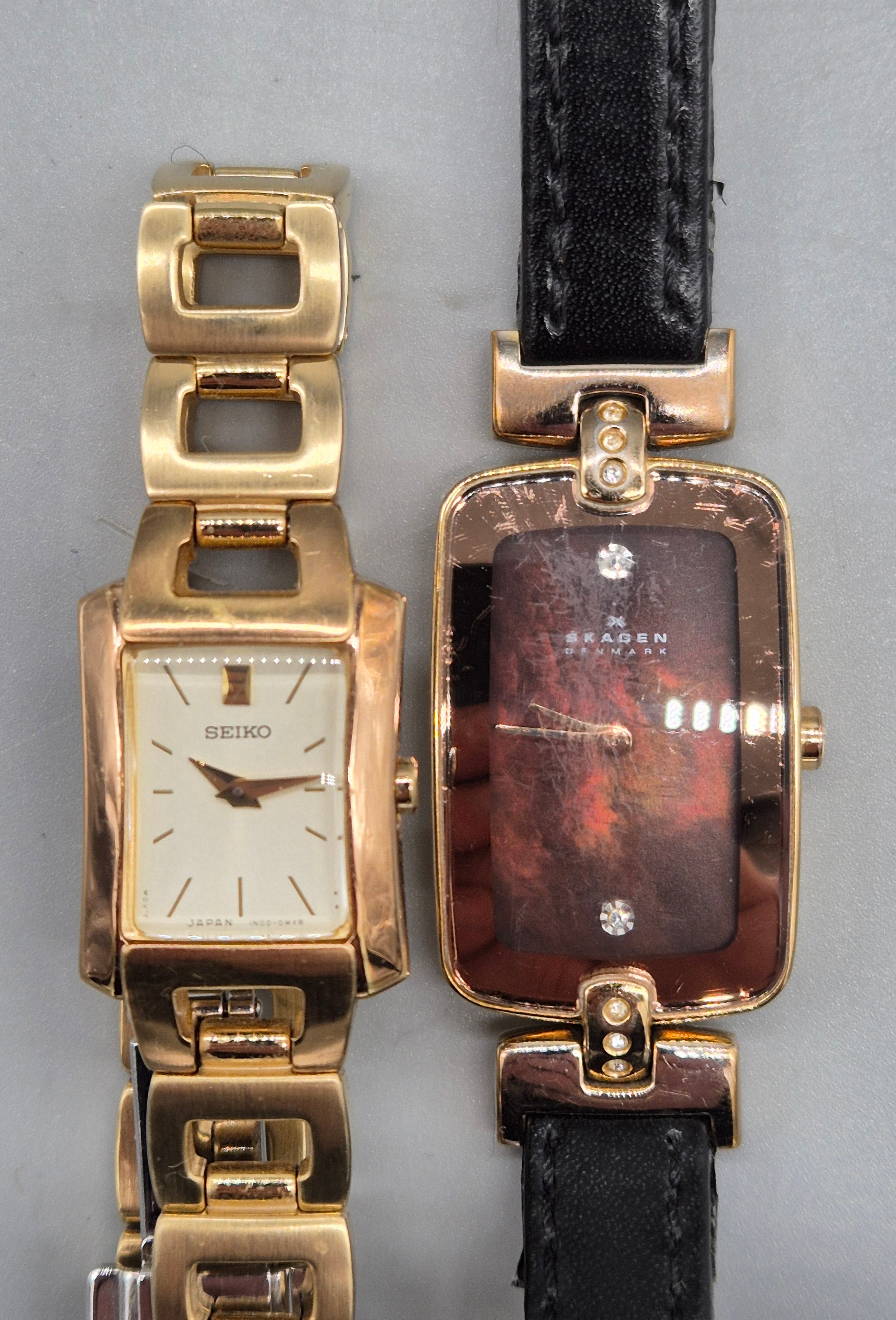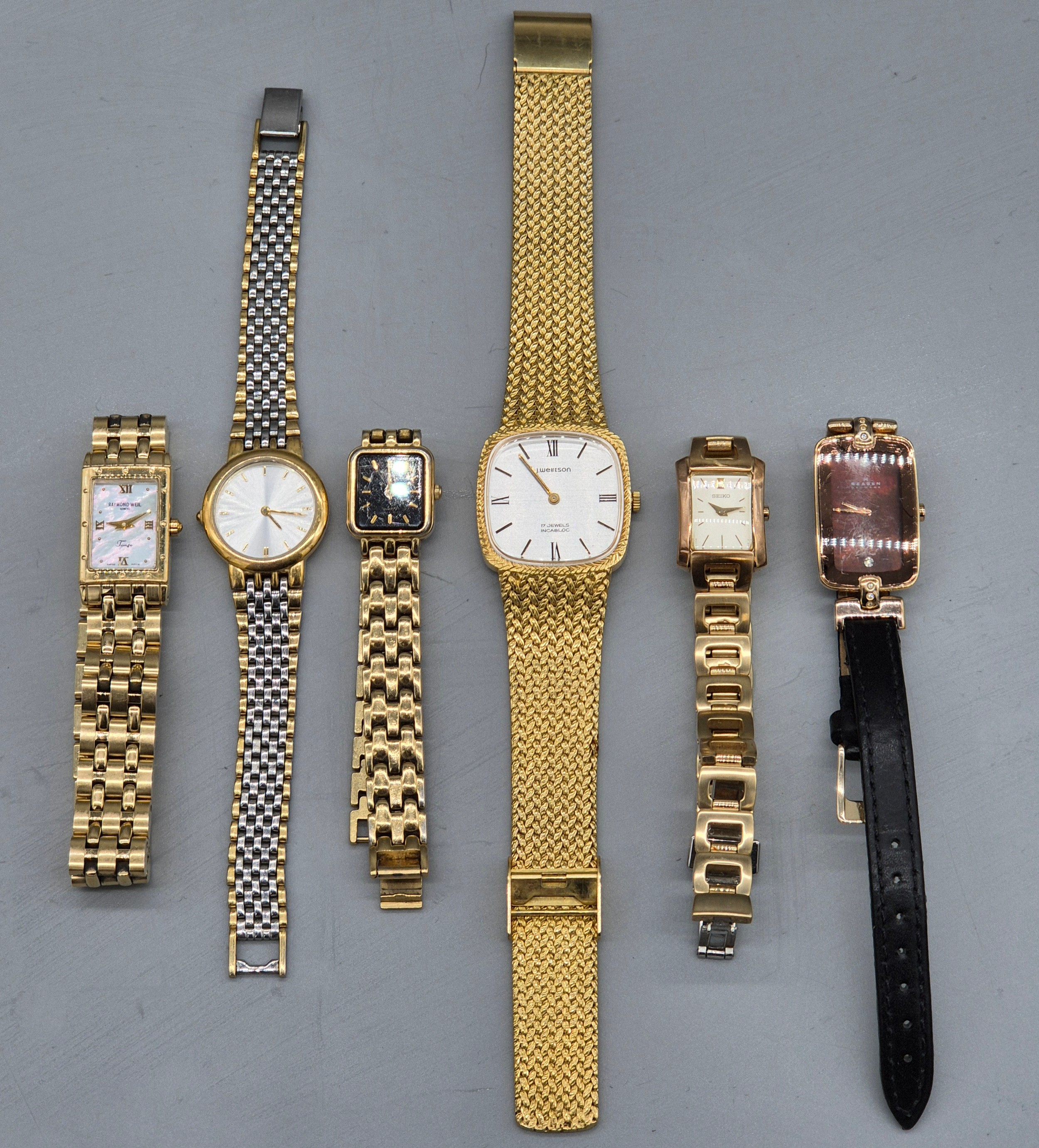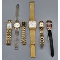 A Collection of vintage ladies watches; Raymond Weil Tango 5970 gold plated watch. Skagen Denmark H01SRLD Watch. Seiko quartz watch. Rotary Quartz watch and two others.