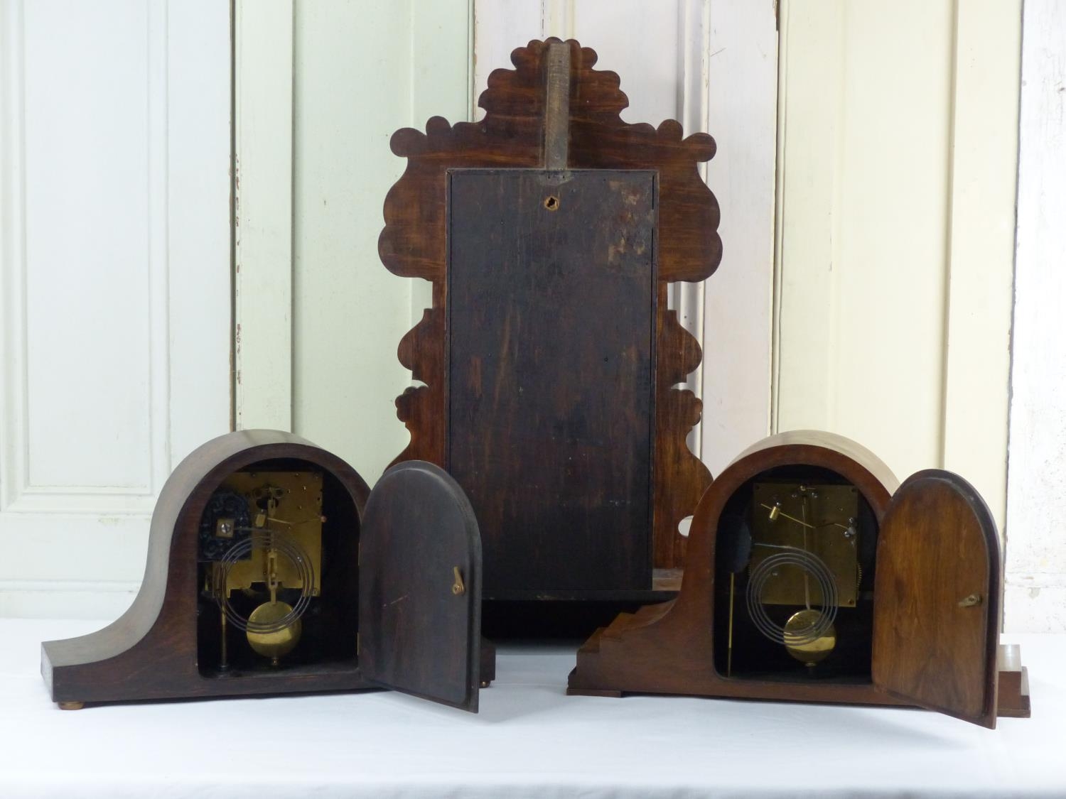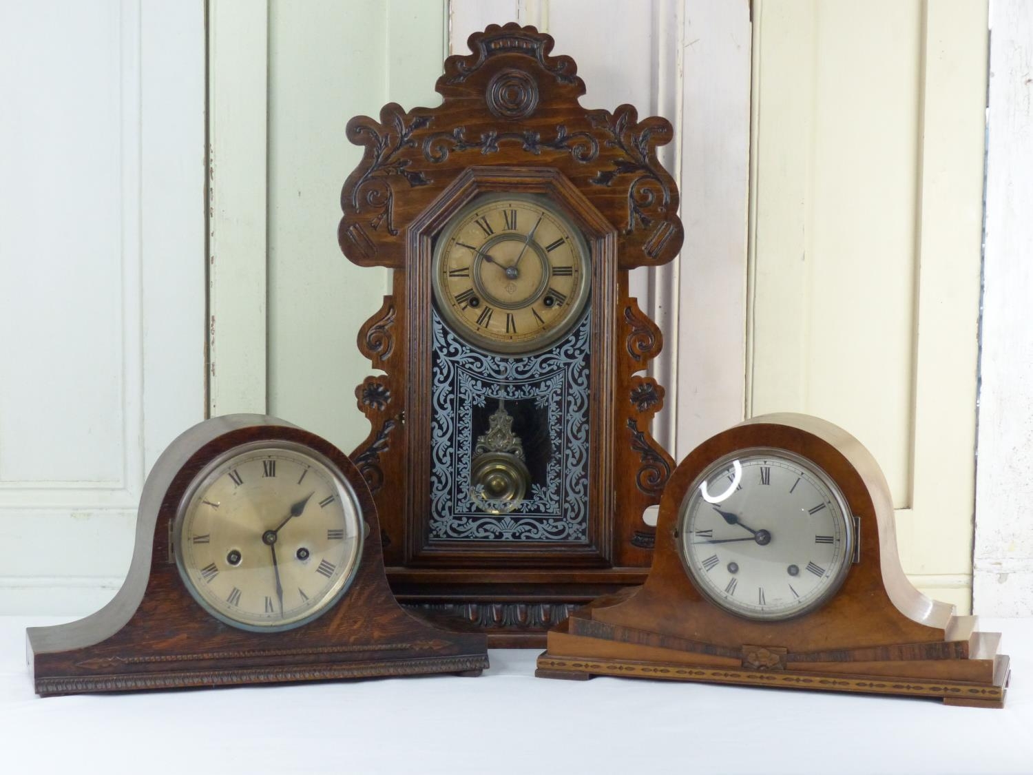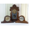 An antique Ginger Bread clock, produced by The Ansonia Clock Co. New York U.S.A, and two vintage Napoleon hat mantle clocks.