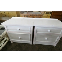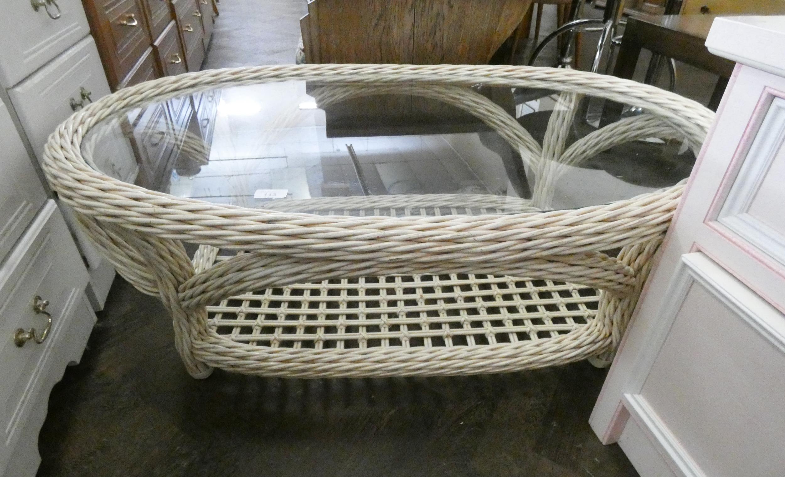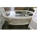 An oval two tier white cane coffee table with glass top