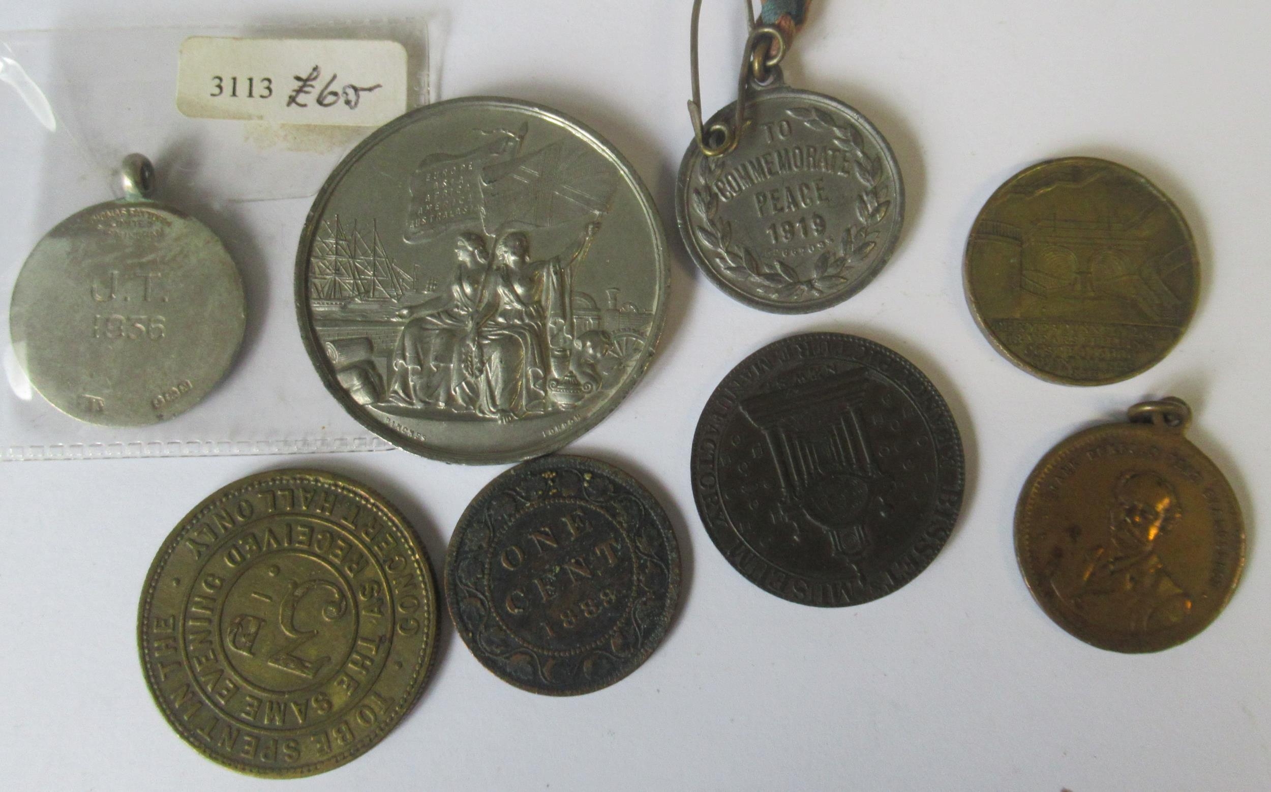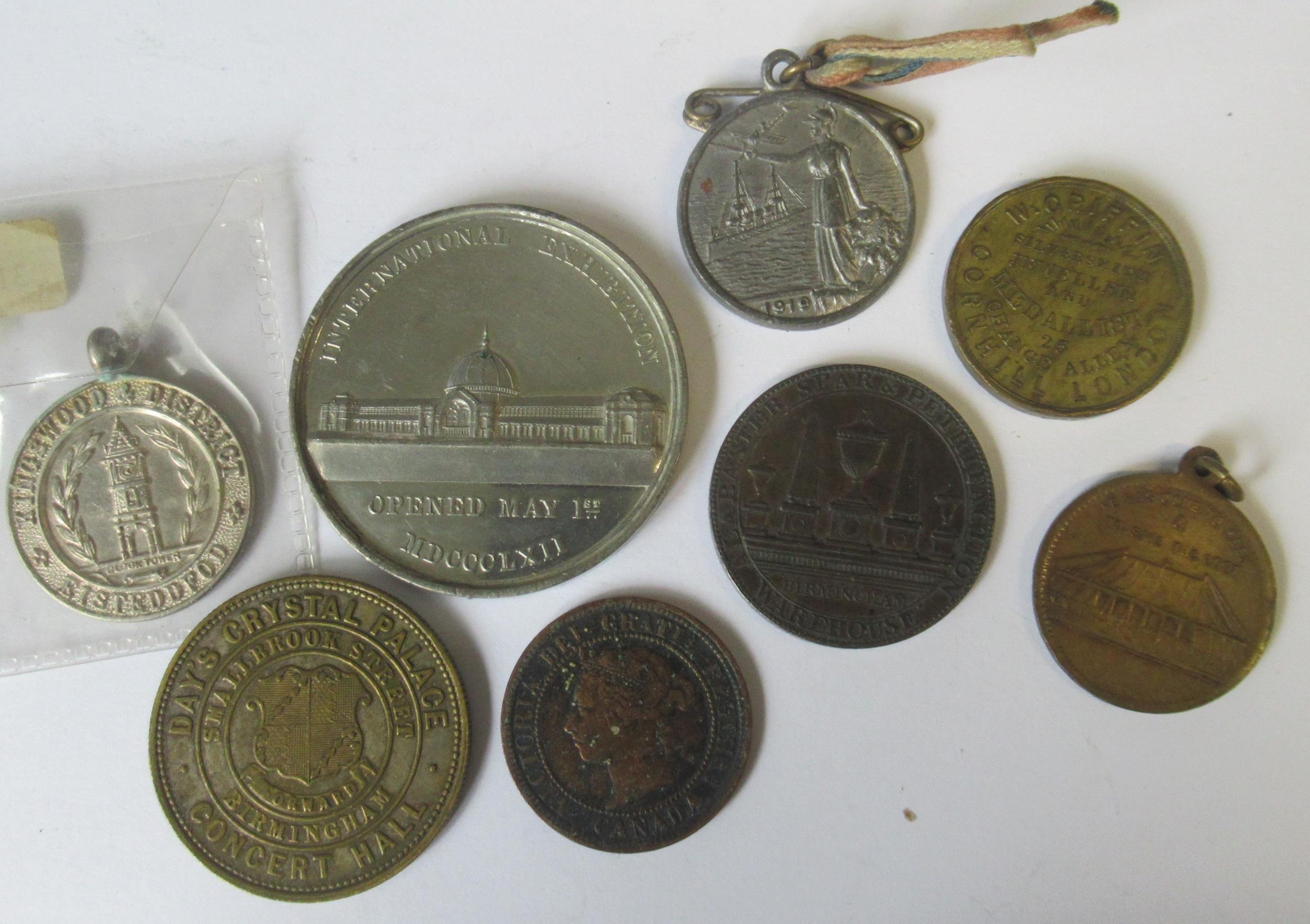 A collection of medals and tokens, to include the International Exhibition, Kingswood & District medal, etc