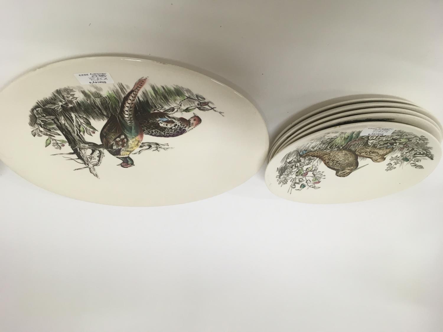 An English ceramic Game Birds dinner set with woodcock Ruffled Grouse and Pheasant no obvious damage tow sets of six plates and a serving platter.