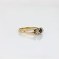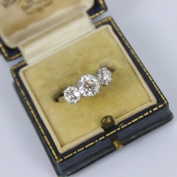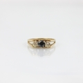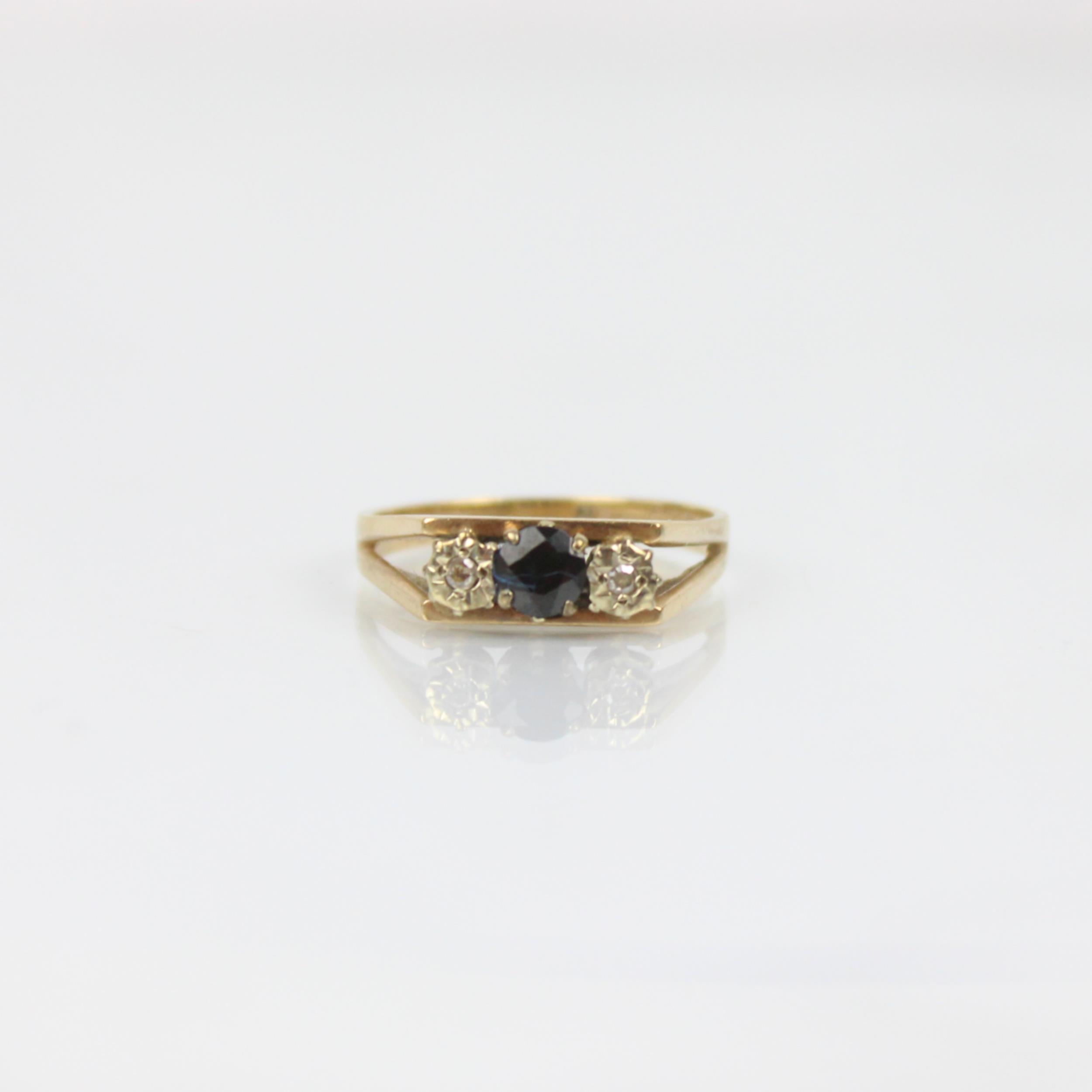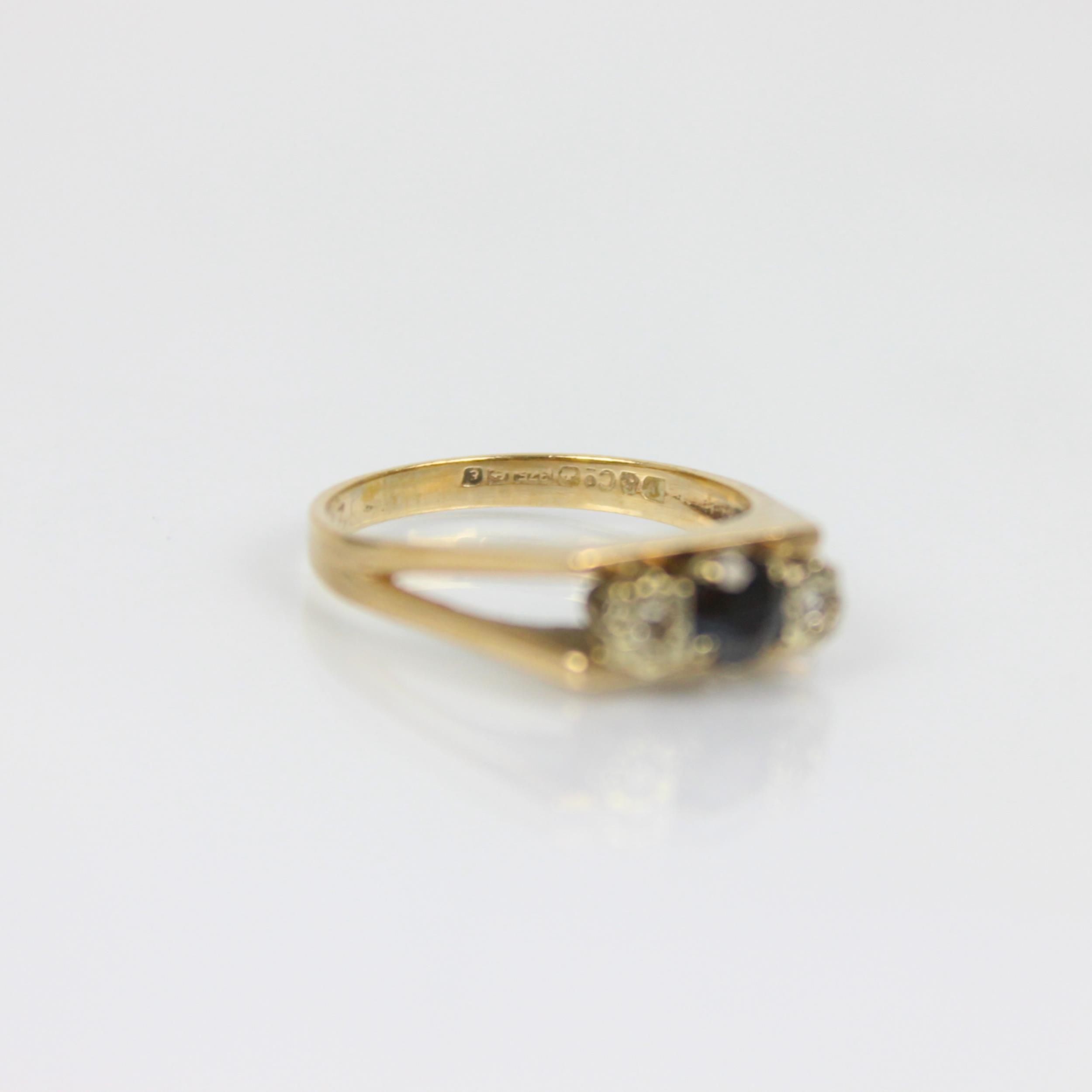 A late 20th century sapphire and diamond three stone ring, the central sapphire with diamond set to each side in white metal illusion setting, leading to openwork shoulders and plain polished shank, ring size O, 3gms