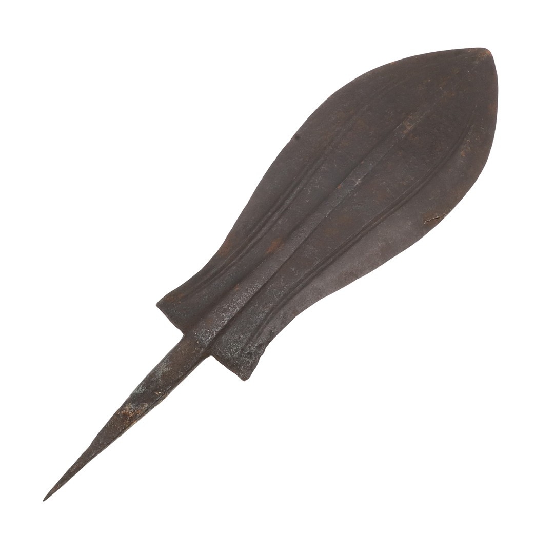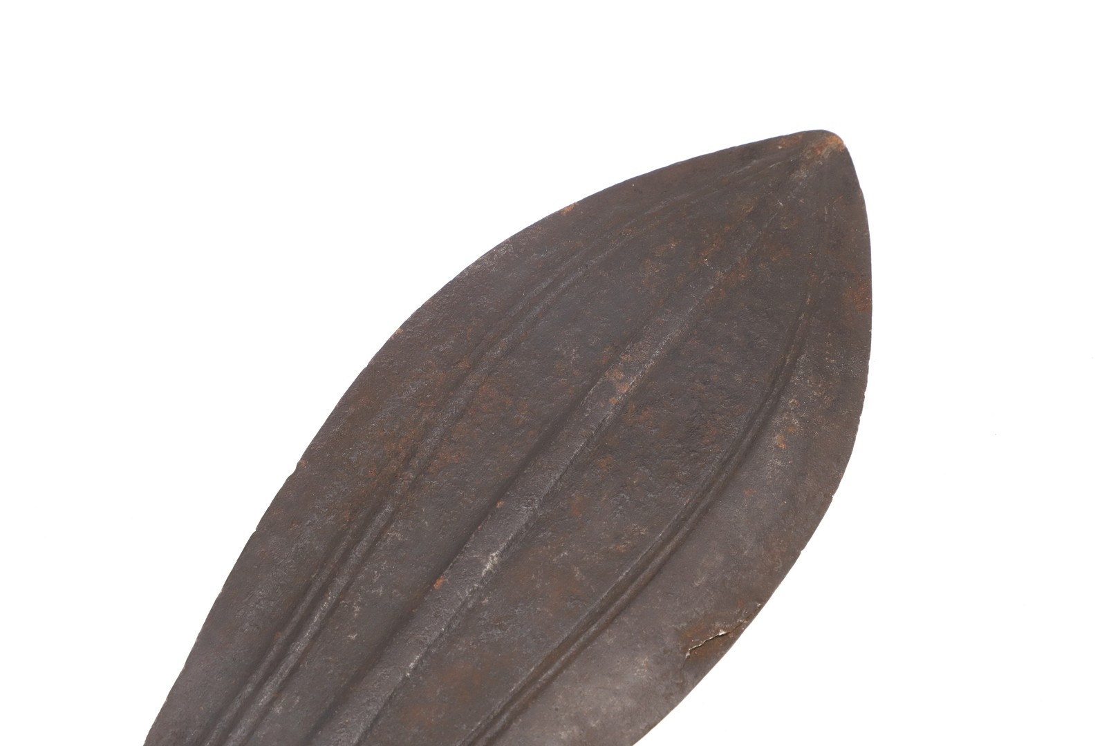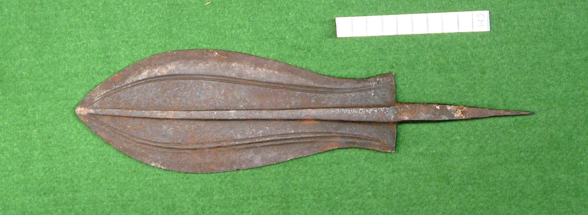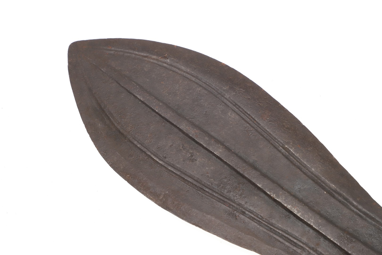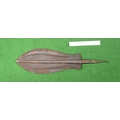 A BLADE OF A KUBVA LKULA KNIFE. With a 21 cm spear shaped blade with pronounced central ridge and engraved lines, on a pointed tang. 30.5 cm.