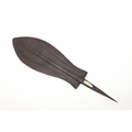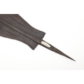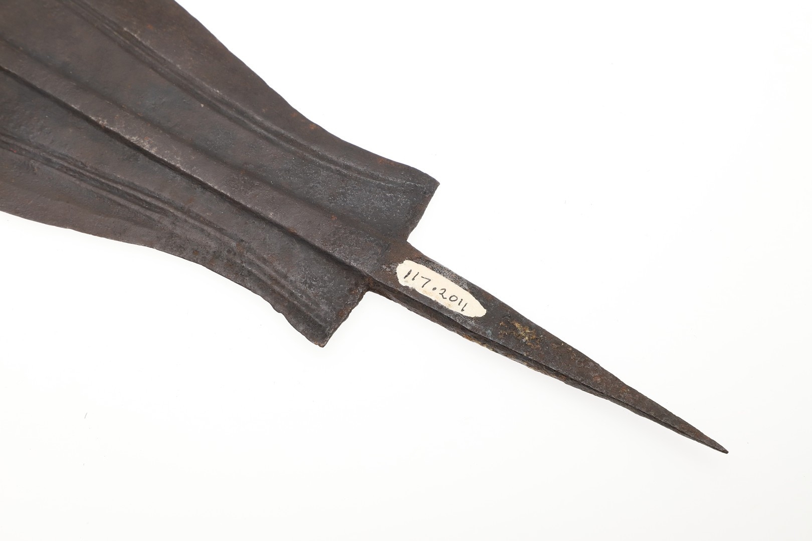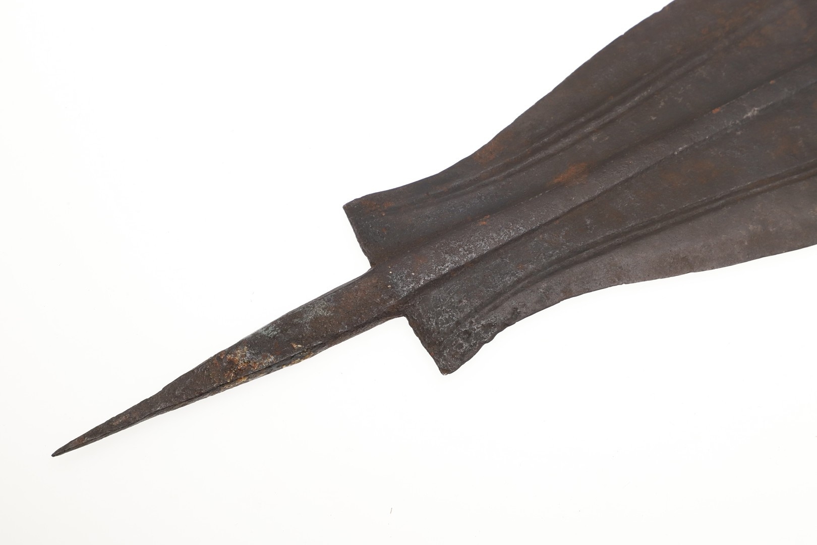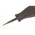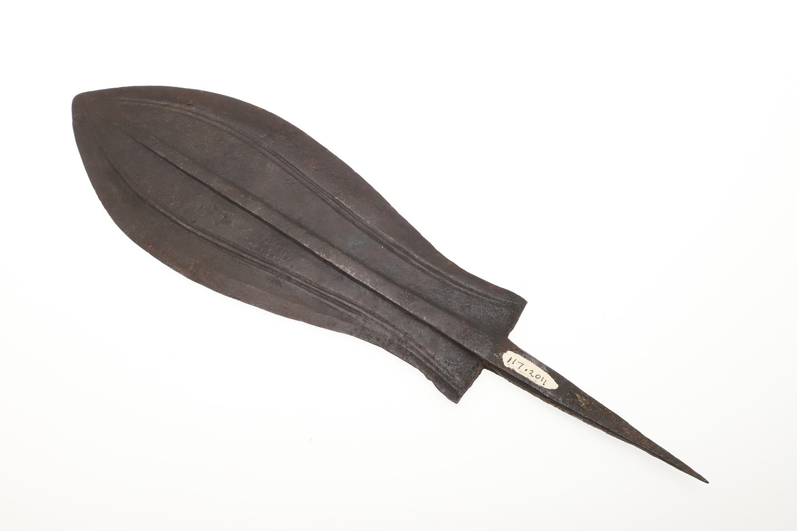 A BLADE OF A KUBVA LKULA KNIFE. With a 21 cm spear shaped blade with pronounced central ridge and engraved lines, on a pointed tang. 30.5 cm.