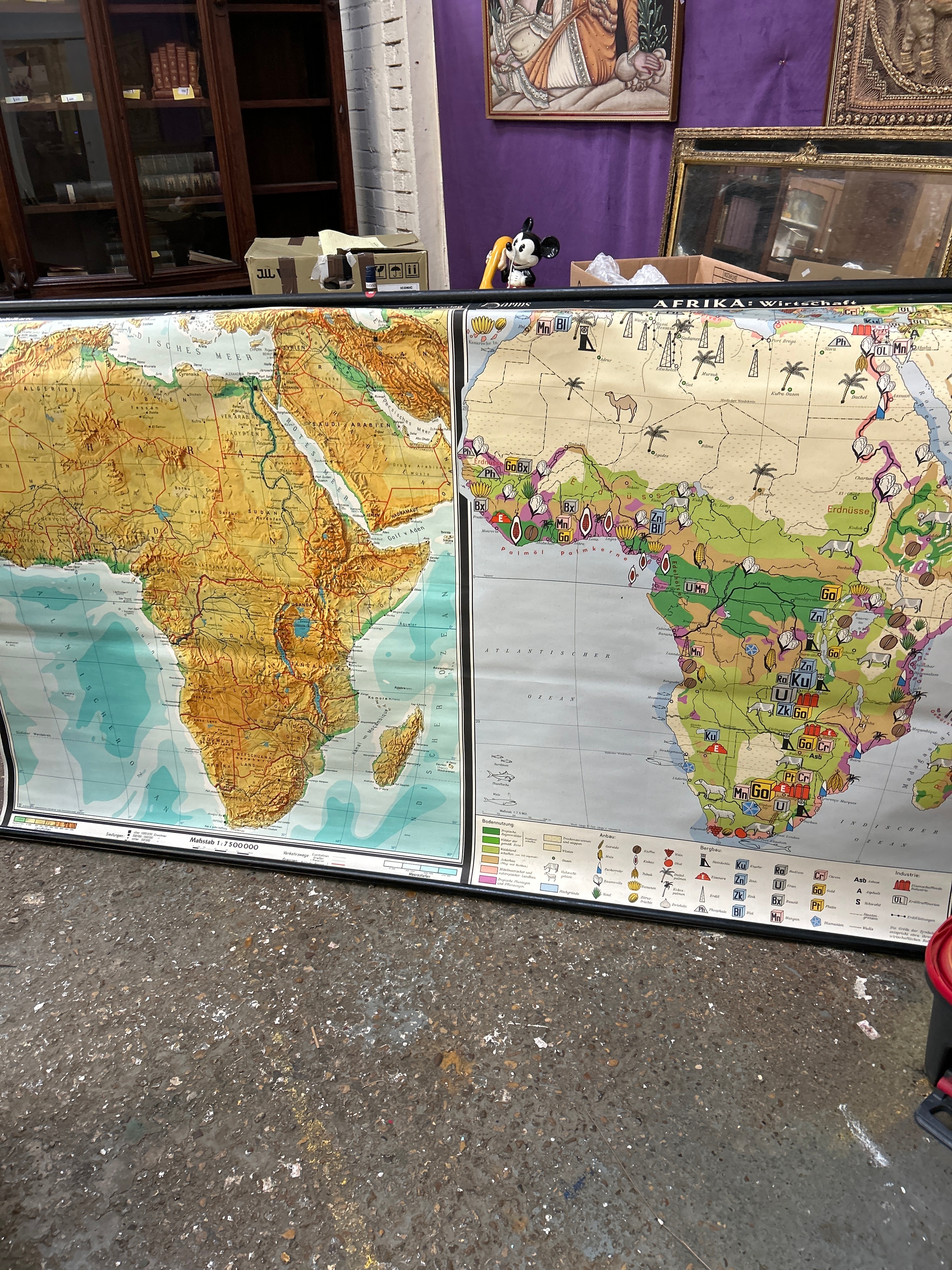 A very large German educational map of the continent of Africa with a 1:7500000 scale geographical map on the left and a map showing industry and produce on the right. Published by Wenschow - Reliefkarte. Printed by Klamath-Druck Speyer am Rhein. 208cm x130cm