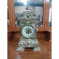 Decorative brass mantle clock in the Victorian style {39 cm H x 19 cm W x 19 cm D}.