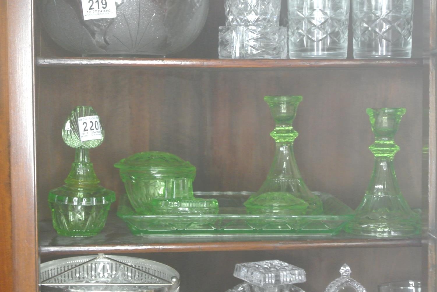 A vintage Uranium/green glass dressing table set