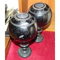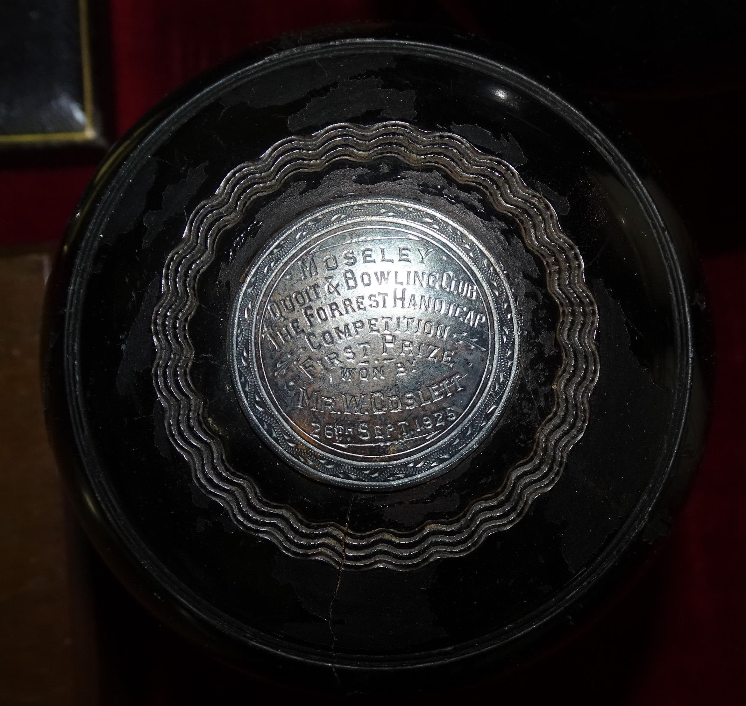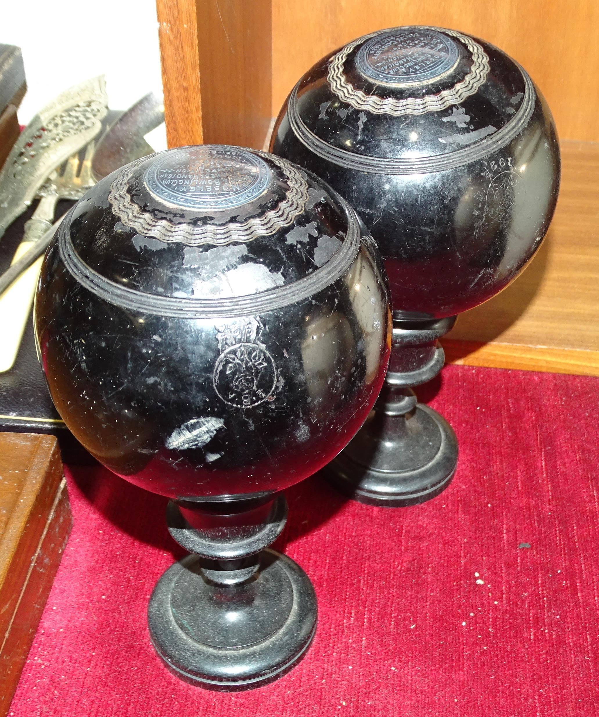 A pair of ebony bowling woods by R G Lawrie, Glasgow, each with white metal presentation plaque for 1925, on ebony stands, (2).