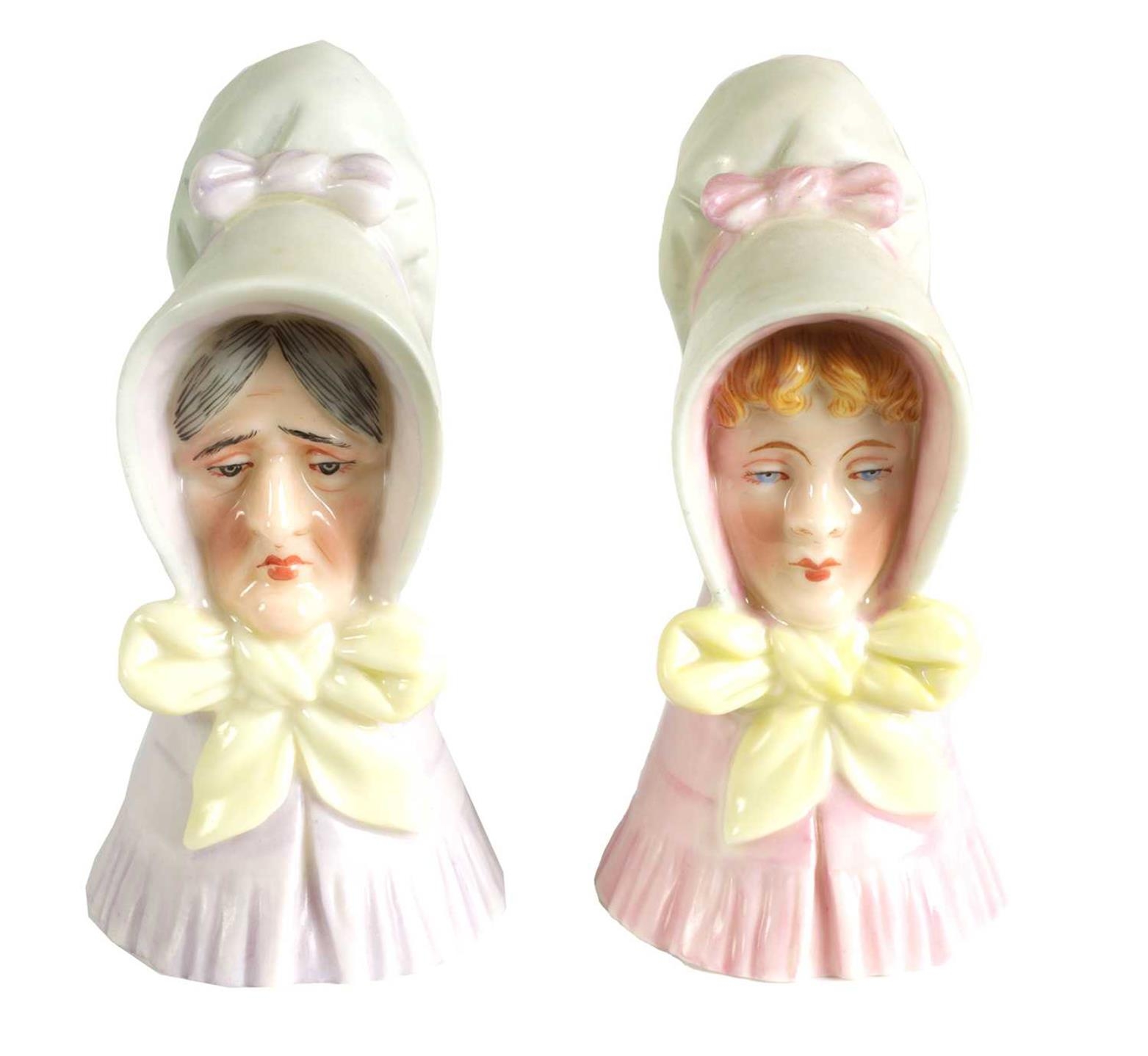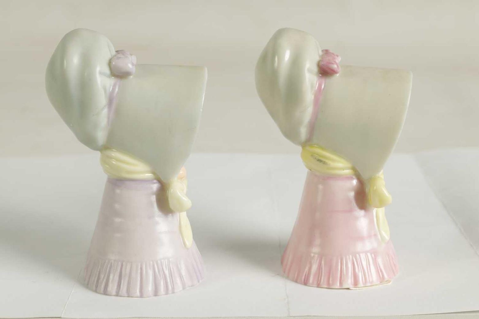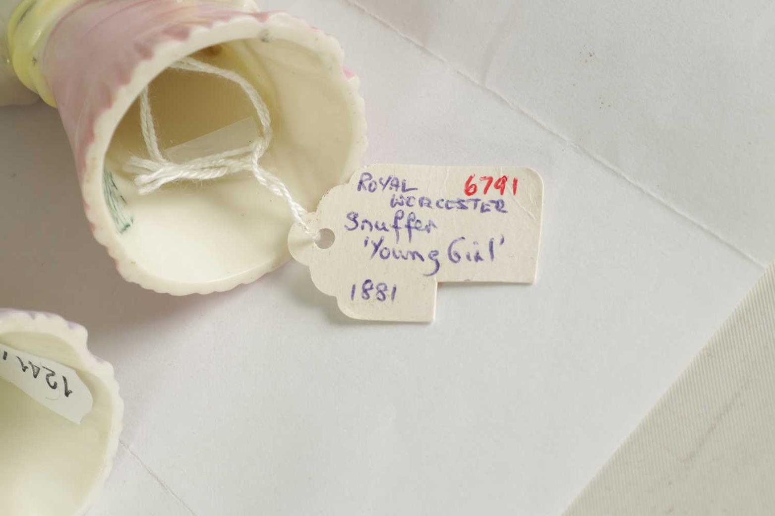 OLD WOMAN AND YOUNG GIRL TWO ROYAL WORCESTER CANDLE EXTINGUISHERS Attributed to James Hadley, both wearing a bonnet tied with a large yellow ribbon, the older woman's bonnet and collar in lilac and the young girl's in pink, green marks and registration to underside - Tony Horsley, Distinguished Extinguishers (1999), illustrated on pages 46-48 of Distinguished Extinguishers by Tony Horsley. (9cm high)