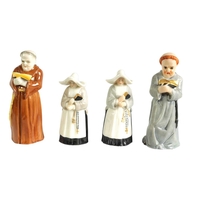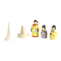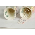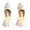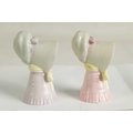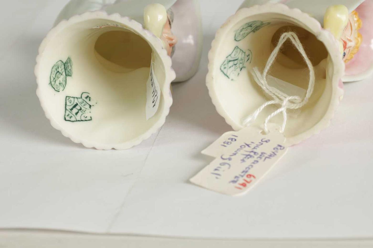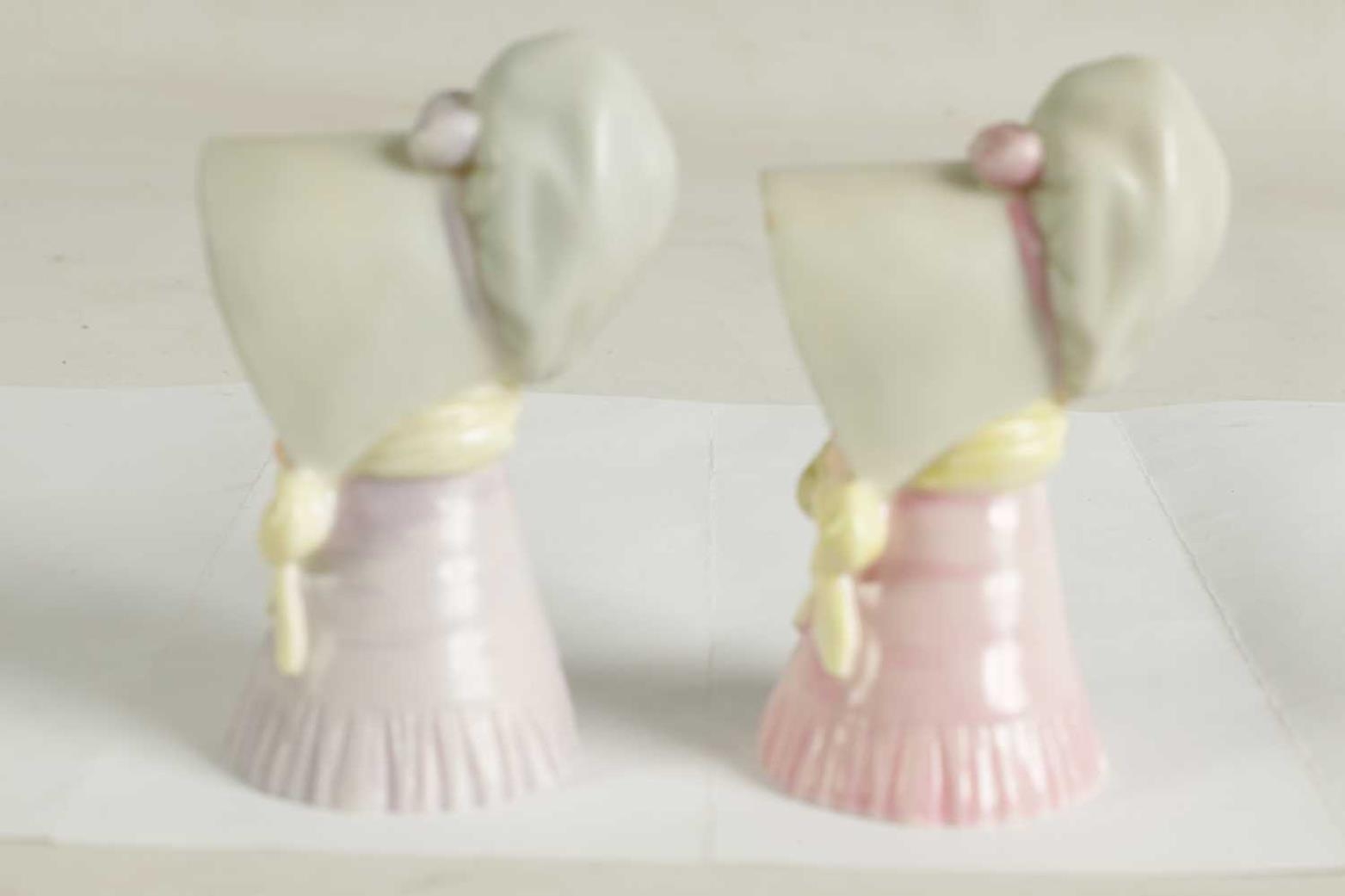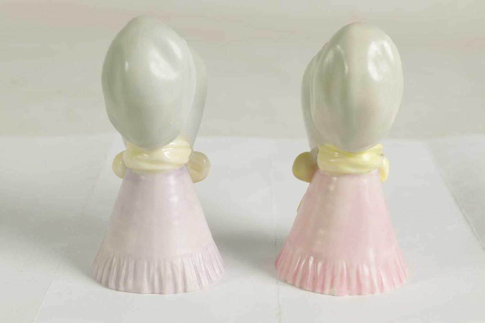 OLD WOMAN AND YOUNG GIRL TWO ROYAL WORCESTER CANDLE EXTINGUISHERS Attributed to James Hadley, both wearing a bonnet tied with a large yellow ribbon, the older woman's bonnet and collar in lilac and the young girl's in pink, green marks and registration to underside - Tony Horsley, Distinguished Extinguishers (1999), illustrated on pages 46-48 of Distinguished Extinguishers by Tony Horsley. (9cm high)