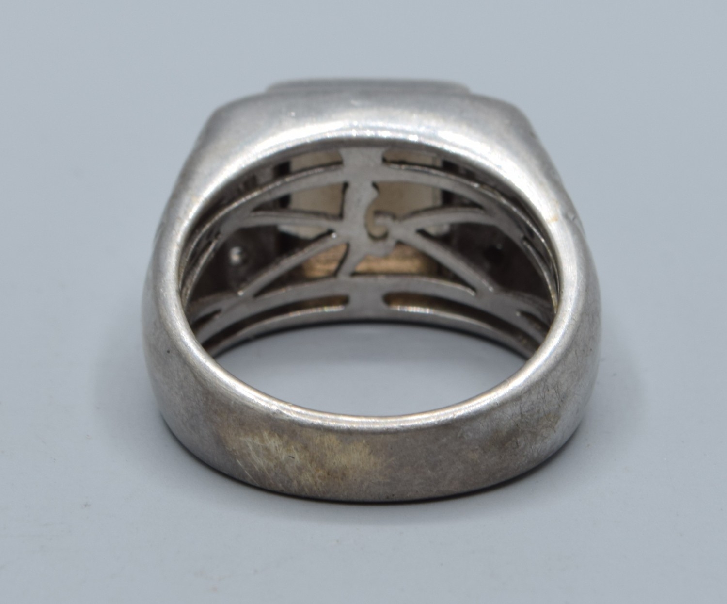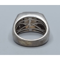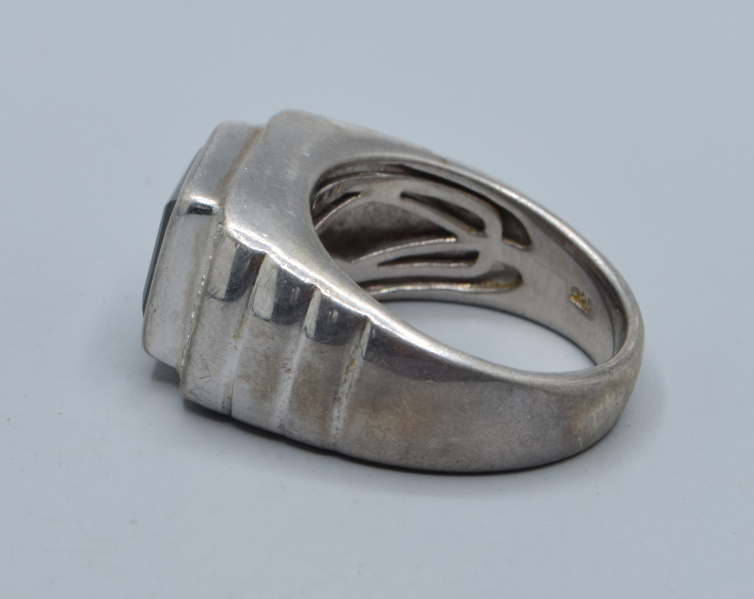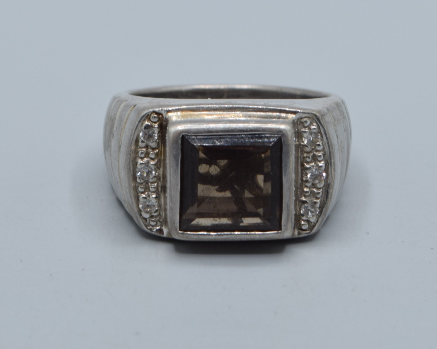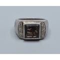 925 silver gents heavy Smokie quarts square face signet ring with clear stone side decoration size U, 15grams