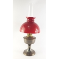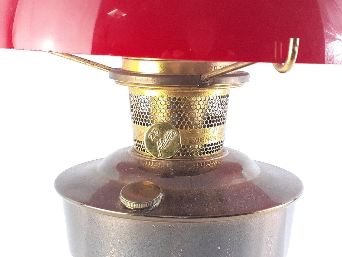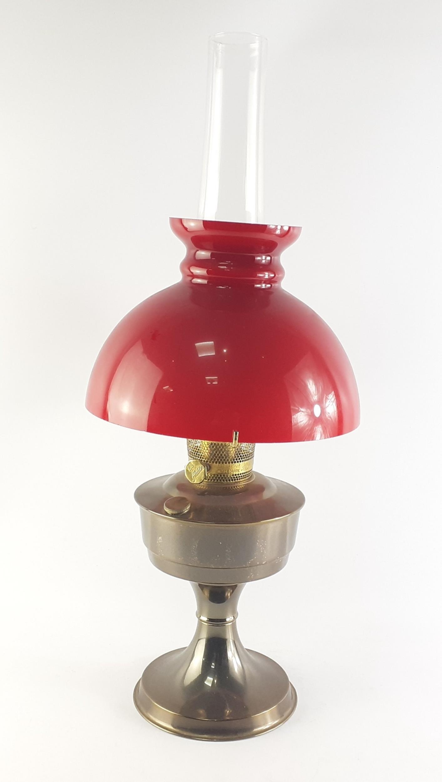 An ALADDIN no 23 oil lamp with burner and red shade. Stands 60cm high approx.
