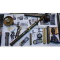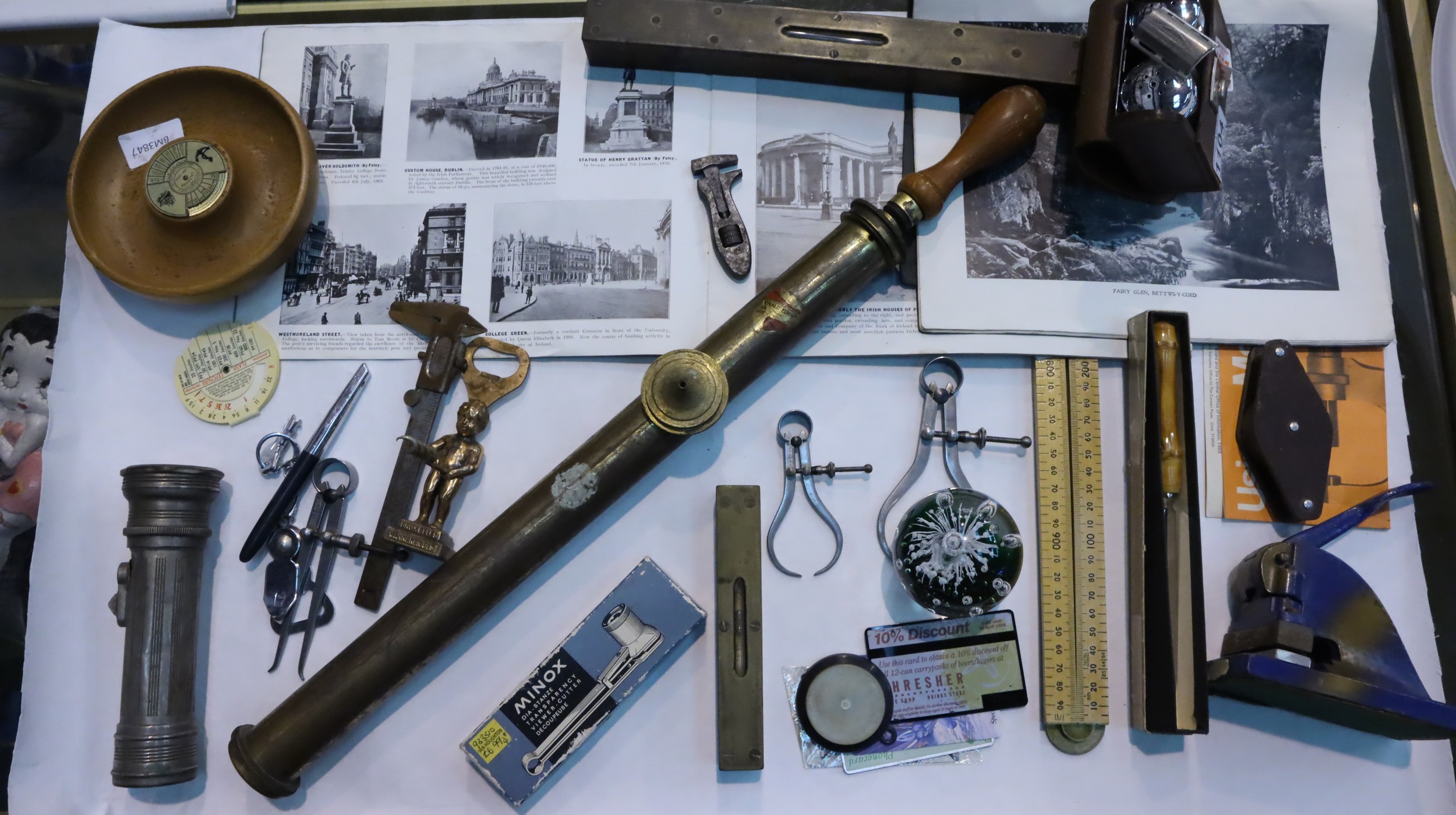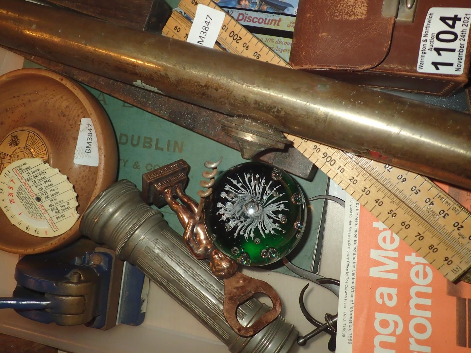 Tray of mixed collectables to include vintage ruler, paper weight, pulley etc. Not available for in-house P&P, contact Paul O'Hea at Mailboxes on 01925 659133
