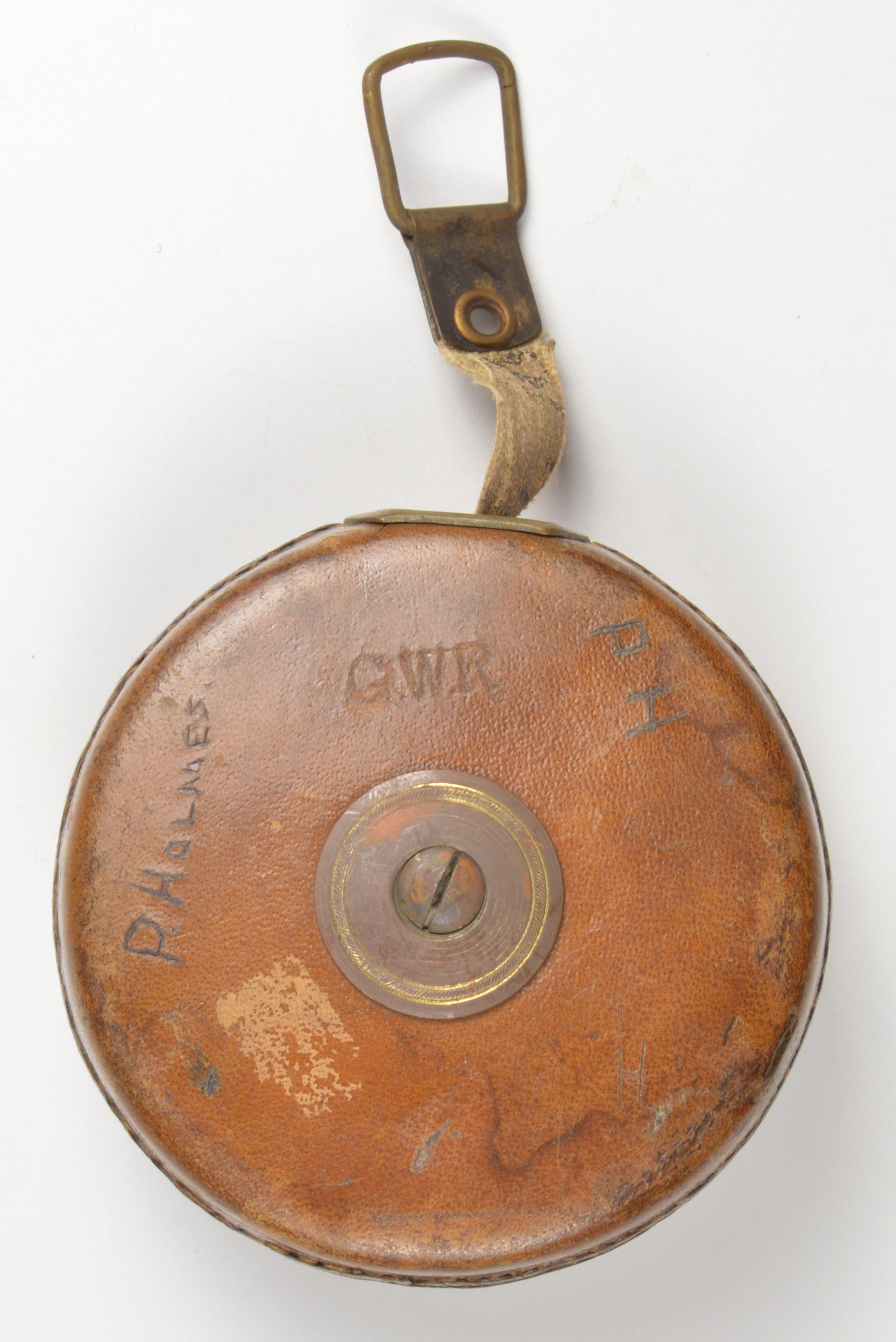 Great Western Railway 33ft tape measure (leather case), tape slightly worn but working, 3 1/2 inches diameter. Shipping band - B.