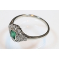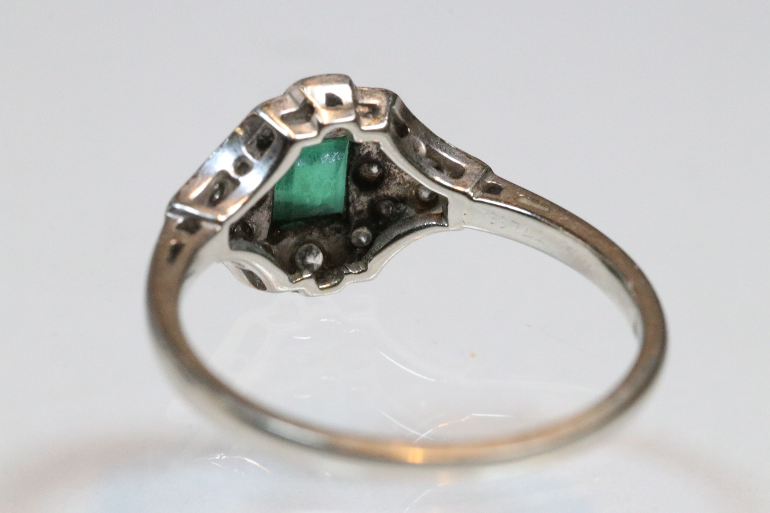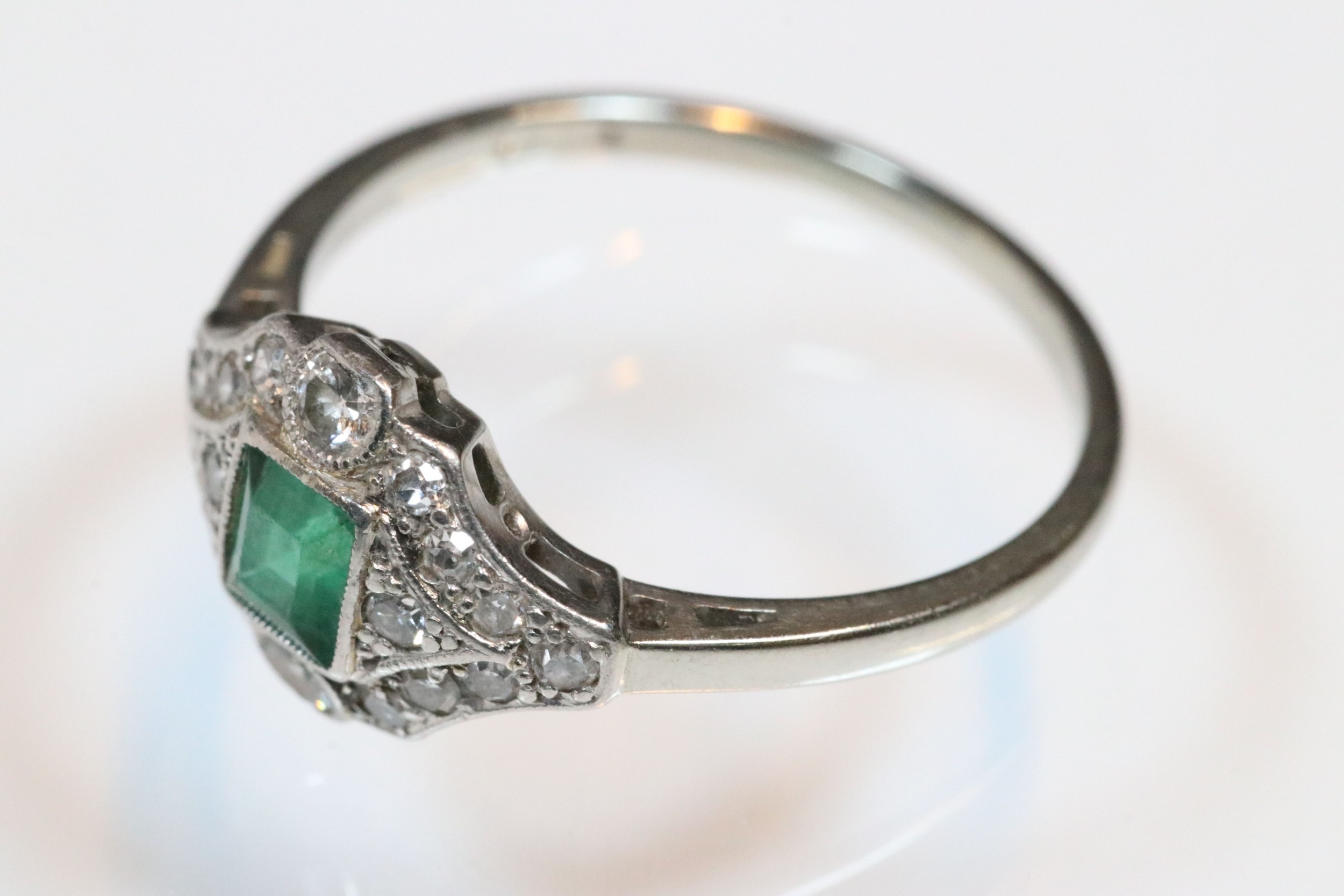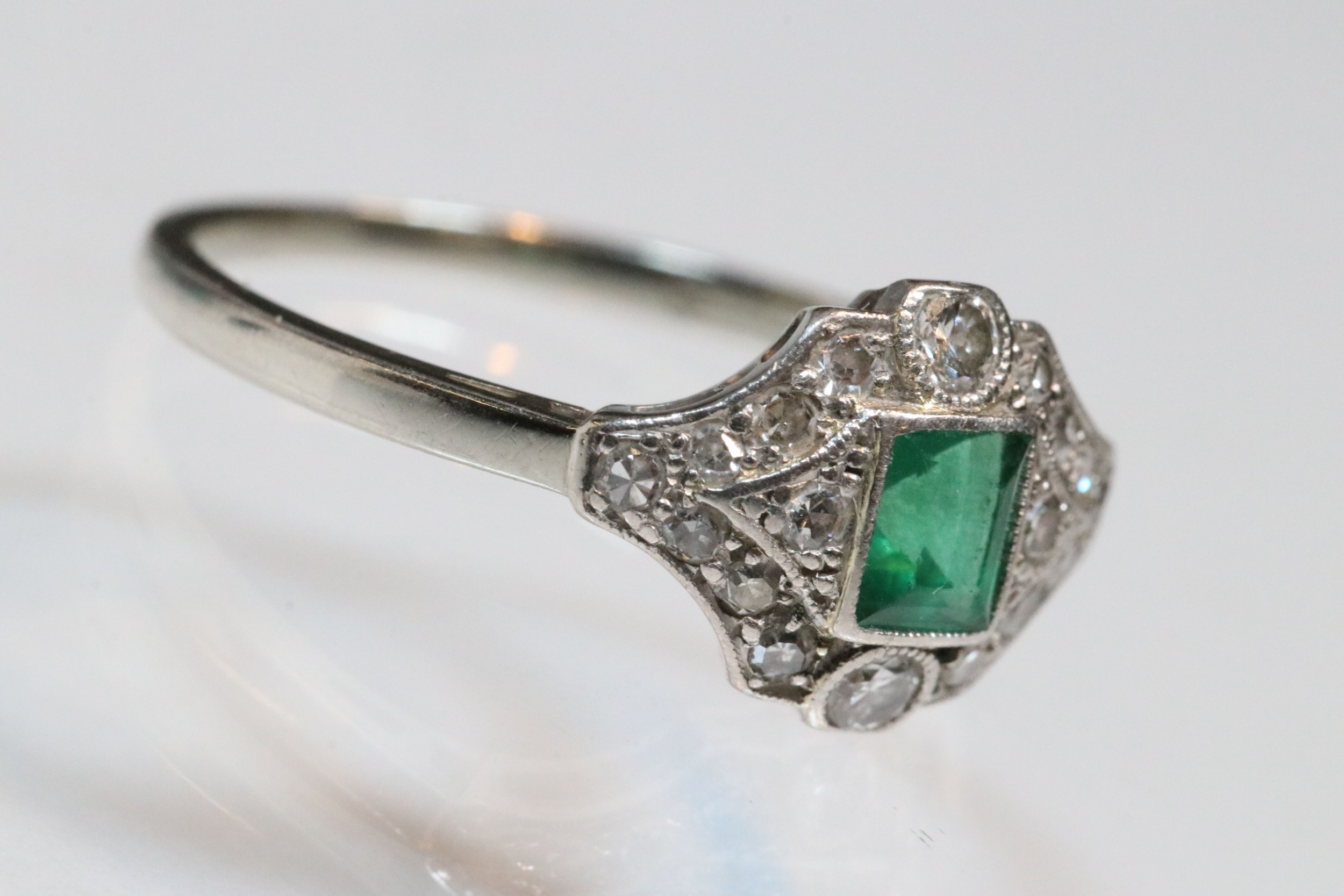 Art Deco 18ct gold, emerald and diamond panel ring. The ring being set with a rectangular step cut emerald to centre surrounded by round brilliant cut and single cut diamonds. Shank marked 18ct. Size M.5. Emerald measures 3.5 x 4mm. Largest diamond estimated 0.03ct.