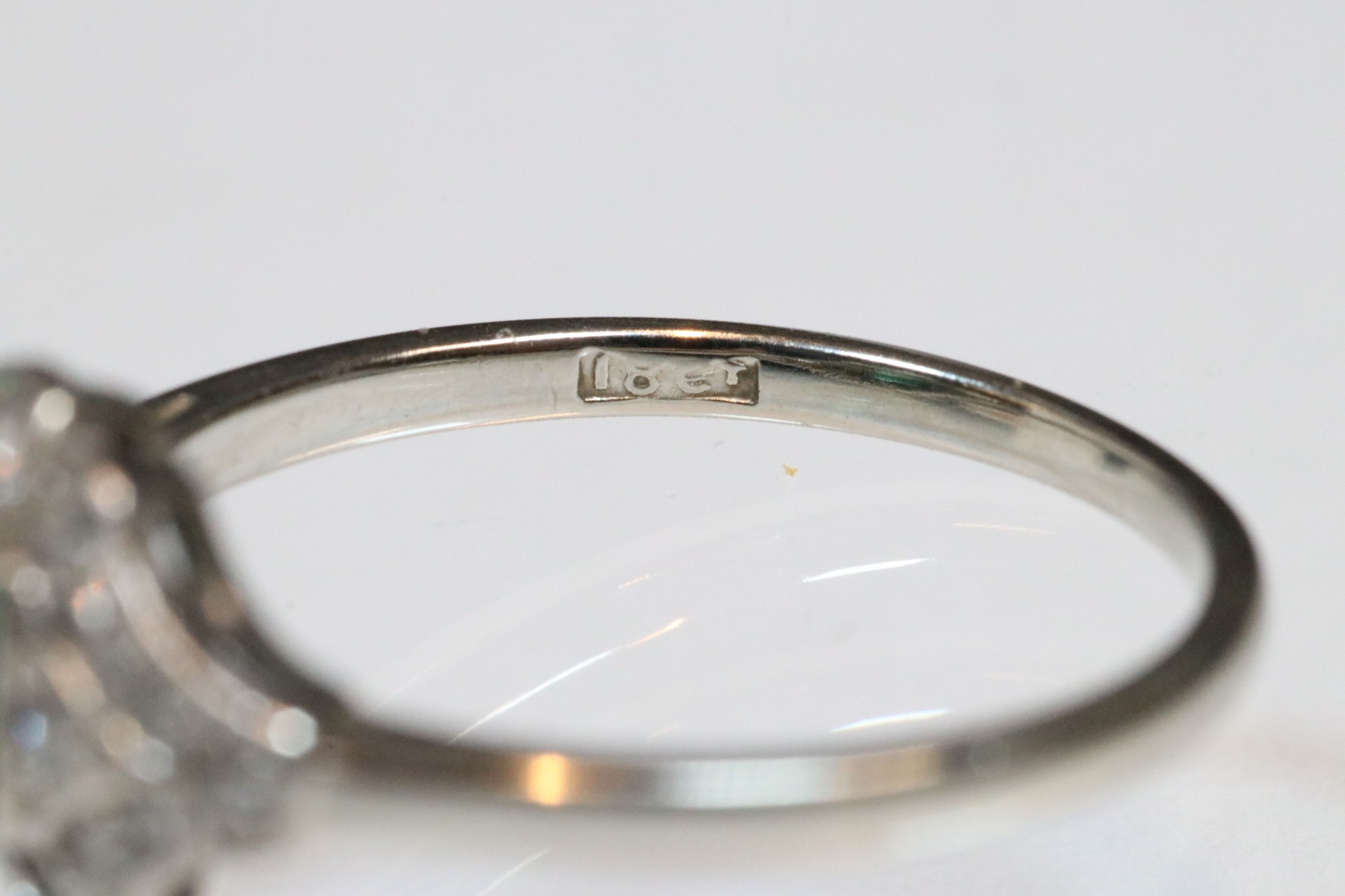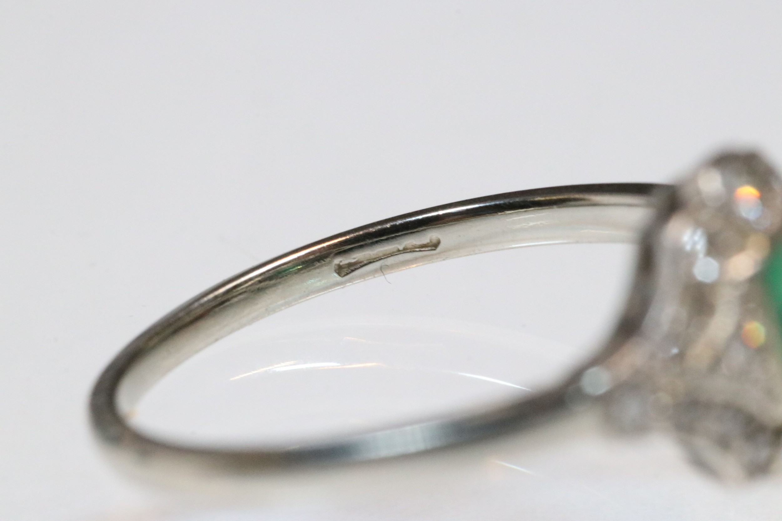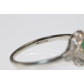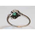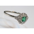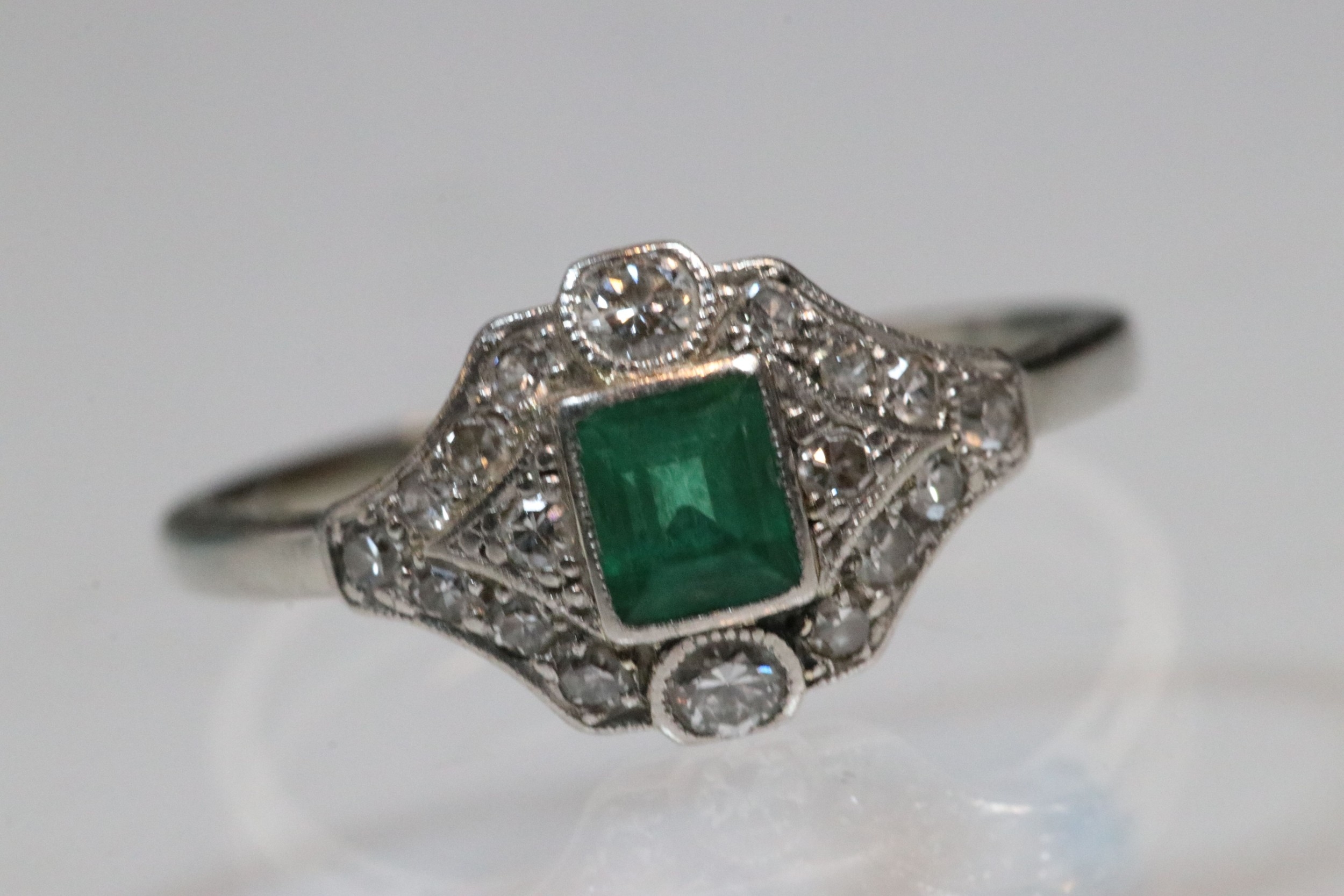 Art Deco 18ct gold, emerald and diamond panel ring. The ring being set with a rectangular step cut emerald to centre surrounded by round brilliant cut and single cut diamonds. Shank marked 18ct. Size M.5. Emerald measures 3.5 x 4mm. Largest diamond estimated 0.03ct.