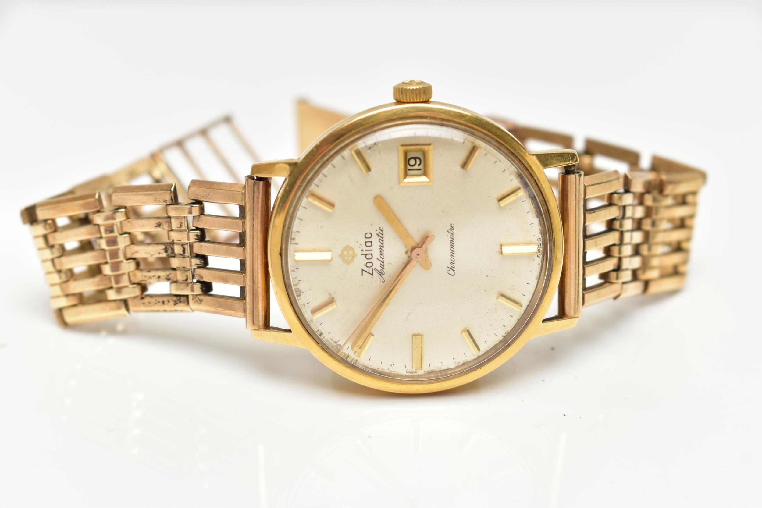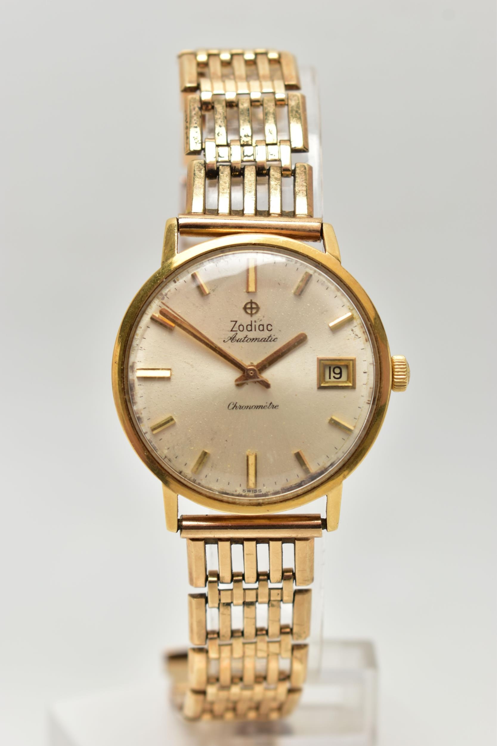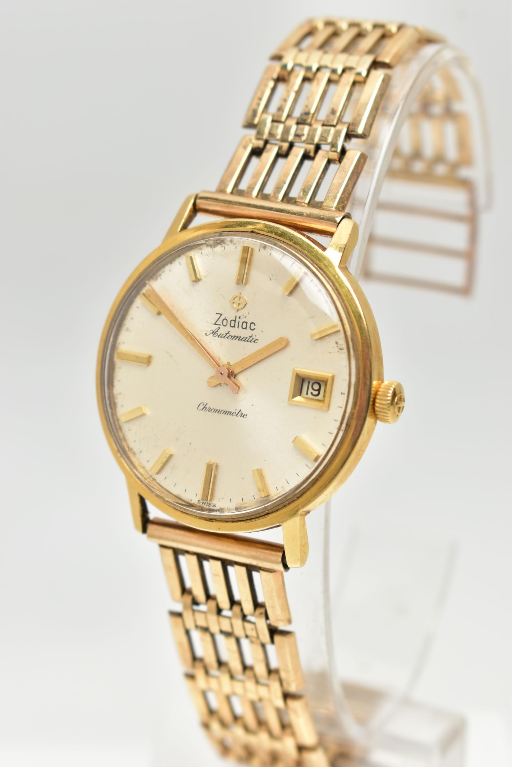 A 9CT GOLD ZODIAC AUTOMATIC CHRONOMETRE WRISTWATCH, the circular face with baton hour markers and date dial, to the gate bracelet watch strap, face diameter 30mm, strap with 9ct hallmark, approximate total weight 56.8 grams (condition report: Some scratches to glass, moderate general wear, currently working at the time of cataloguing, time keeping not tested)