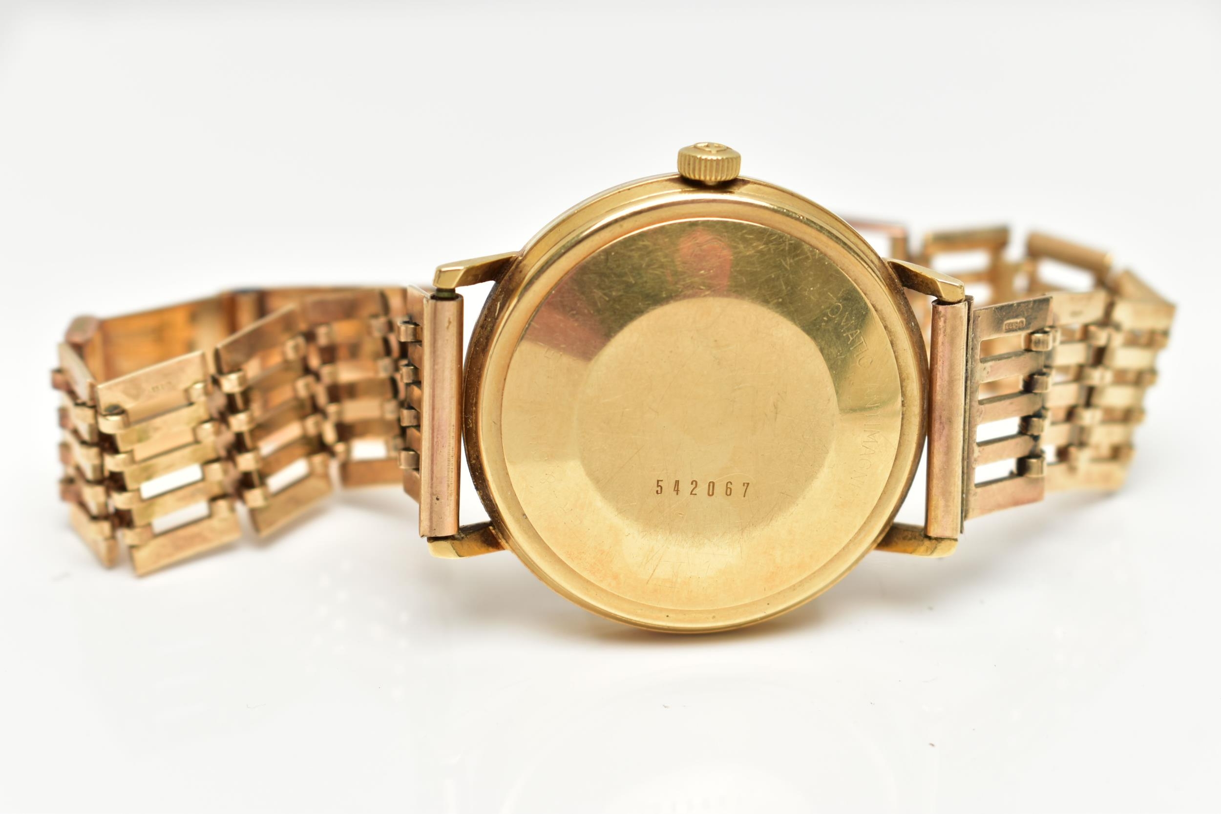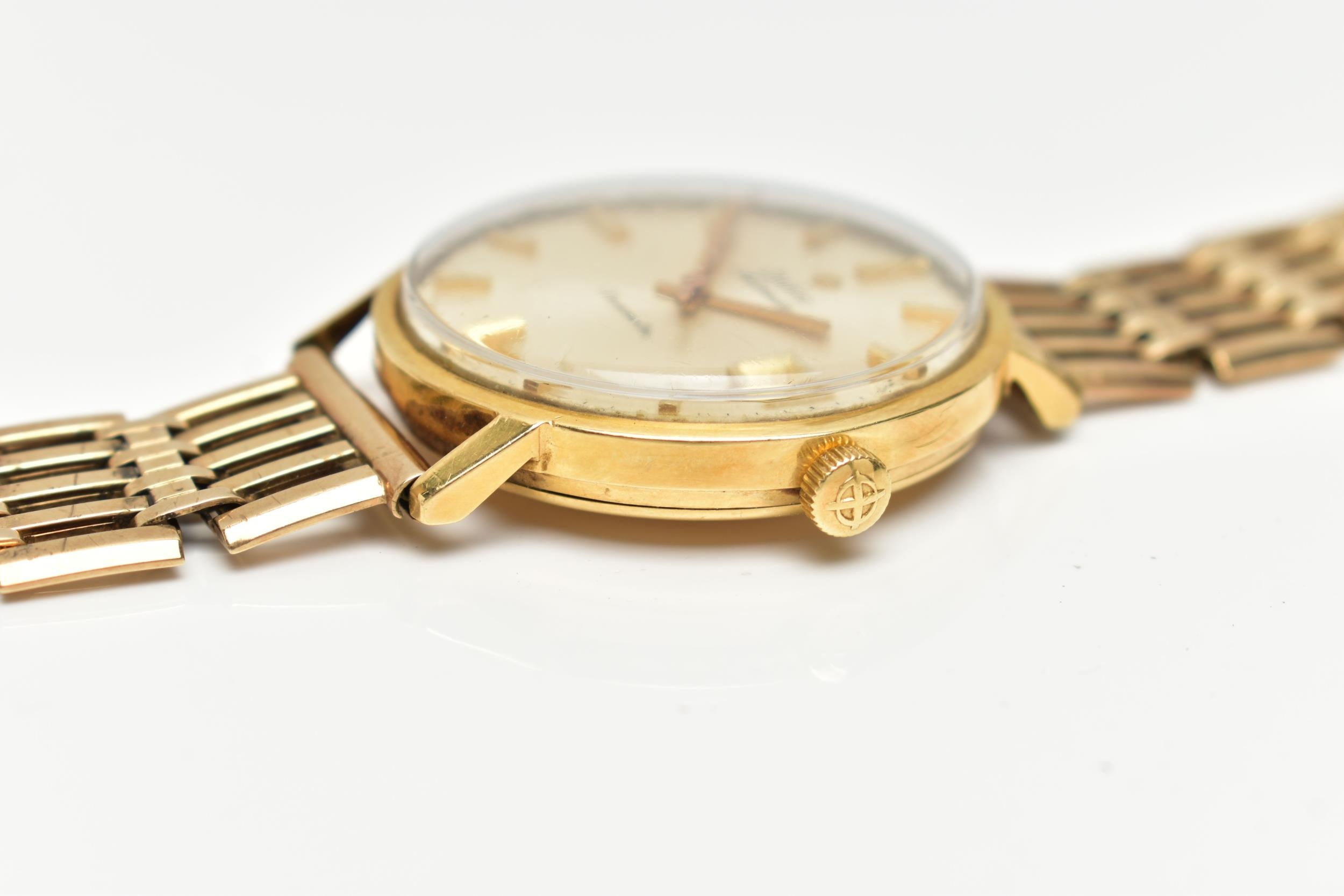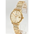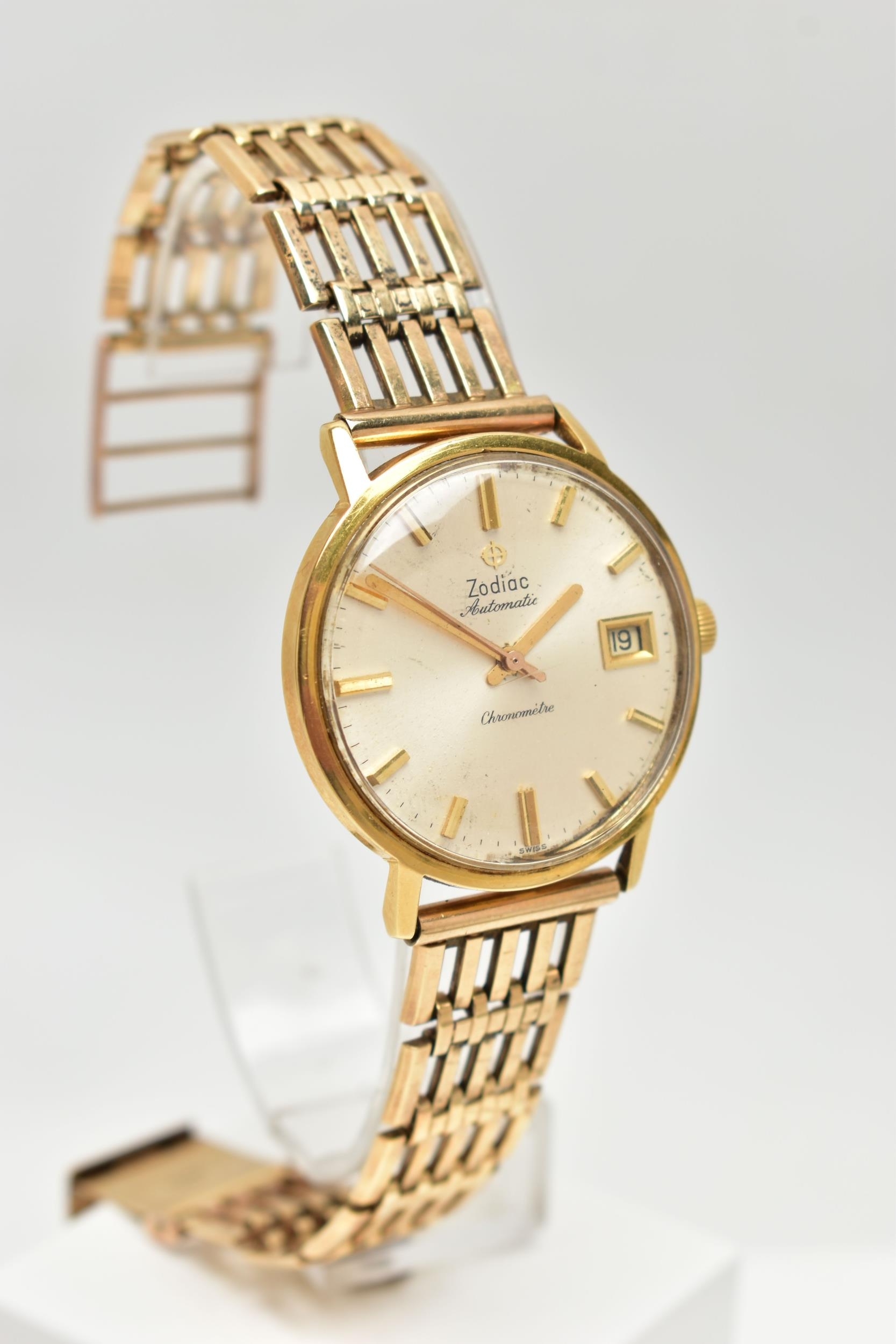 A 9CT GOLD ZODIAC AUTOMATIC CHRONOMETRE WRISTWATCH, the circular face with baton hour markers and date dial, to the gate bracelet watch strap, face diameter 30mm, strap with 9ct hallmark, approximate total weight 56.8 grams (condition report: Some scratches to glass, moderate general wear, currently working at the time of cataloguing, time keeping not tested)
