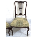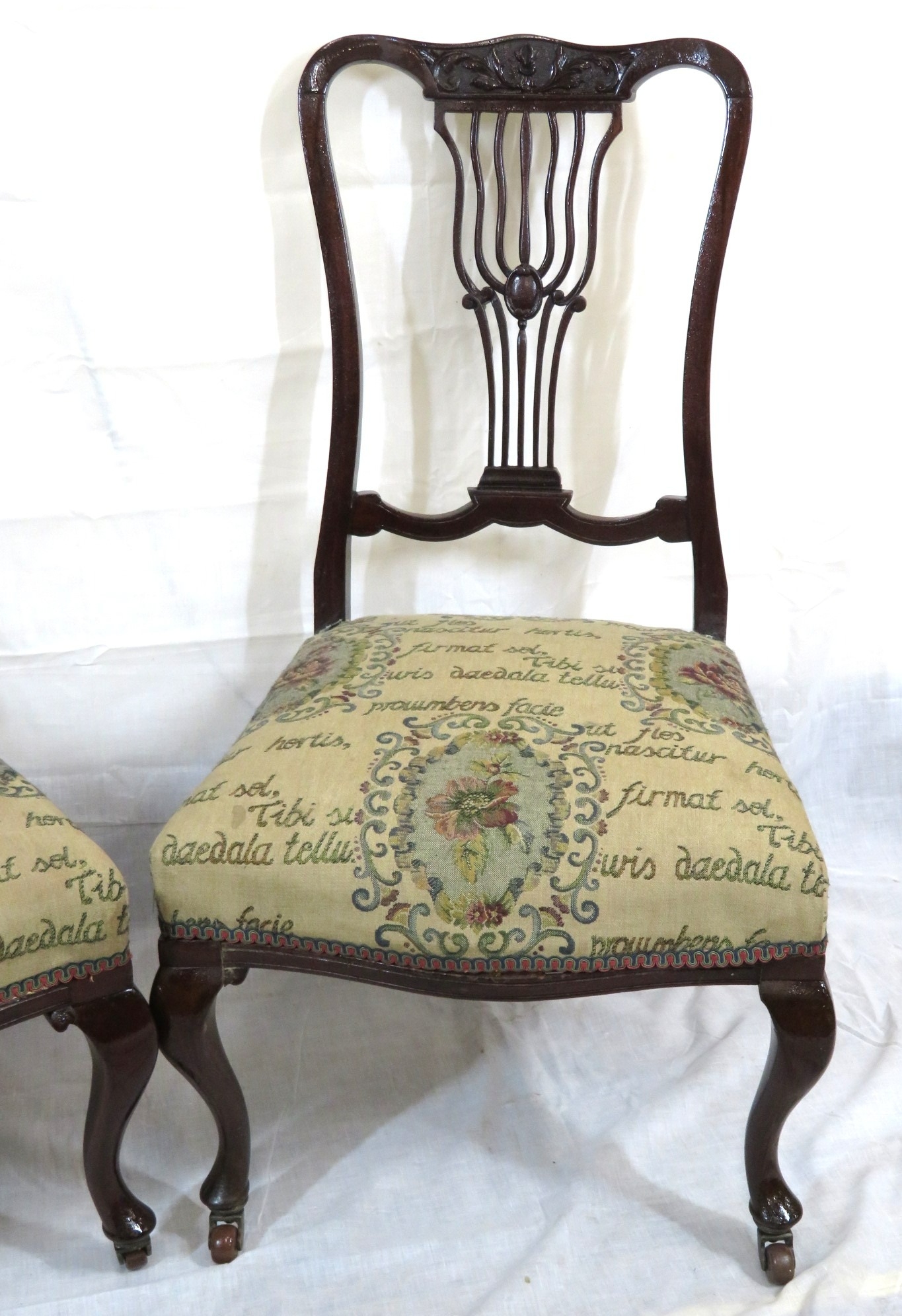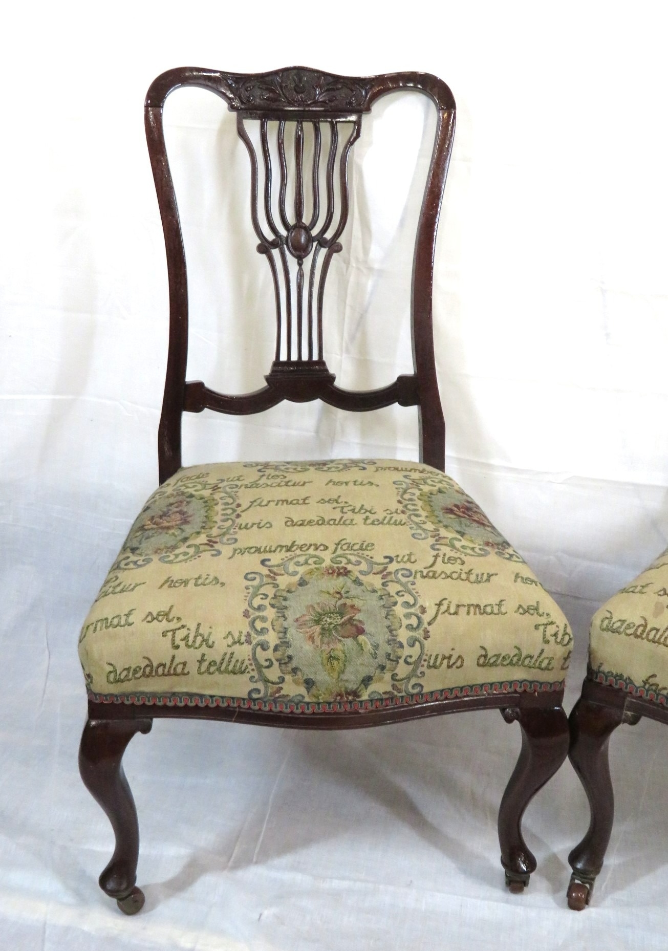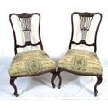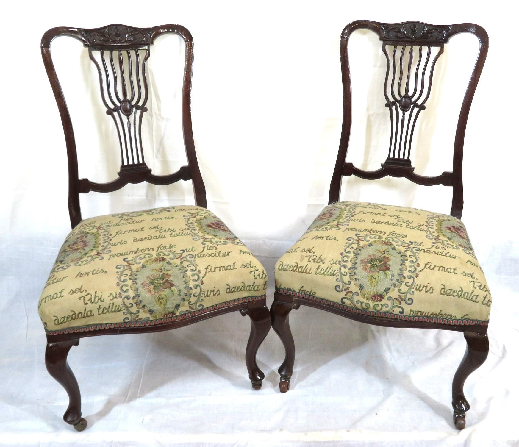 Pair of Victorian mahogany occasional or bedroom chairs with pierced rails, foliate upholstery, on cabriole legs with casters