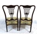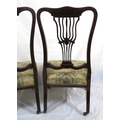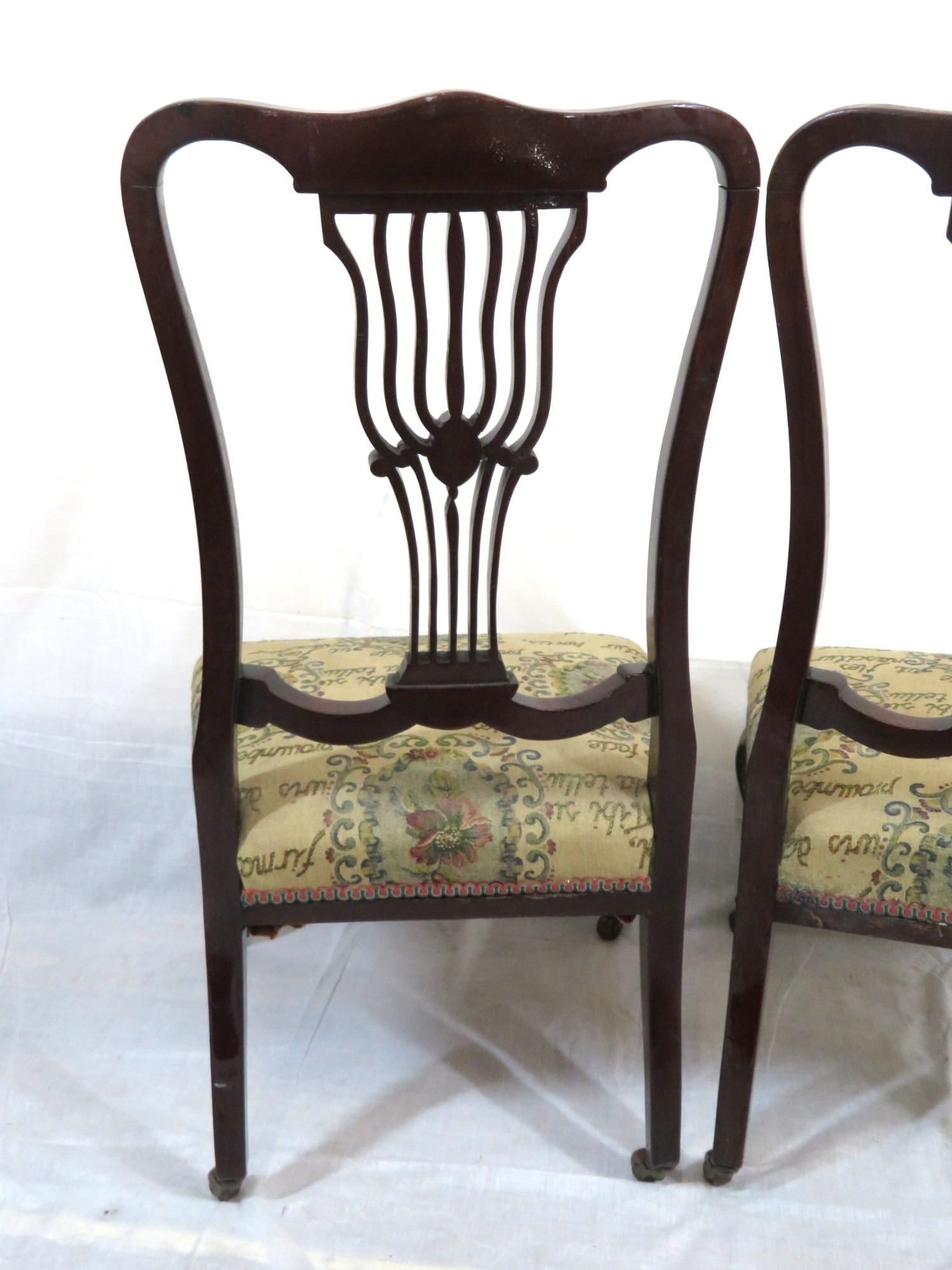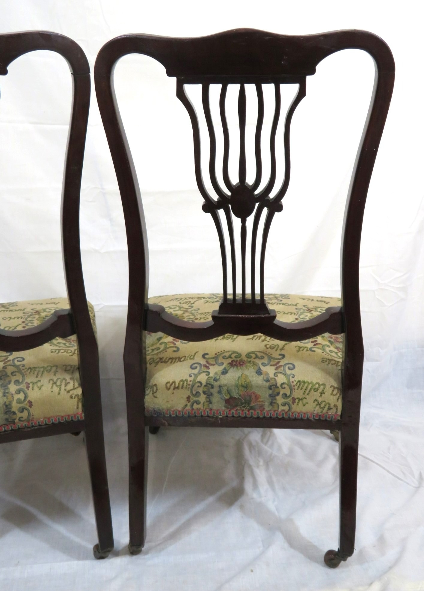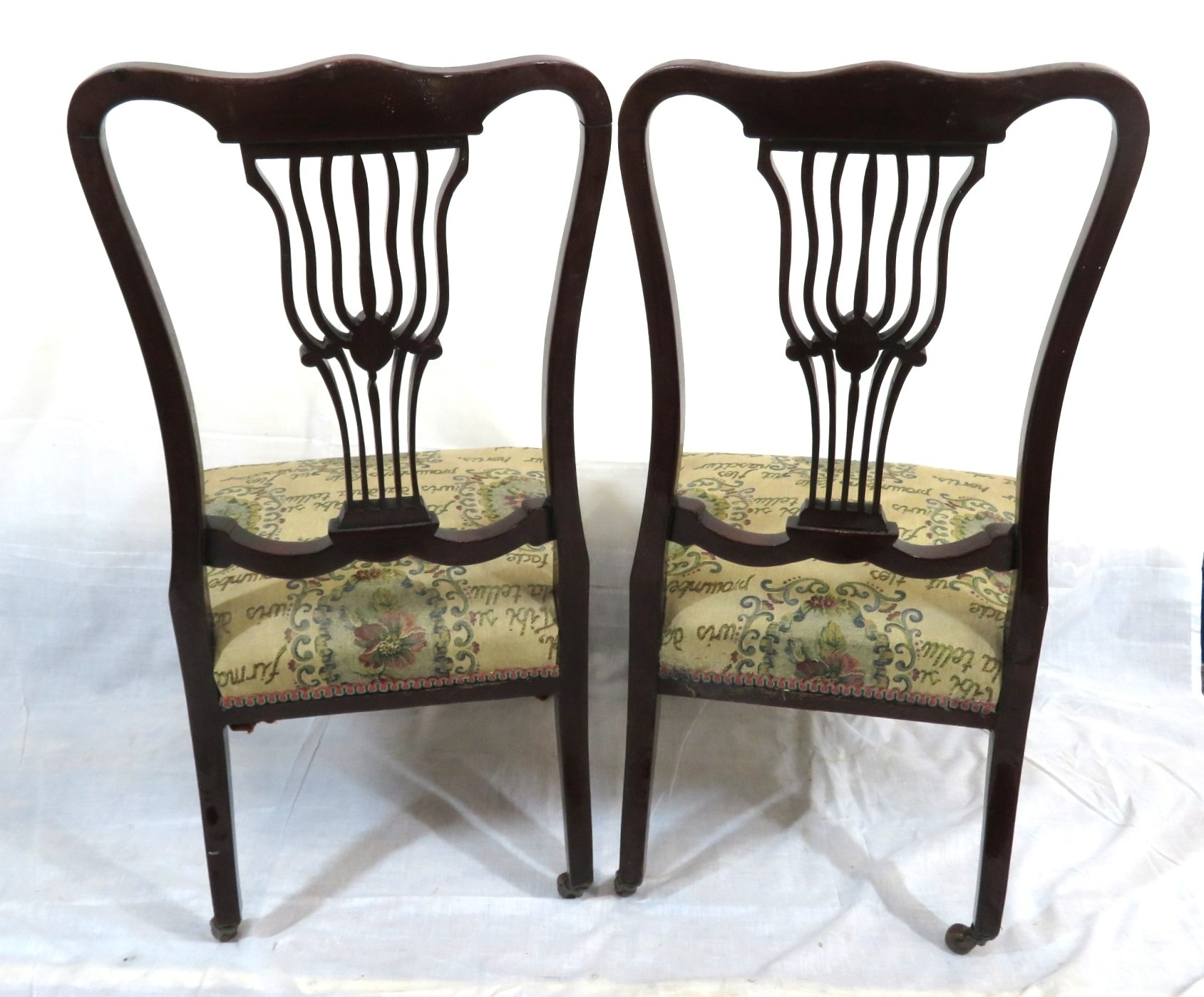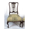 Pair of Victorian mahogany occasional or bedroom chairs with pierced rails, foliate upholstery, on cabriole legs with casters
