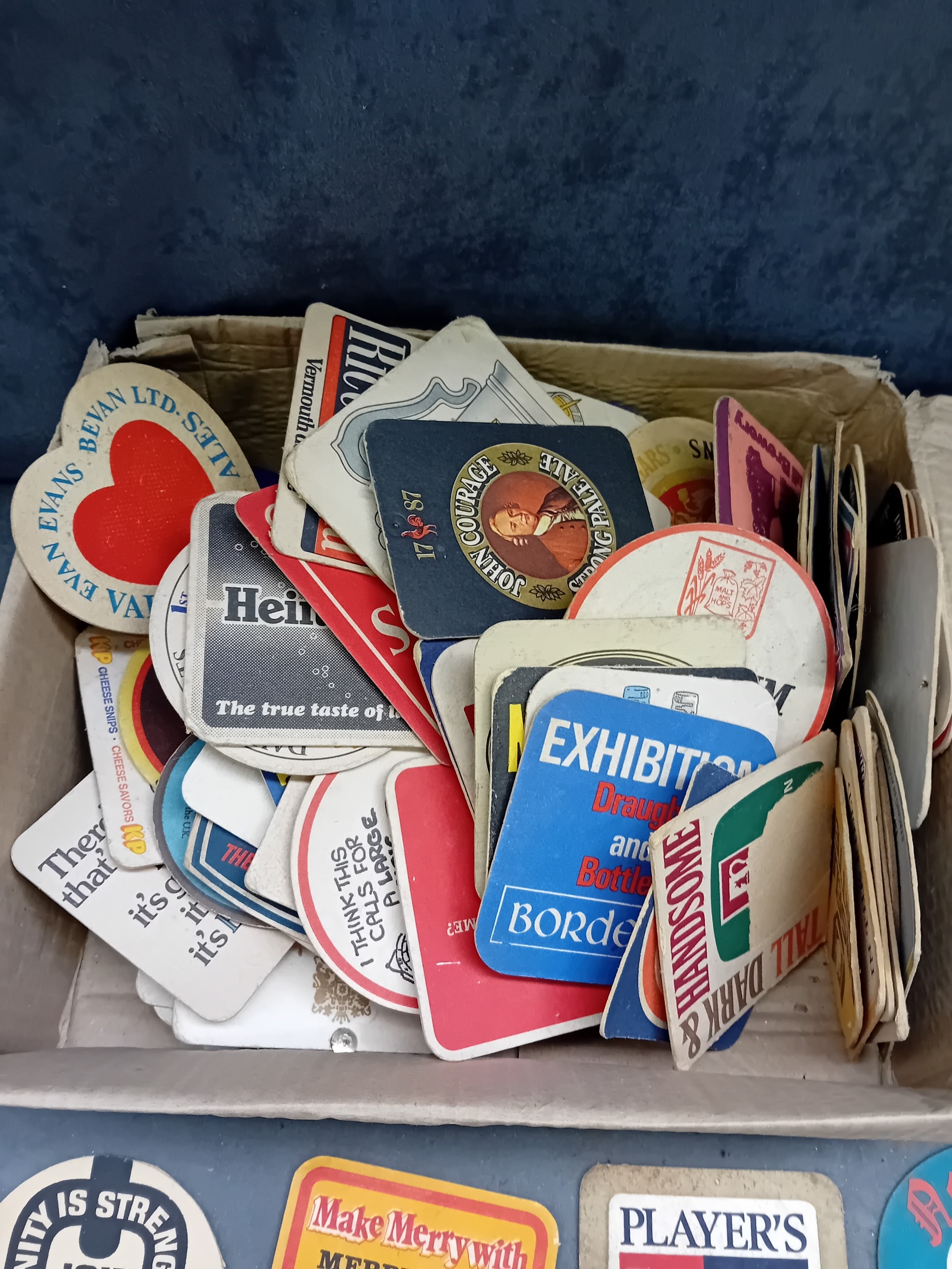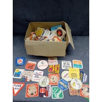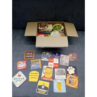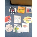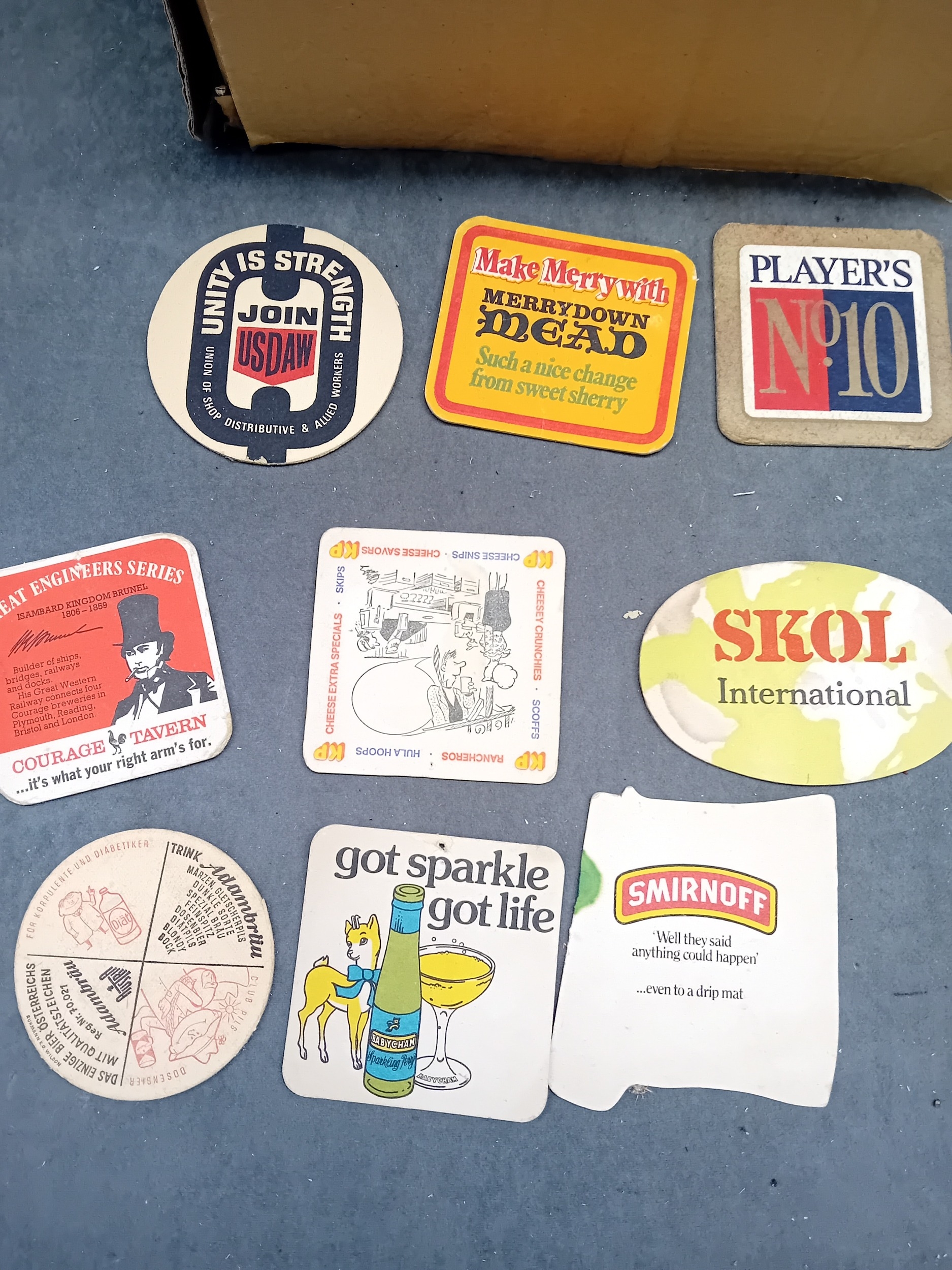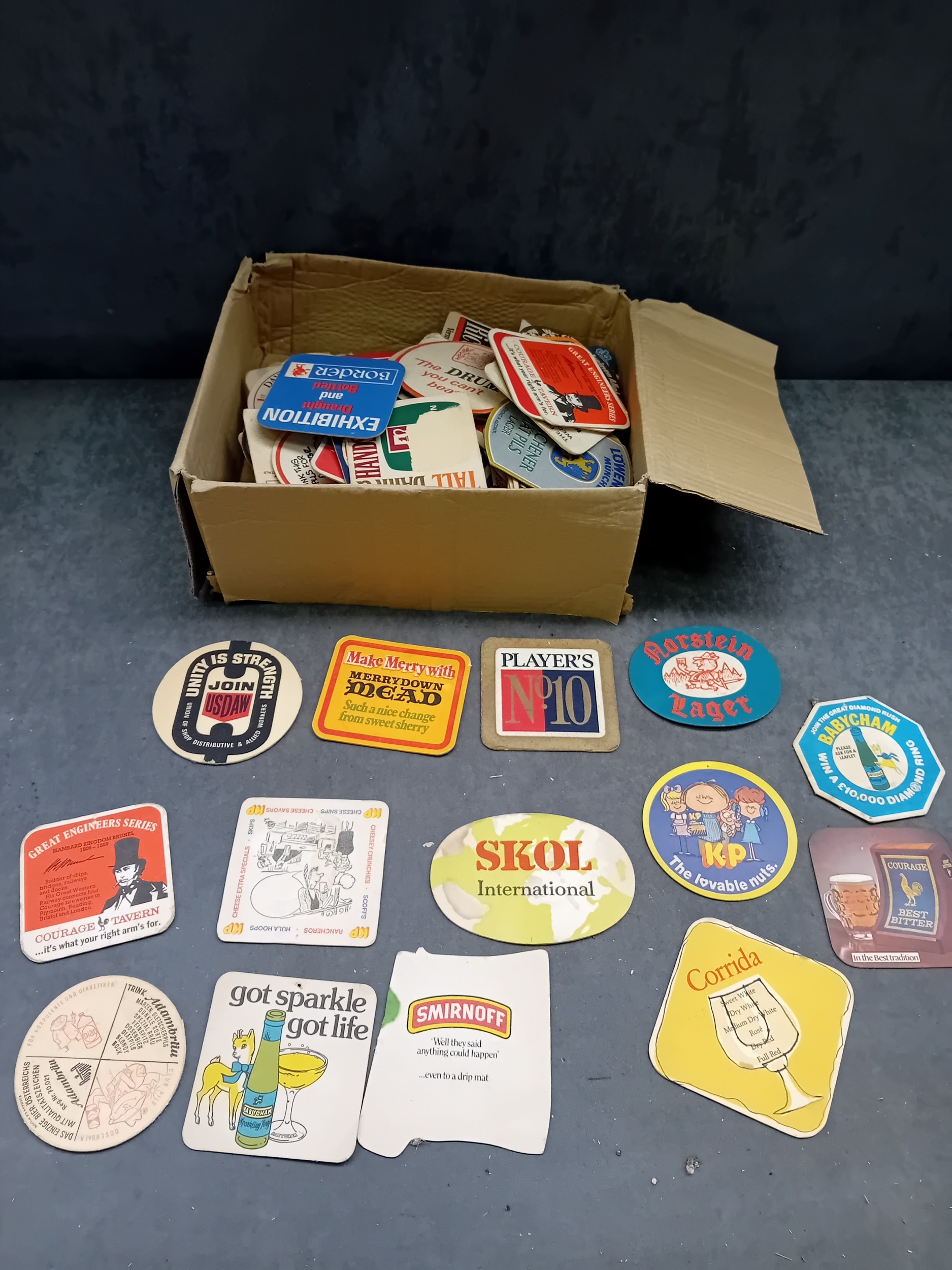 A collection of vintage paperboard beverage coasters or beer mats, dating from the mid-to-late 20th century. The collection comprises approximately two dozen coasters displayed on a surface, with a larger quantity stored in an open corrugated cardboard box. These promotional items predominantly feature brands from breweries, distilleries, and snack companies. Visible markings include 'SKOL International, ' 'Smirnoff, ' 'PLAYER'S N°10,' 'Holsten Lager, ' 'Babycham, ' 'KP' (with 'The lovable nuts.'), 'Courage Best Bitter, ' 'Merrydown MEAD, ' 'Corrida' wines, and 'USDAW' (Shop, Distributive & Allied Workers). One coaster for 'Astra Bräu' bears the German text 'Trink Astra Bräu. Das Original. Das einzig Wahre. Seit 1787.' which translates to 'Drink Astra Beer. The Original. The one and only. Since 1787.'
