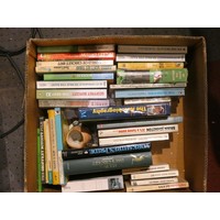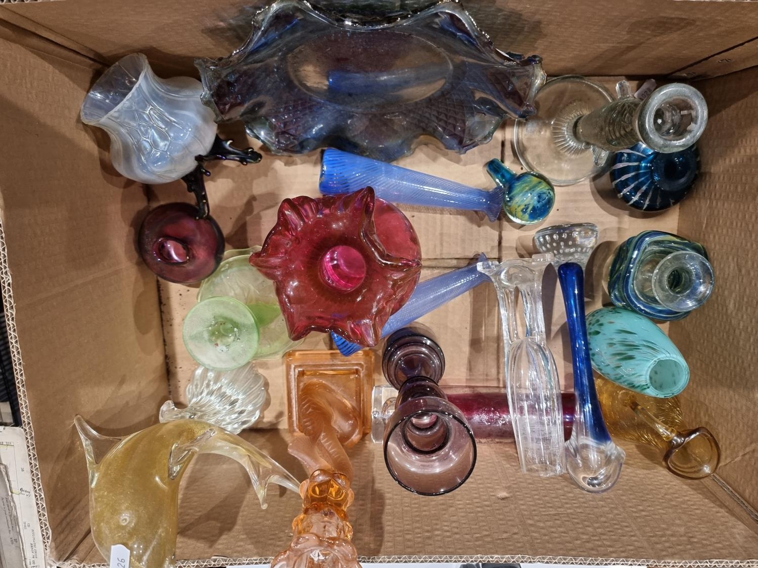 A Loetz style glass vase, two press molded fish candlesticks and other glassware.