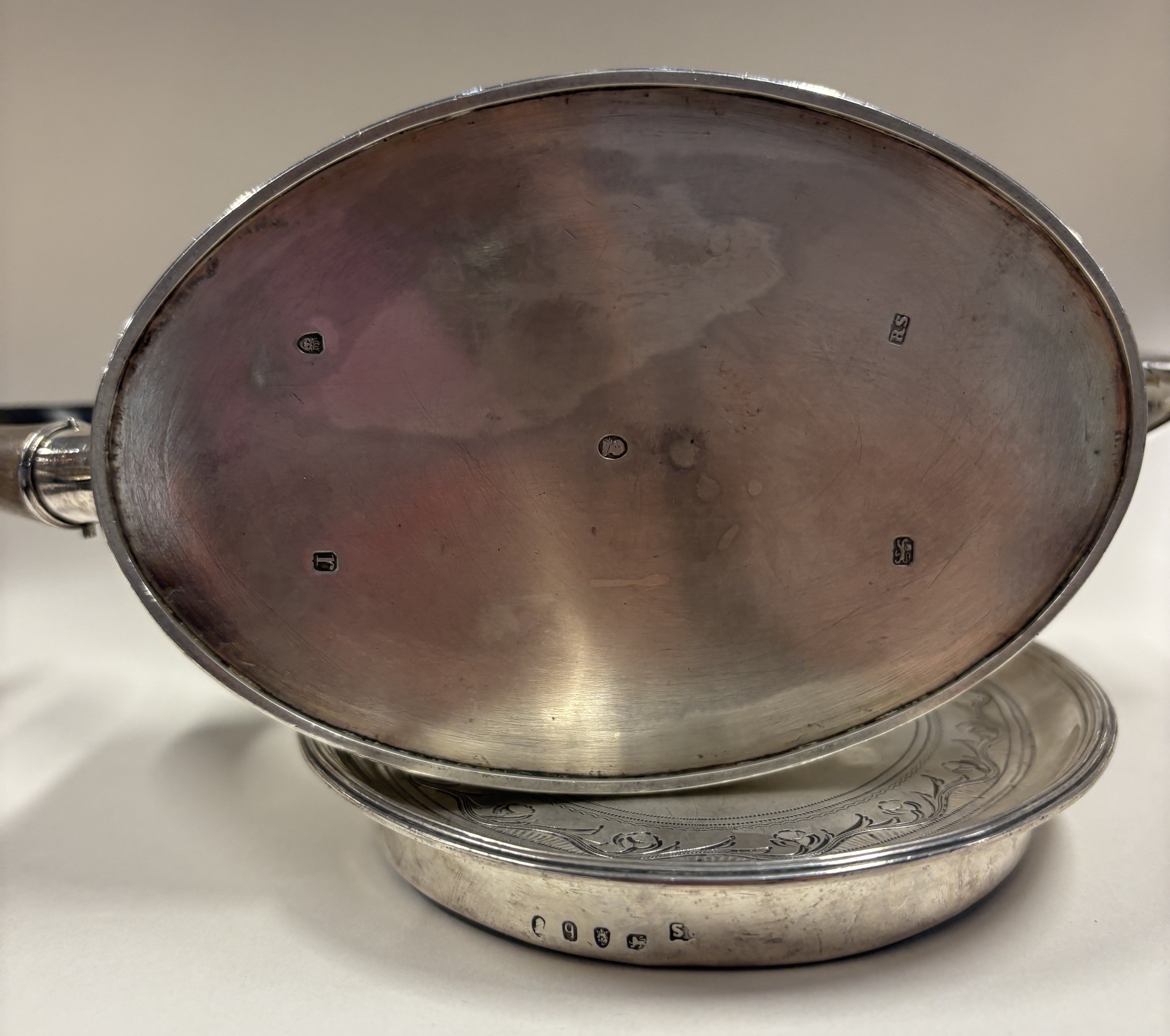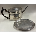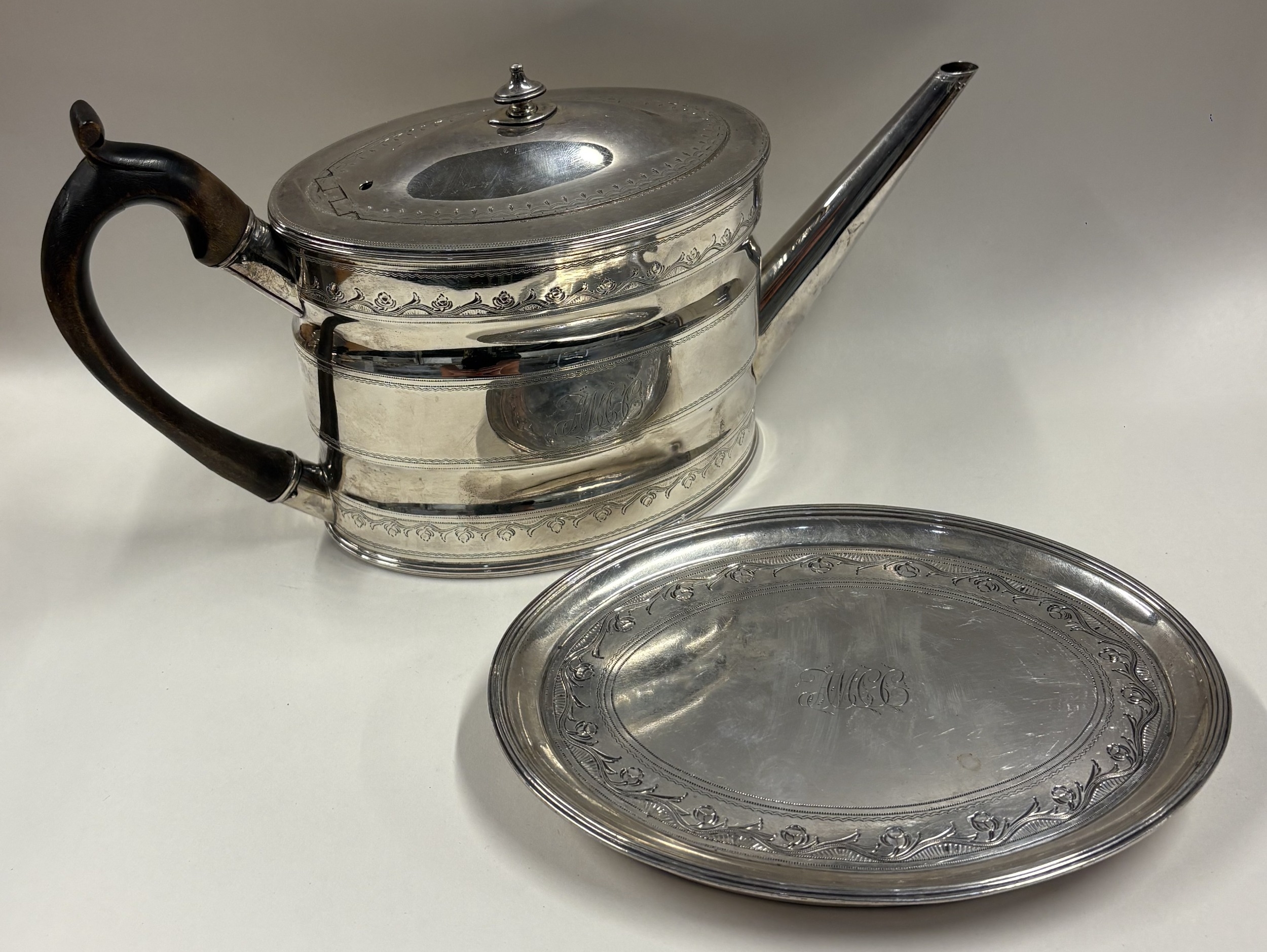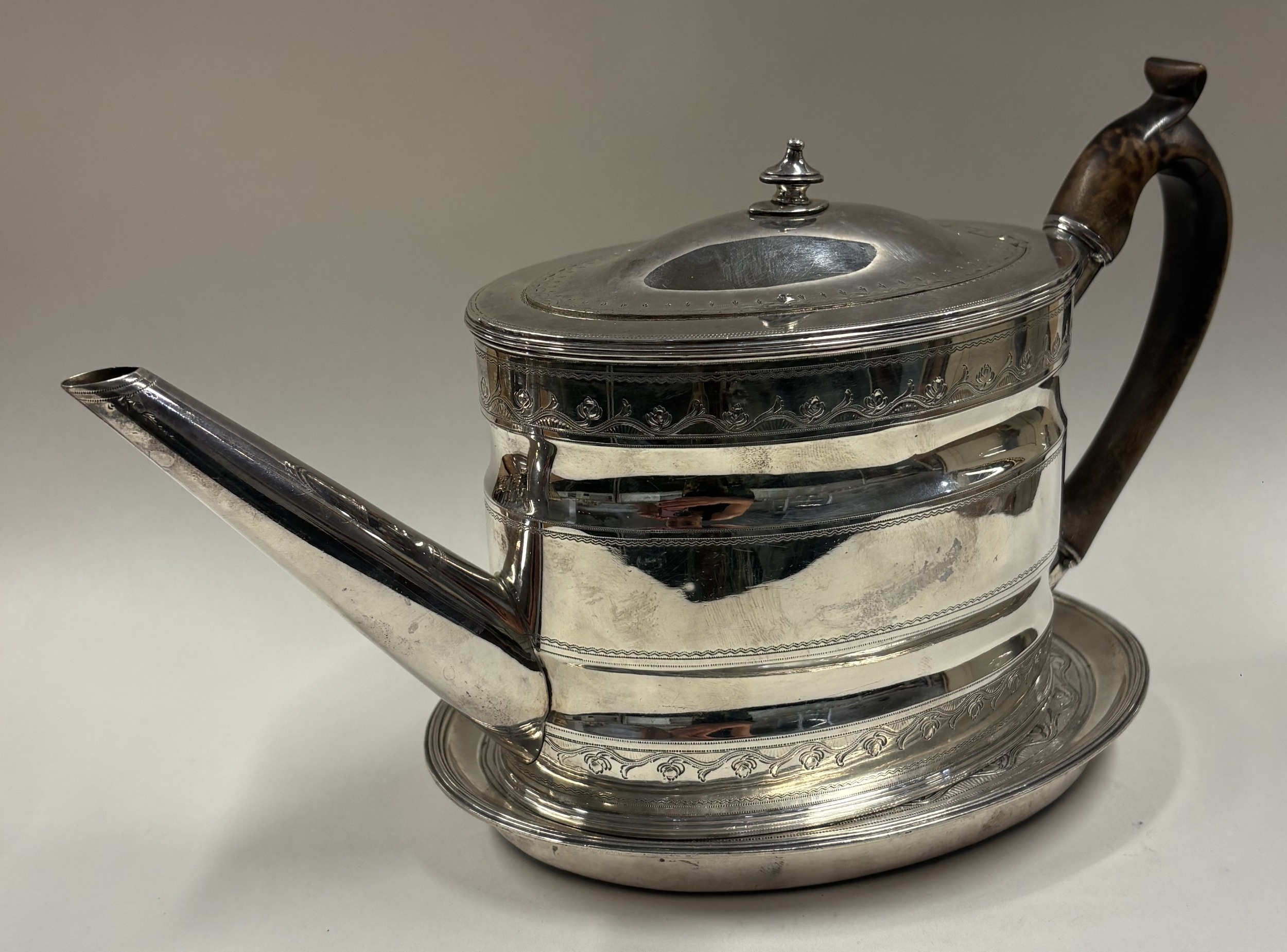 An 18th Century George III silver teapot with bright-cut decoration on stand. London 1791. By Robert Sharp. Approx. 794 grams of gross weight. Est. £600 - £800.