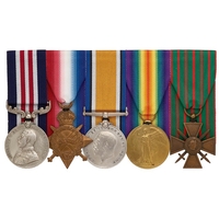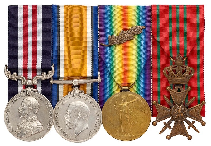 Awarded to 201786 PTE W RICHARDS LEIC R. Comprising: Military Medal, 201786 PTE W RICHARDS 8/LEIC R, British War Medal, Victory Medal, MID Oak Leaf, PTE LEIC R, Belgium Croix de Guerre. Mounted for display, accompanied by a quantity of research. Military Medal London Gazette 28th March 1919 MID London Gazette 18th December 1917 Belgium Croix de Guerre London Gazette 15th April 1918 Private William Richards came from Begrave Leicester and enlisted on the 7th December 1915. He landed in France on the 12th July 1916. He was promoted to the rank of Lance Corporal, only to be broken for not following the order of a superior Officer. He is noted as suffering heart trouble after being buried by enemy shell fire in October 1918.