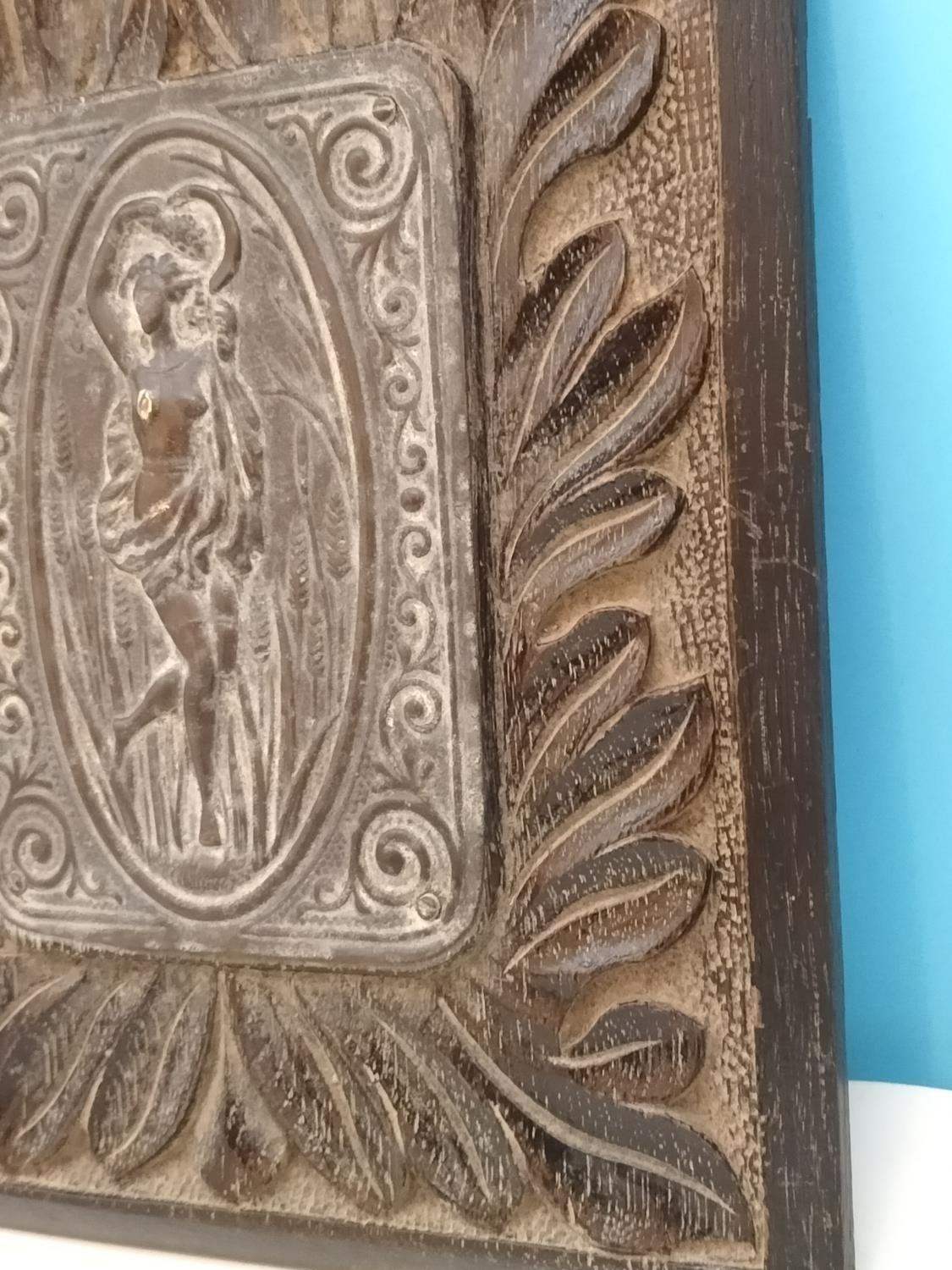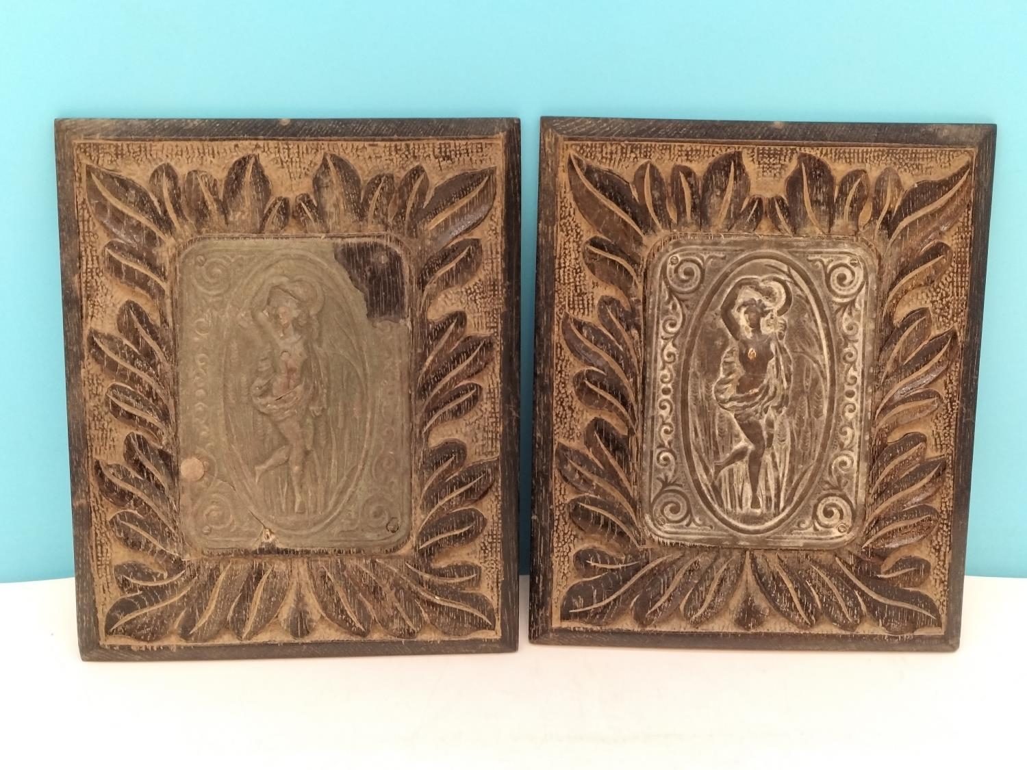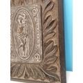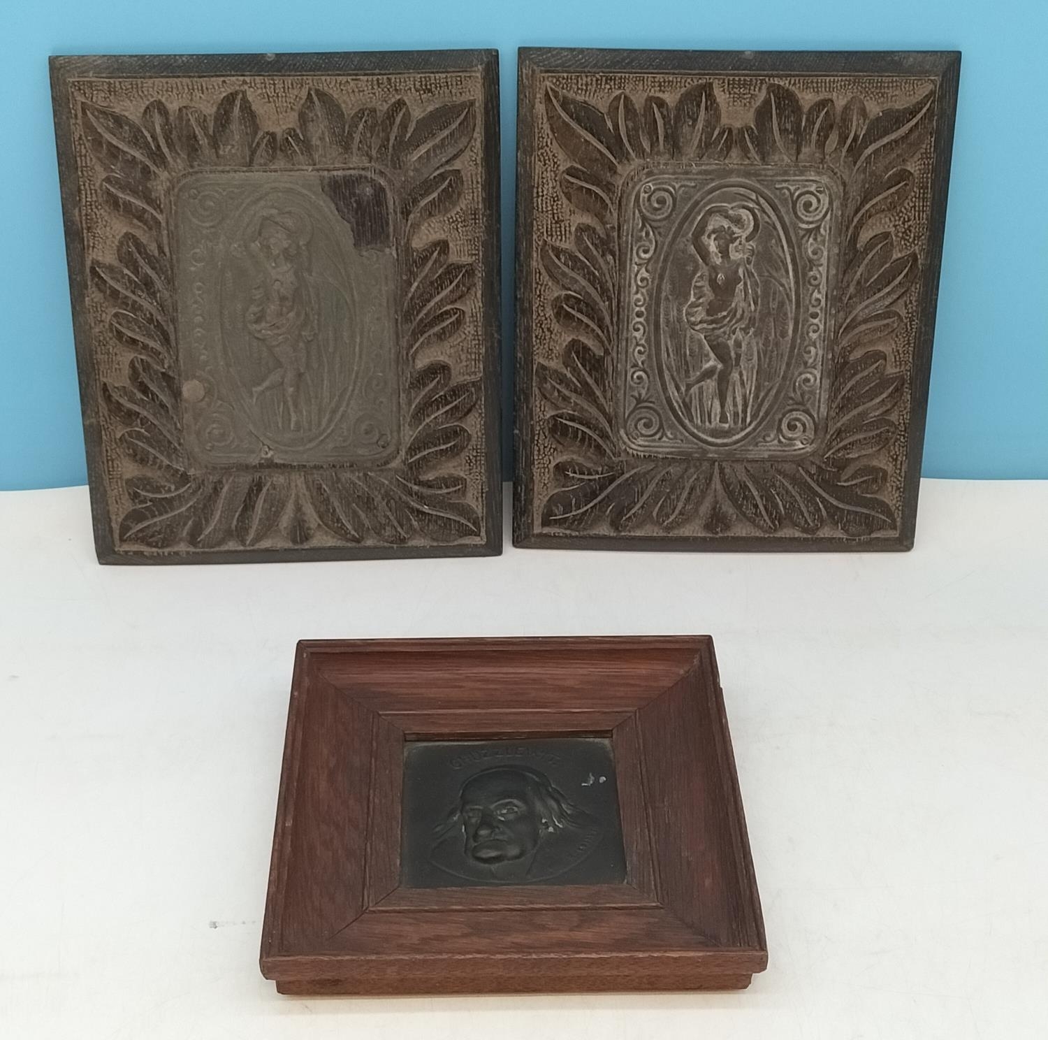 2 x Carved Wooden Framed Plaques with Metal Panel of the Goddess Diana (20cm x 24cm) plus a Wood Framed Metal Panel of Martin Chuzzlewit (18cm x 18cm)