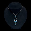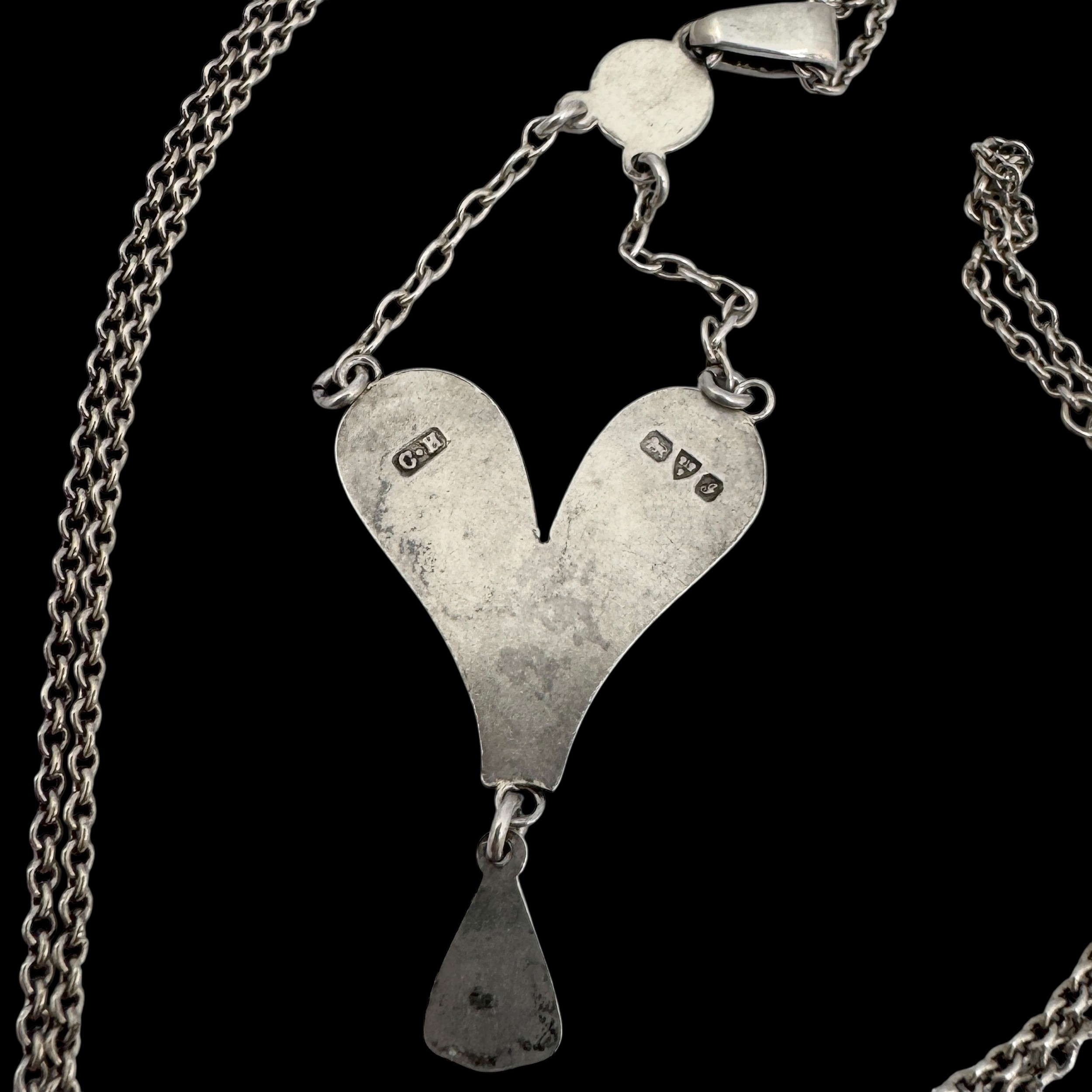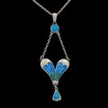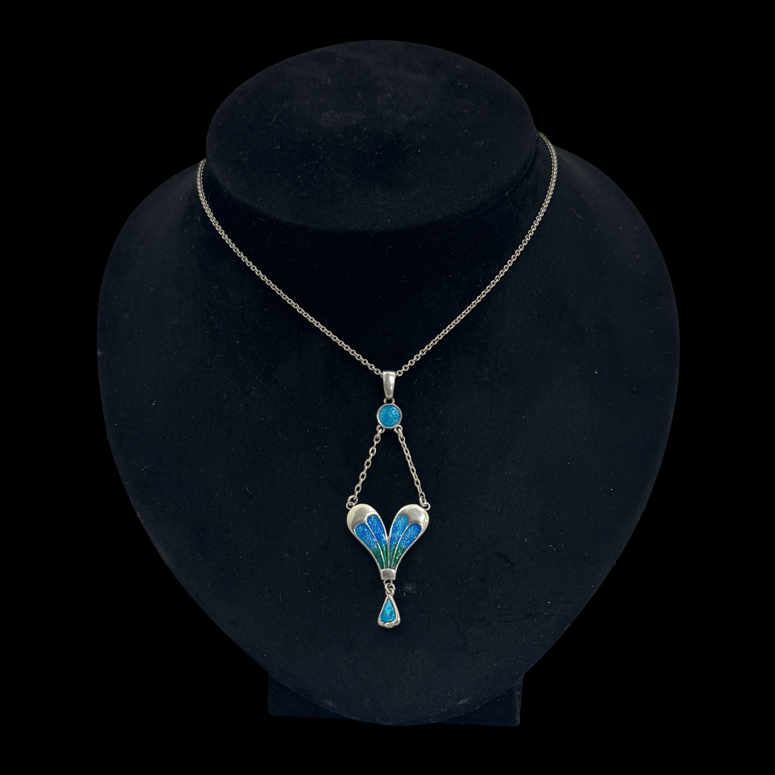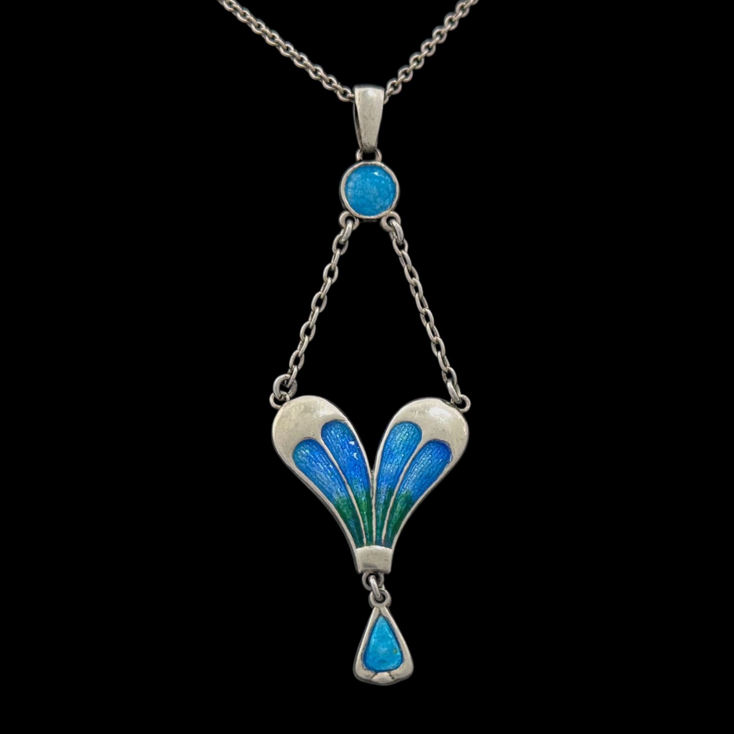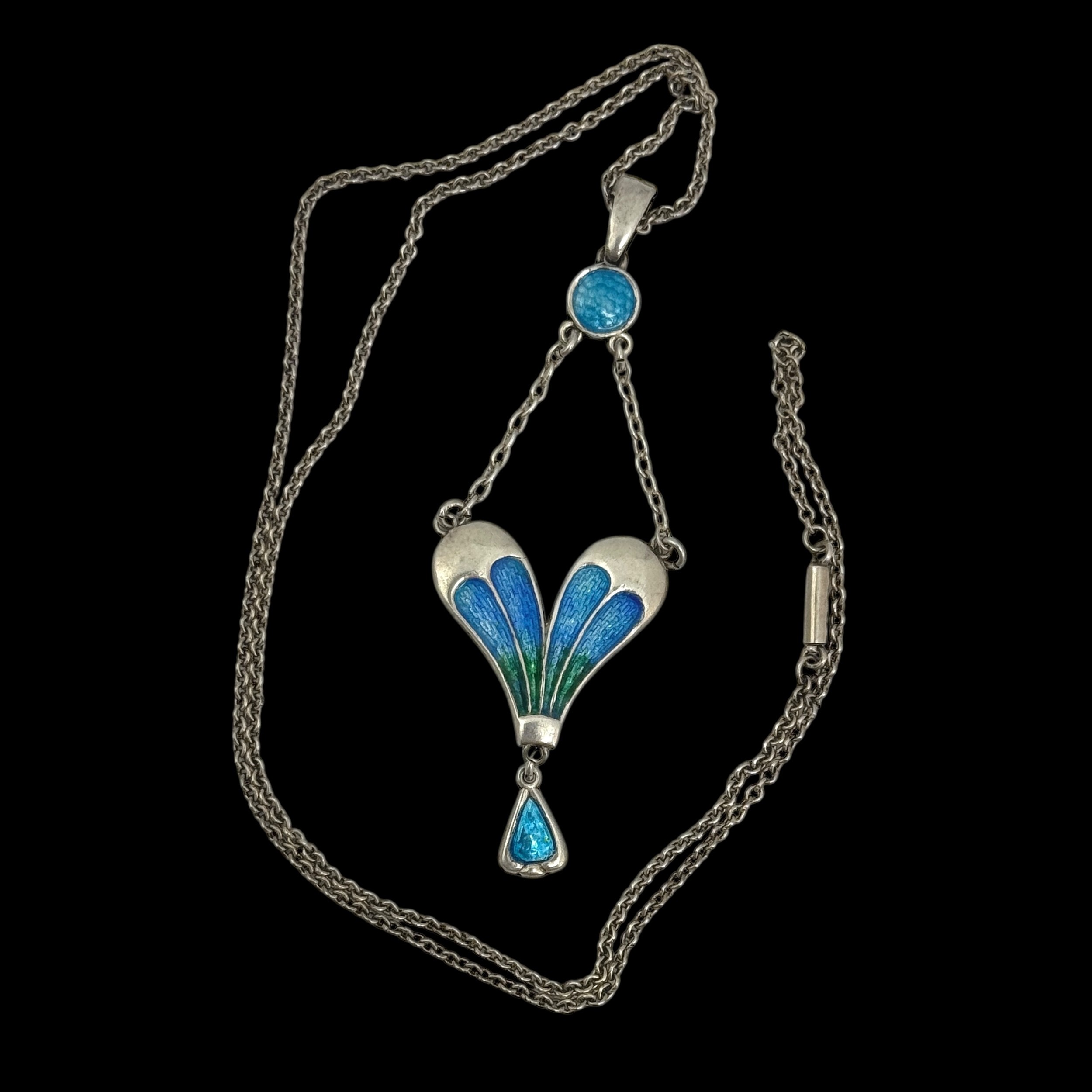 A Charles Horner Arts & Crafts silver and enamel pendant necklace, decorated with turquoise blue suspender below the bail supporting a heart-shaped pendant with blue and green enamels and bright turquoise enamel drop, with 'CH' maker's mark and Chester hallmarks for 1906, 44cm total chain length, 6.7cm pendant drop, 6.3g total weight. (LDC13993)
