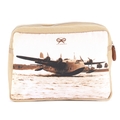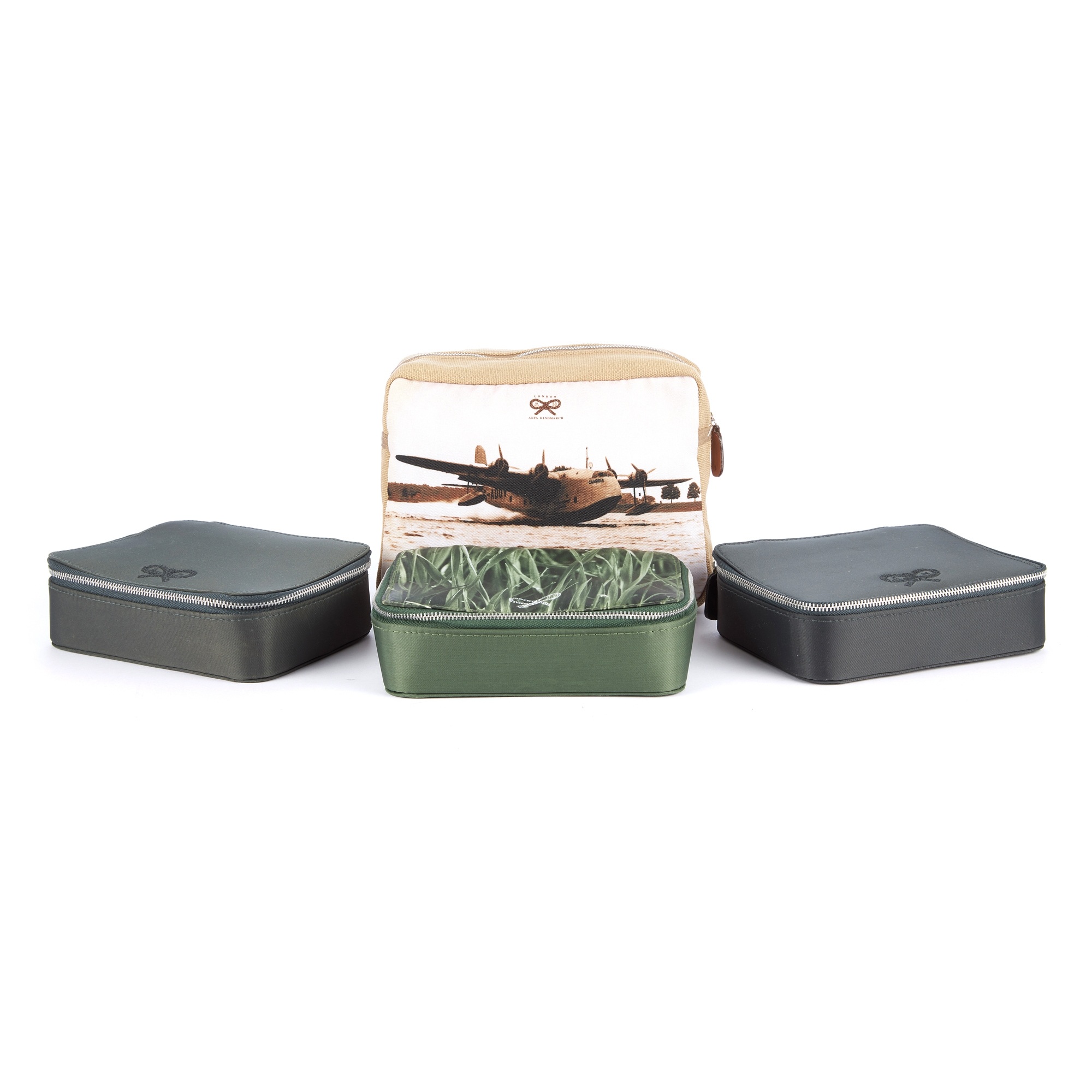 Anya Hindmarch, four cosmetic pouches, to include a beige canvas example picturing Imperial Airways Short Empire flying boat Cambria, together with three structured nylon examples with wraparound zip fastenings, lengths measure 18 and 21cm