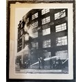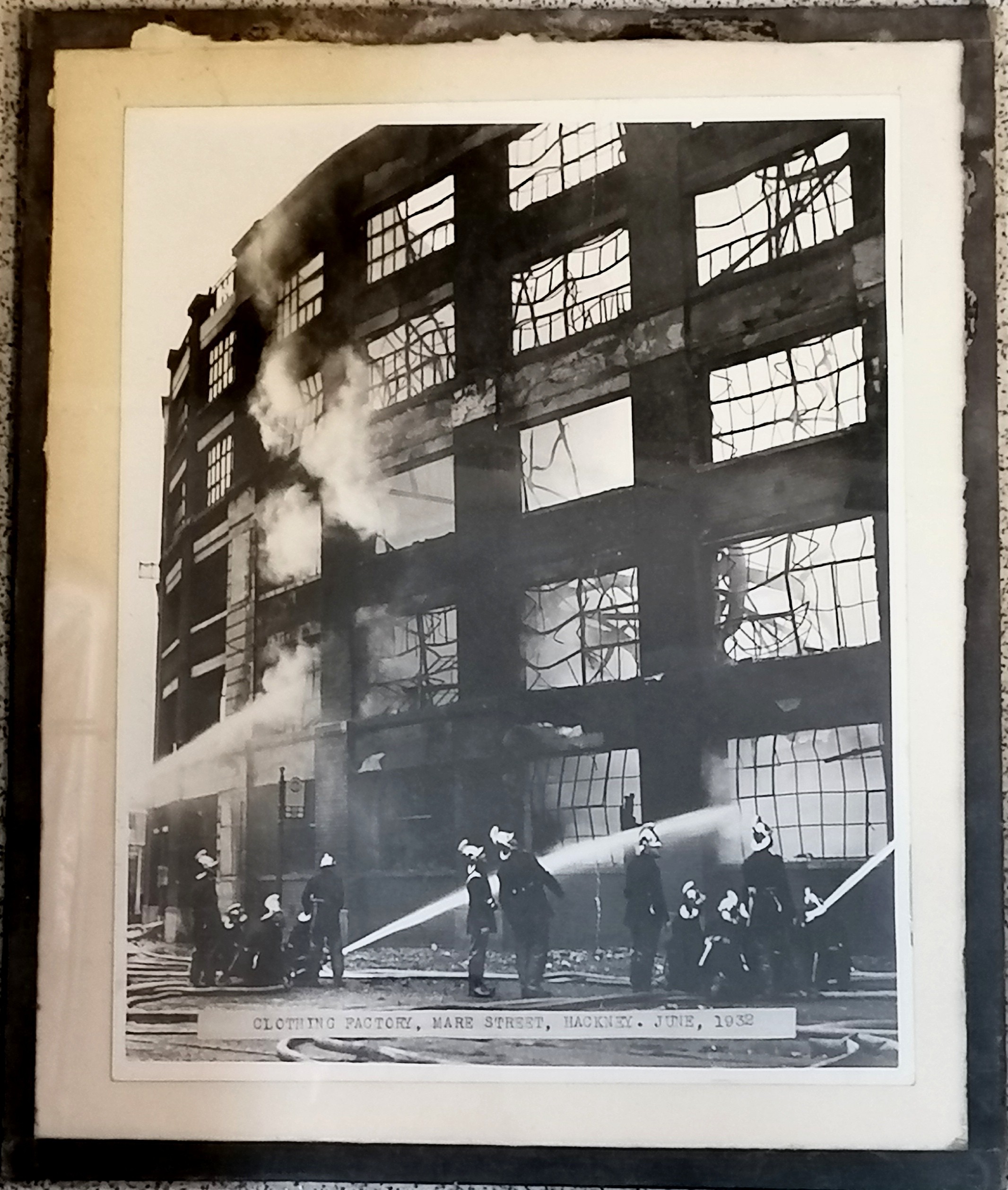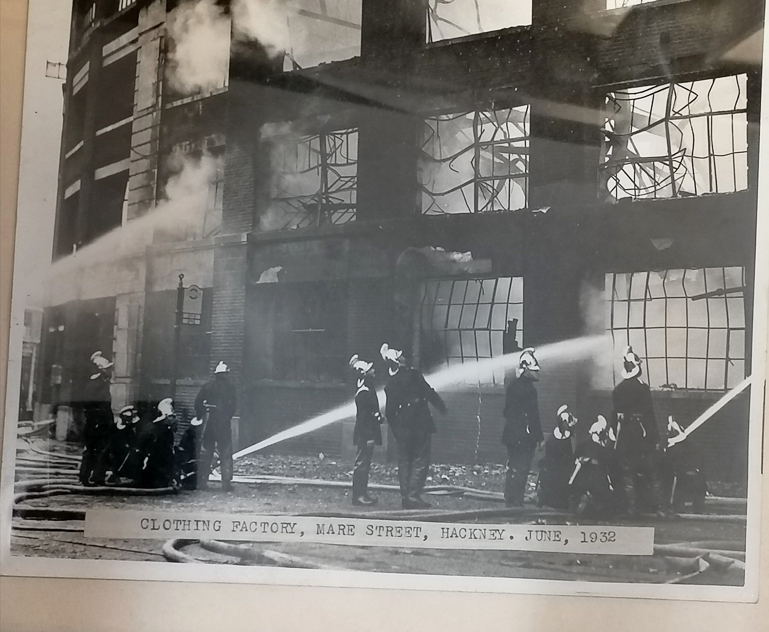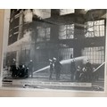 Framed C1932 photograph firefighters in Hackney putting out a blaze at a clothing factory in Mare Street. 25cm x 30cm
