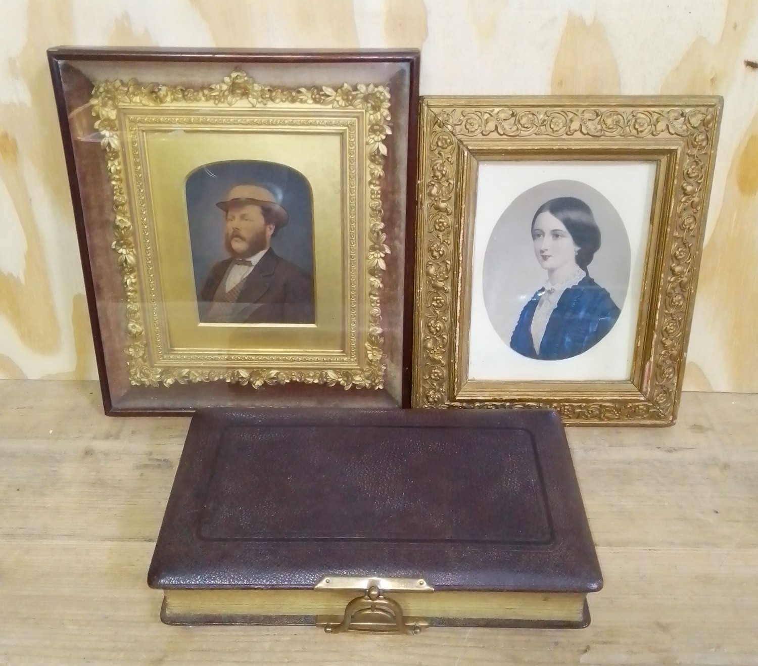 A Victorian photograph album, a framed portrait depicting a gentleman and another.