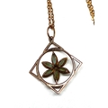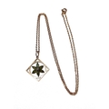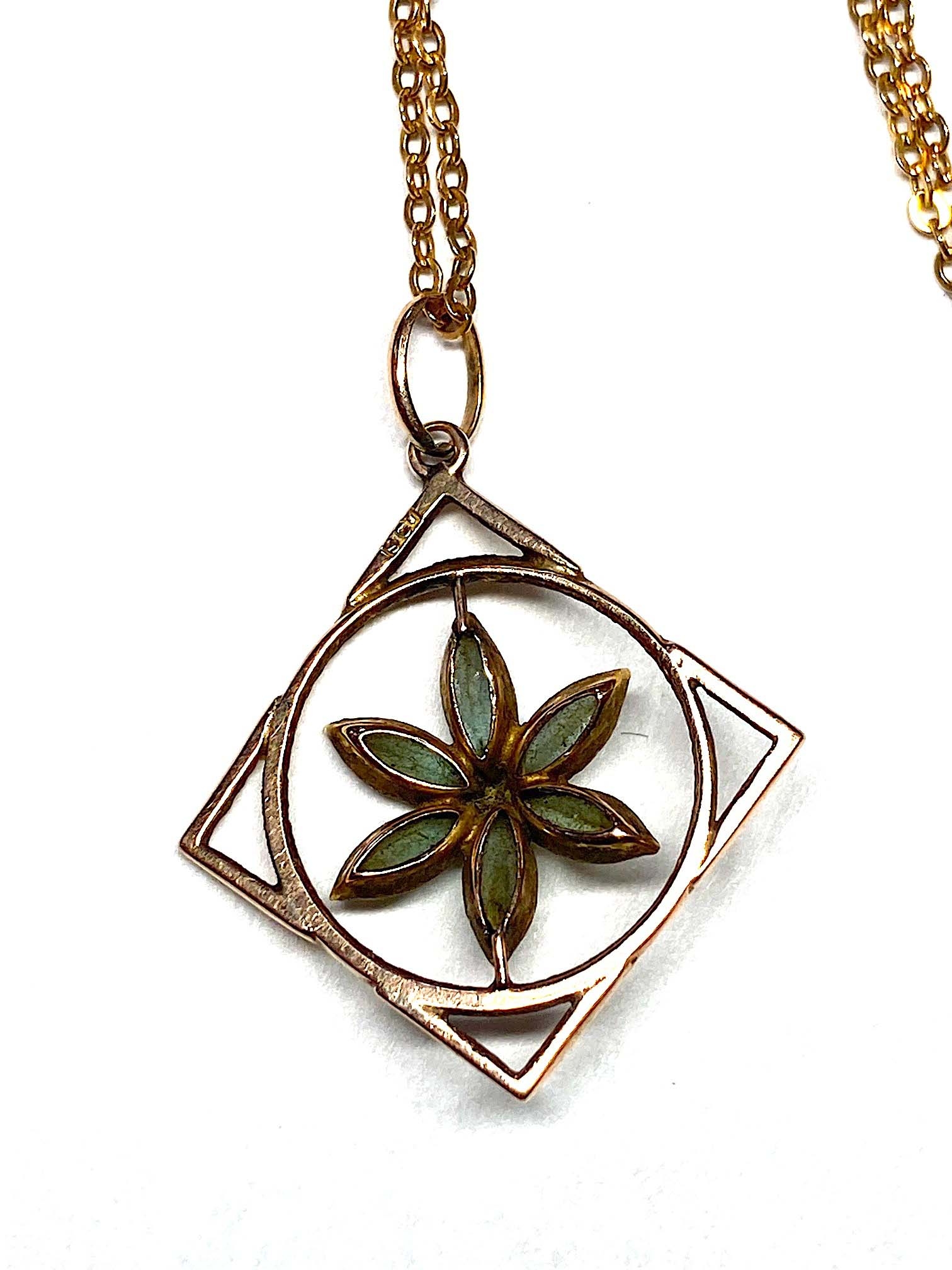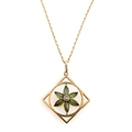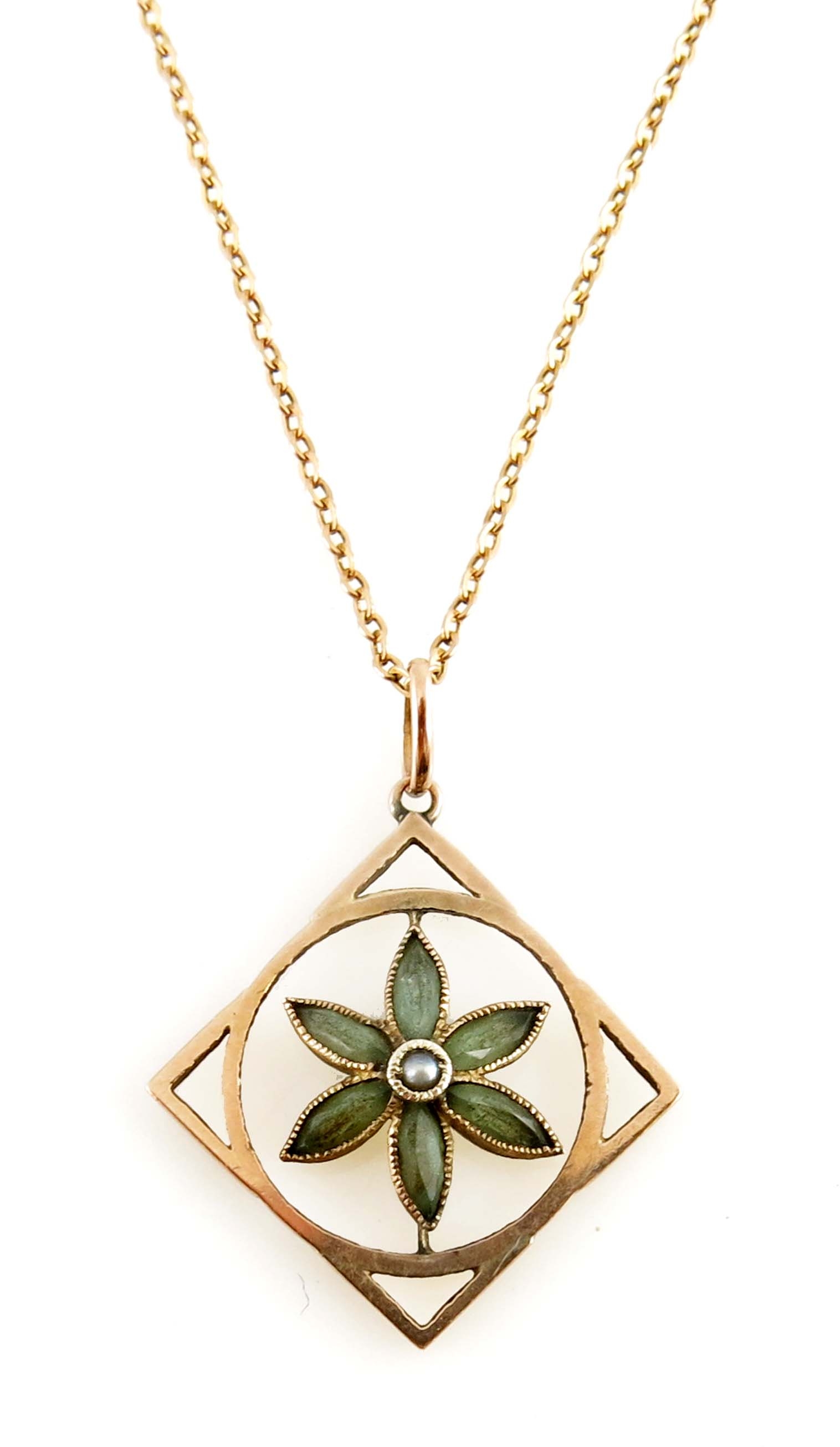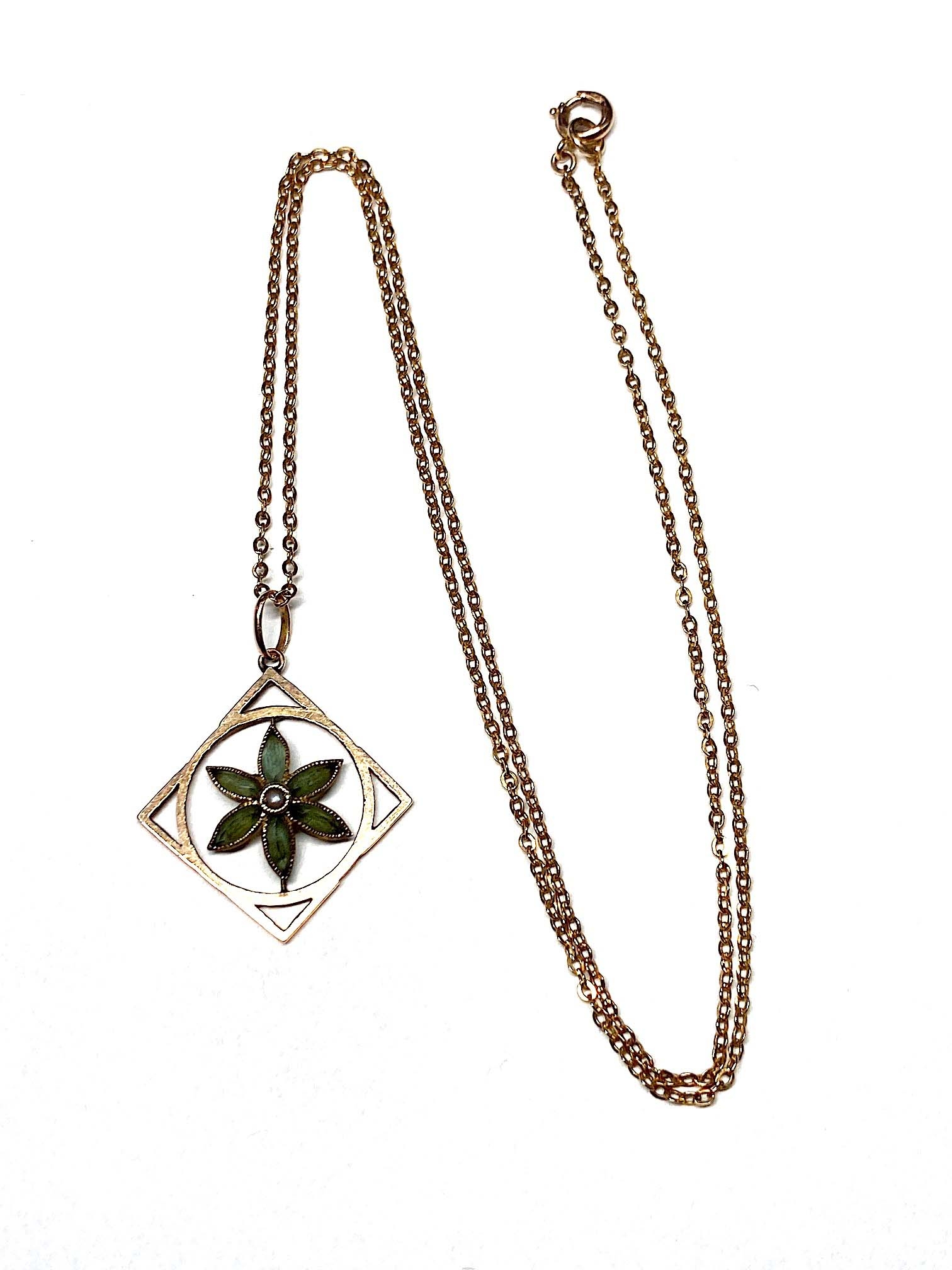 An early 20th century peridot and split pearl floral pendant, with 9ct gold trace-link chain, length of pendant 2.8cm, length of chain 44cm, 2.4g
