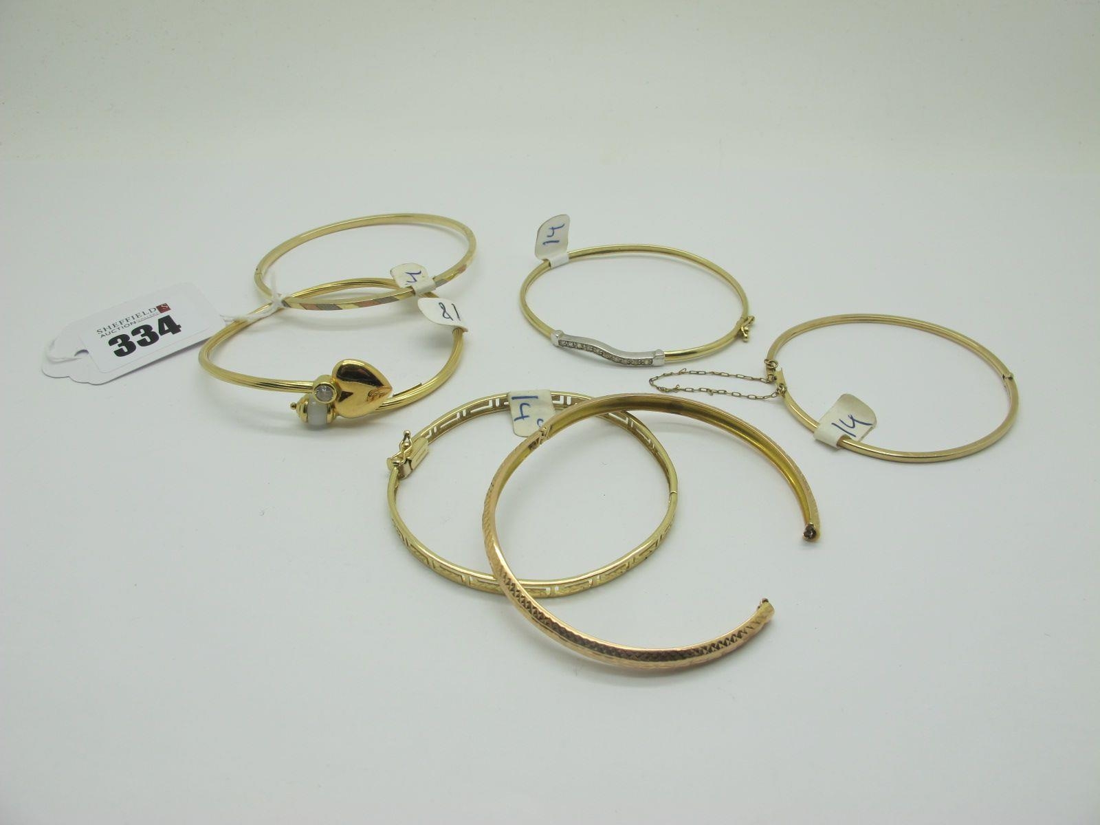 A Modern Bangle, of crossover design, with heart and bead detail, stamped "750"; Together with Five Further Bangles, including "585" etc (damages). (6)
