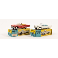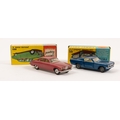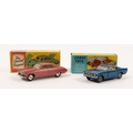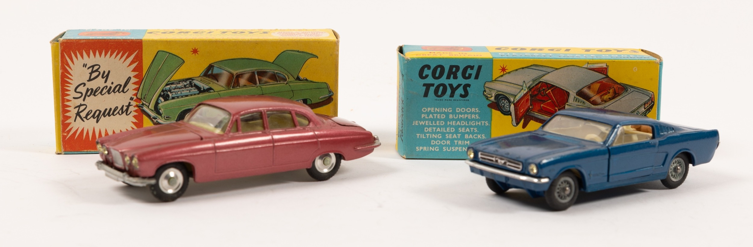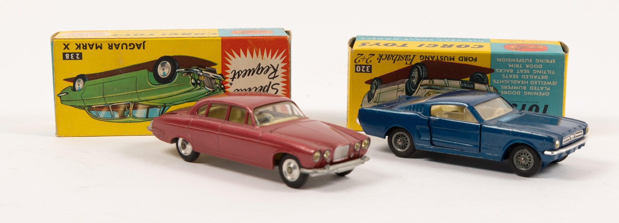 2 Corgi Toys. A Jaguar Mk X (238) in metallic cerise with yellow interior. Plus a Ford Mustang Fastback 2+2 (320) in metallic blue with cream interior, example with spoked wheels. Both boxed, minor wear wear only. Vehicles GC-VGC, minor chipping to Mustang. £70-90