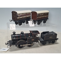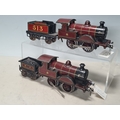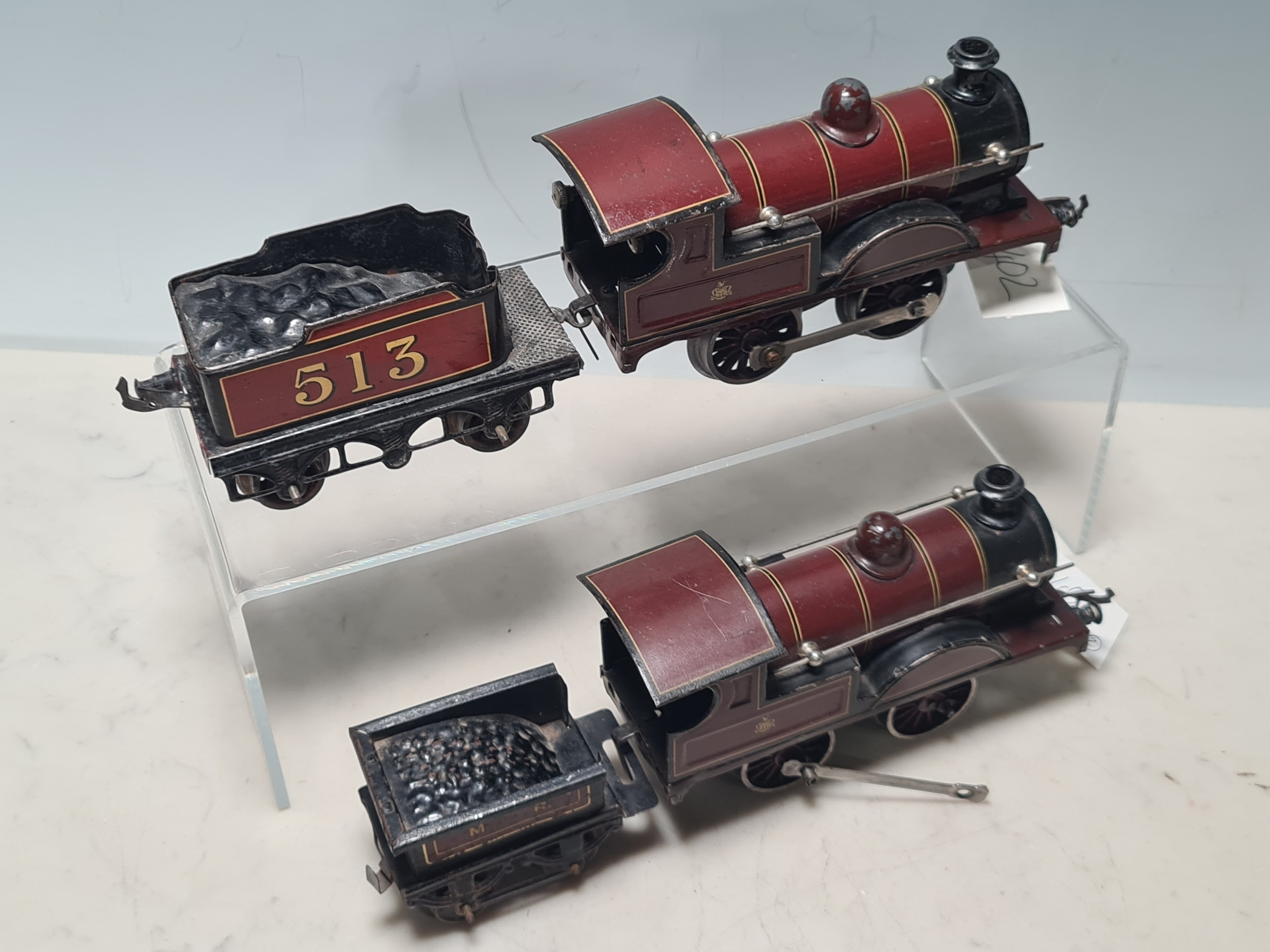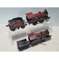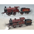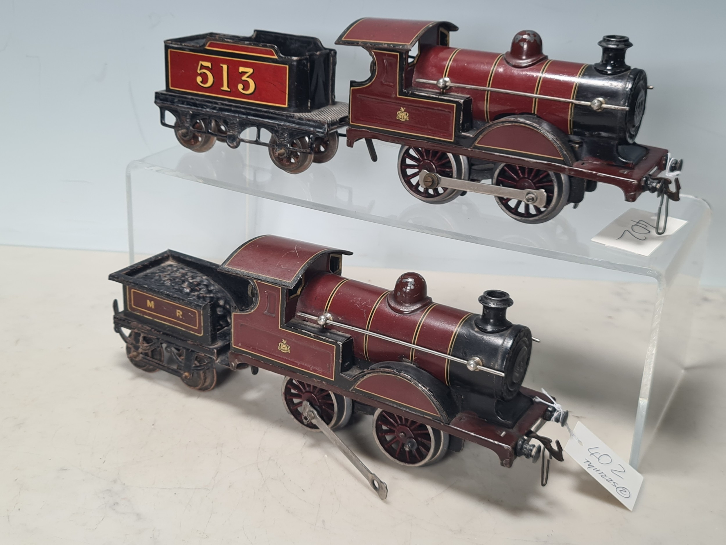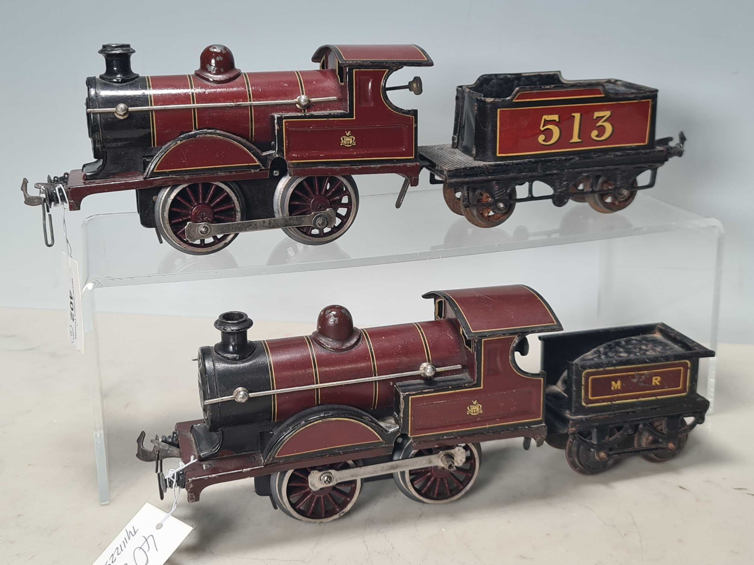 Two Bing 0 gauge clockwork Midland Region maroon livery 0-4-0 Locomotives with associated tenders, one with loose coupling rod