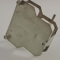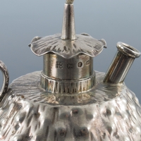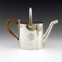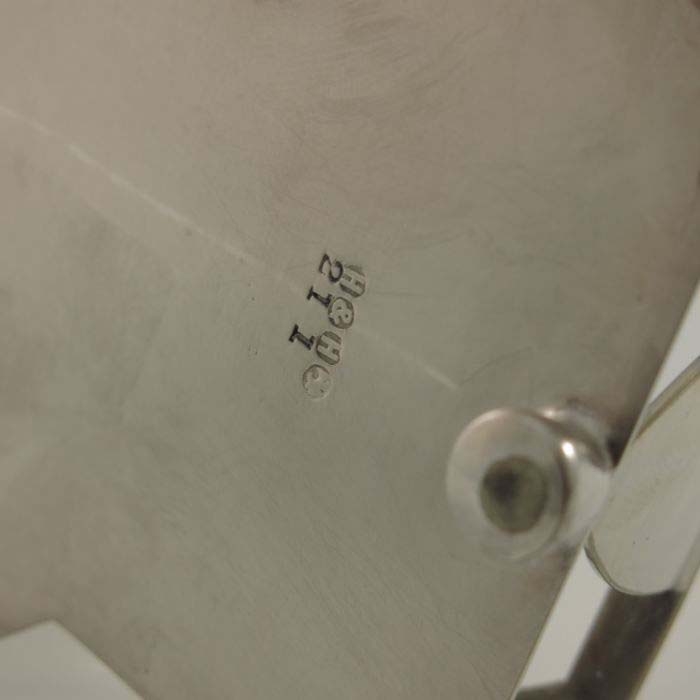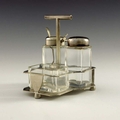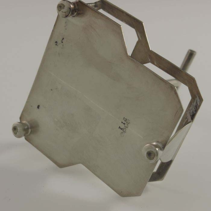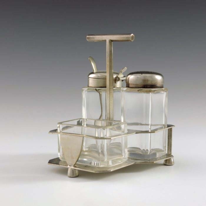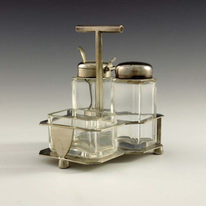 Christopher Dresser for Hukin and Heath, a silver plated and cut glass cruet stand, circa 1880, the plain cuboid mustard, salt and pepper pots within an angled fret cut cage on squat conical feet, supported on a hexagonal section T bar handle, 12cm high