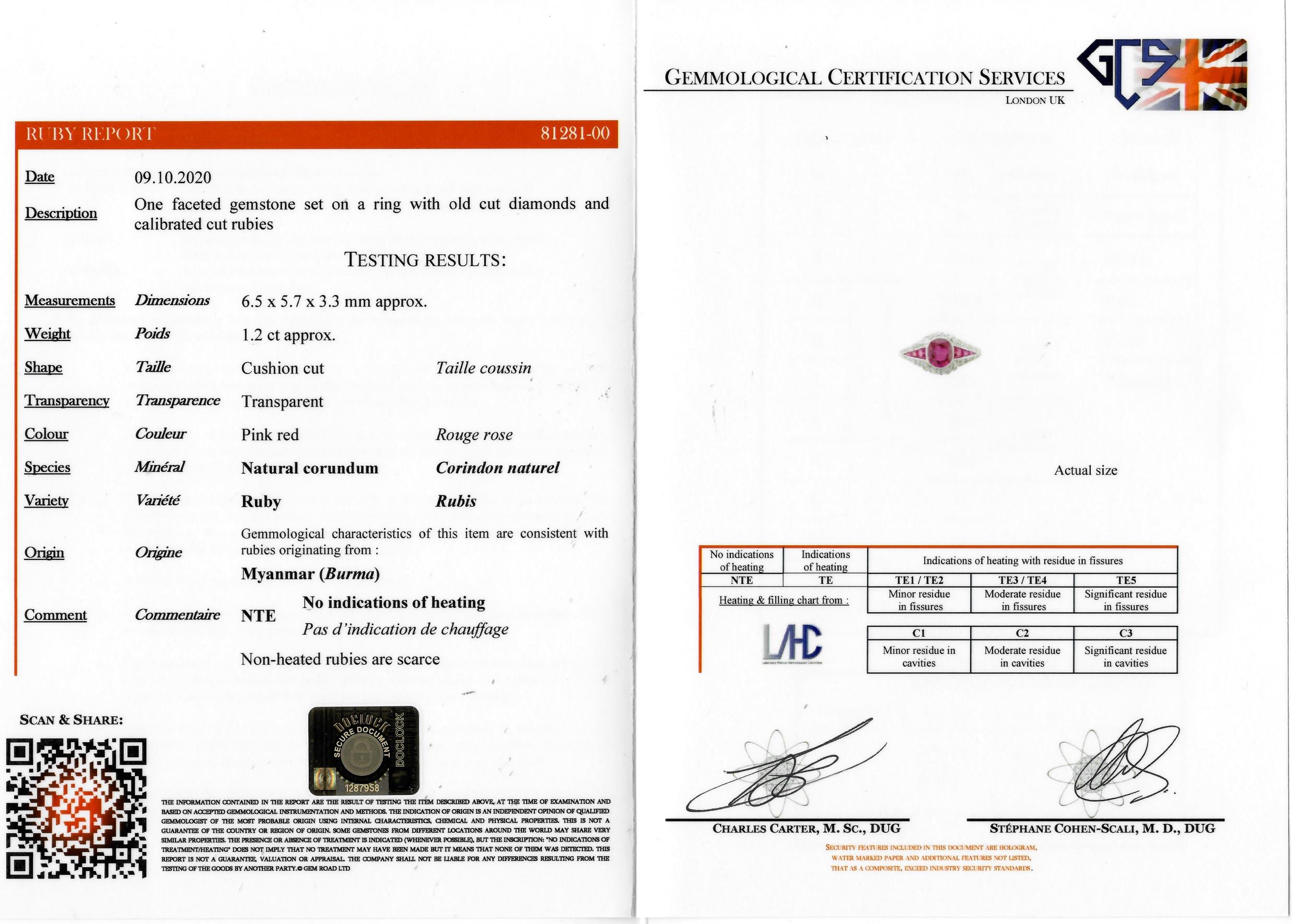 IMPORTANT ART-DECO RUBY AND DIAMOND PLATINUM RING, set with a central ruby of approx. 1.20 ct. flanked with rubies and diamonds. Size M. 3.3 grams. Accompanied by GCS London report No. 81281-00 stating that the 1.20 ct. ruby is natural, Burma origin with no indications of heating.