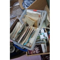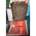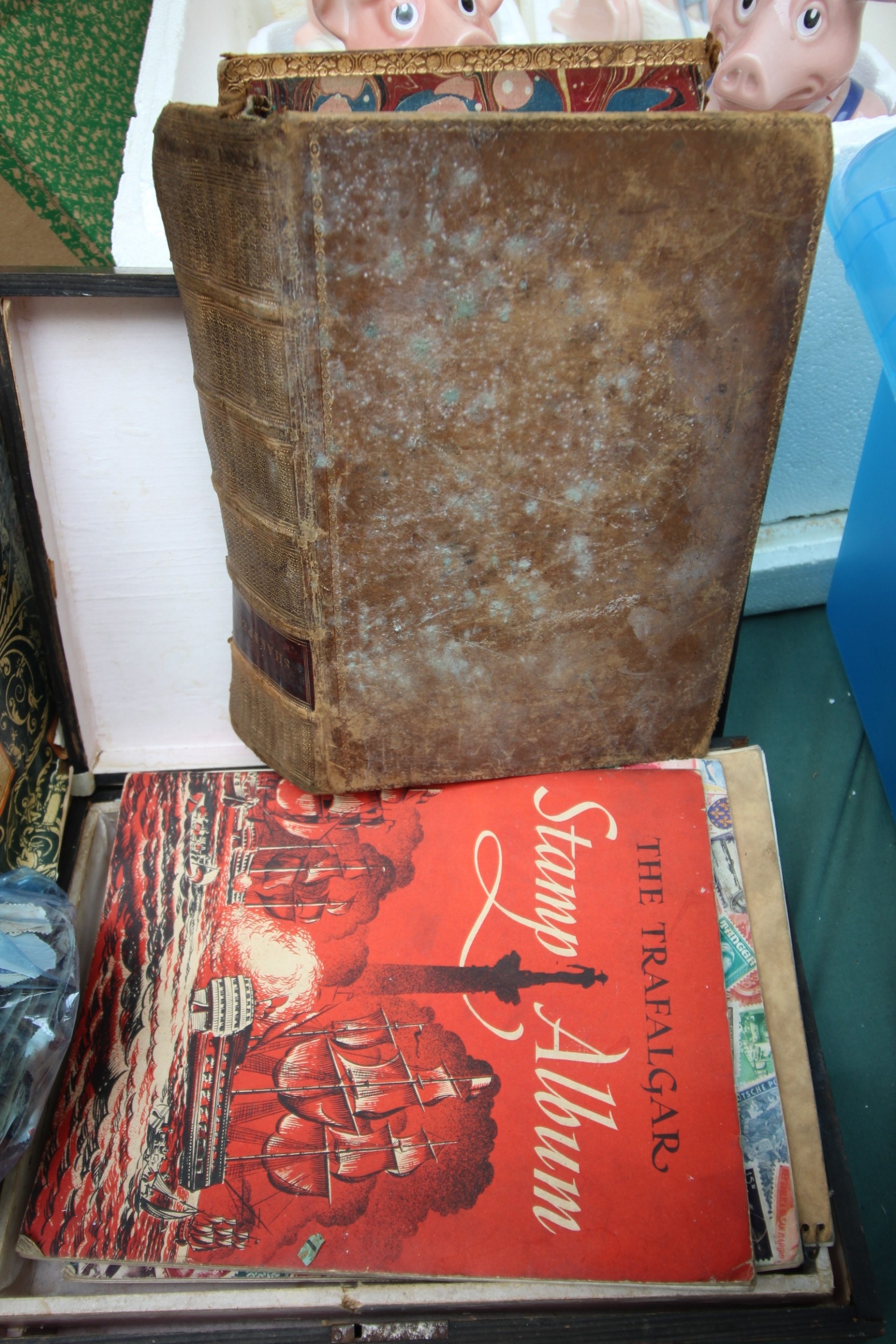 Box containing variety of postage stamps and albums together with old leather Shakespeare book