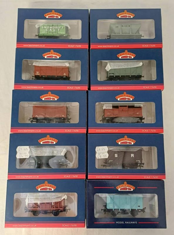 SELECTION OF BACHMANN OO GAUGE ROLLING STOCK INCLUDING 33-182 10 TON SALT WAGON 'SNOWDRIFT SALT, 37-502A - 24 TON ORE WAGON B.R. GREY, 37-778B - 12 TON MOGO VAN GWR DARK GREY AND OTHERS. ALL BOXED